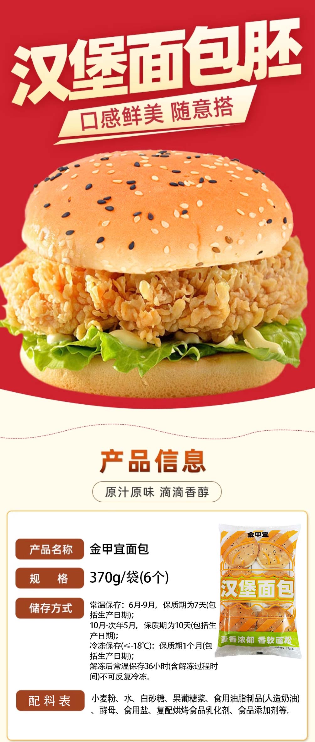 26D【会员专享】金甲宜汉堡面包 370g/袋(6个) 24袋/件