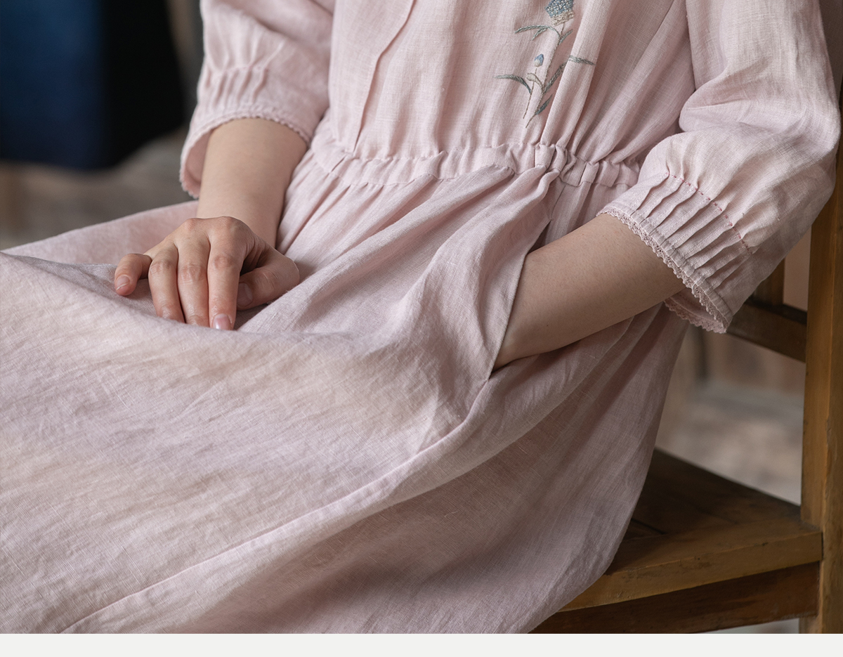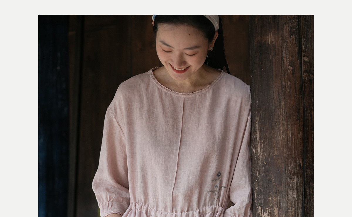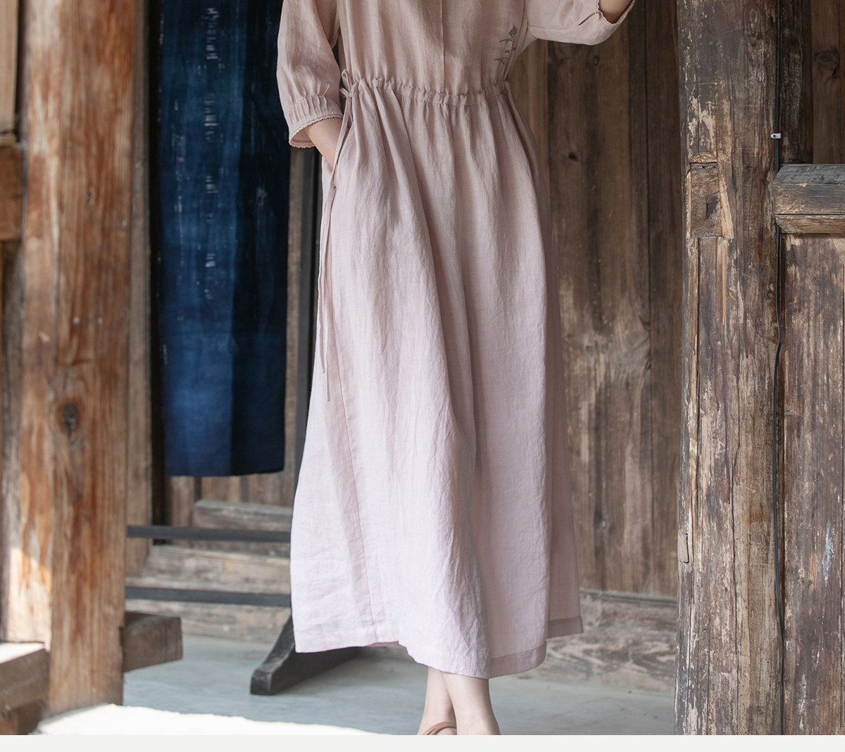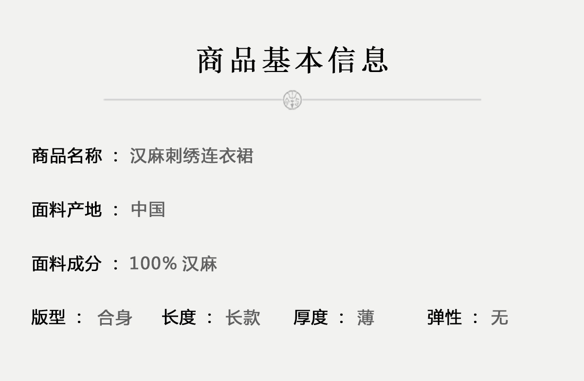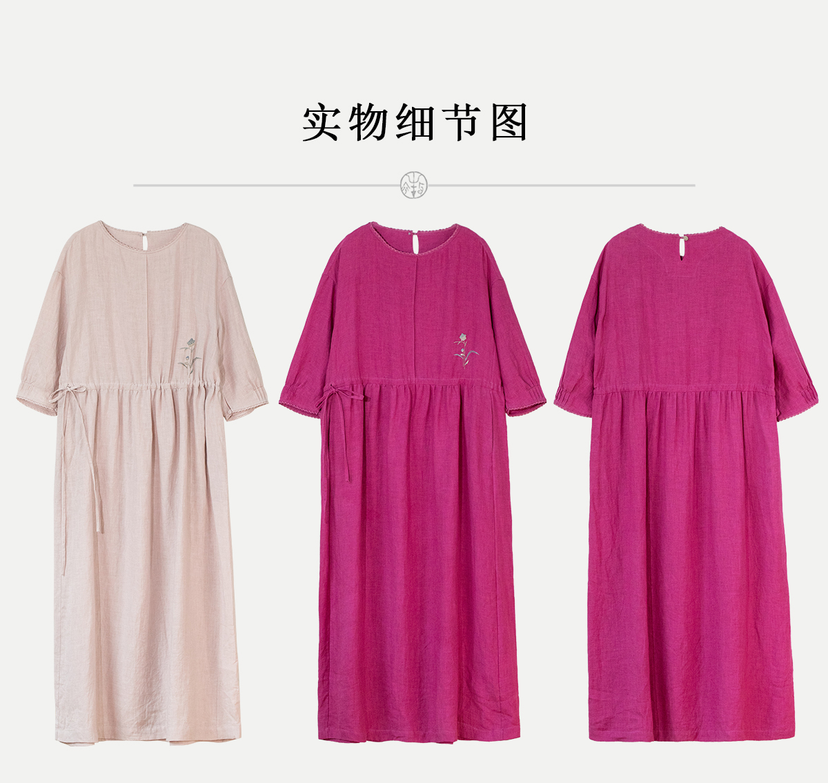牧衣游原创 汉麻手工刺绣连衣裙宽松轻薄柔软抽绳圆领长裙 无极