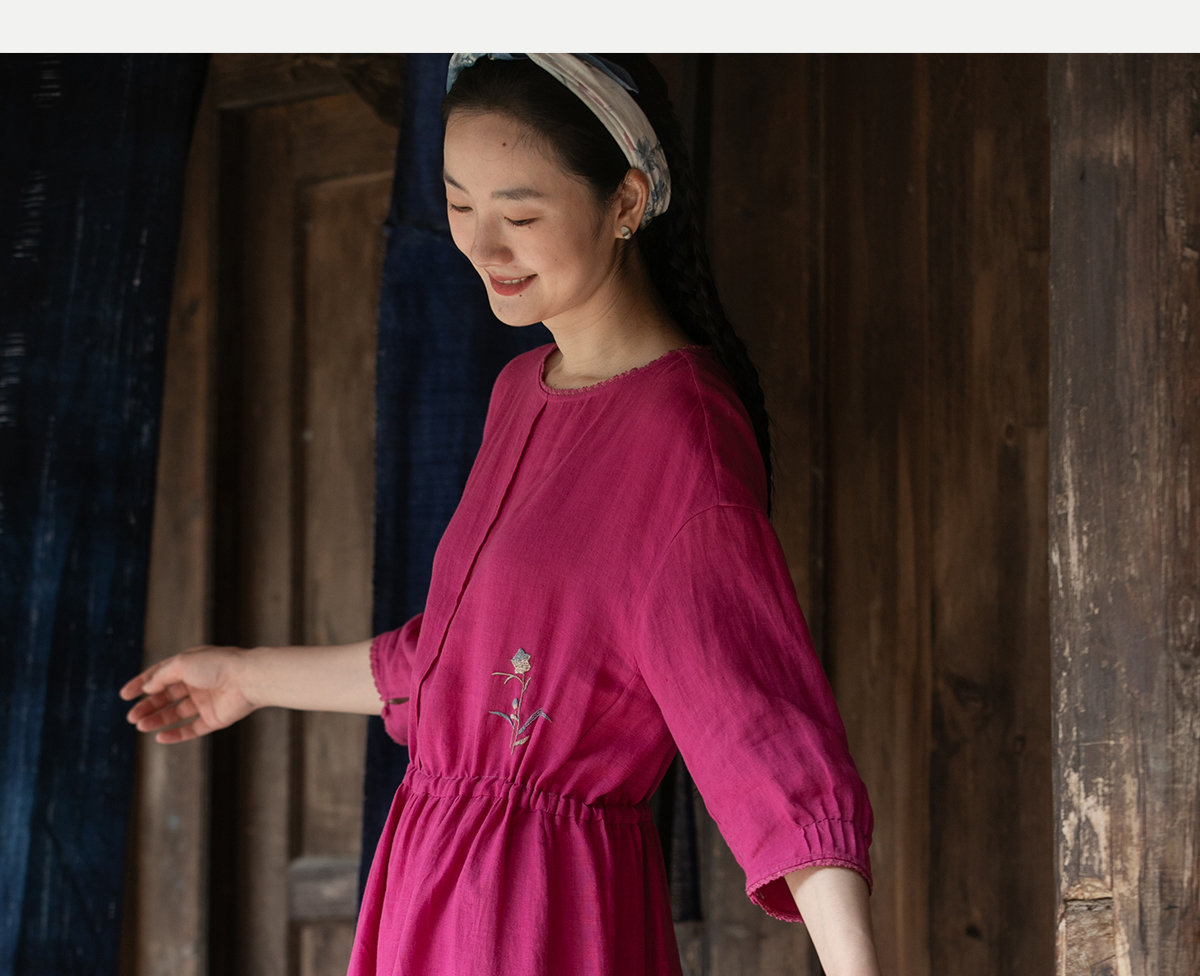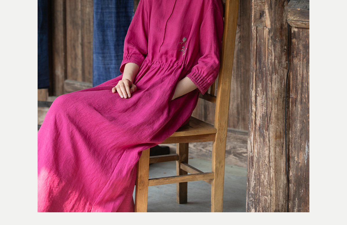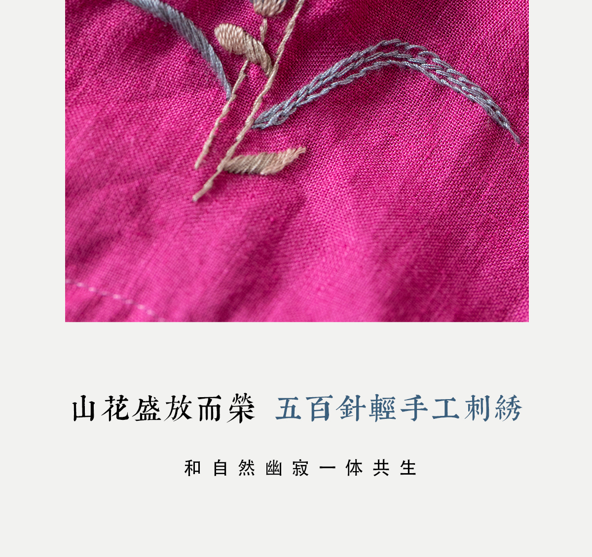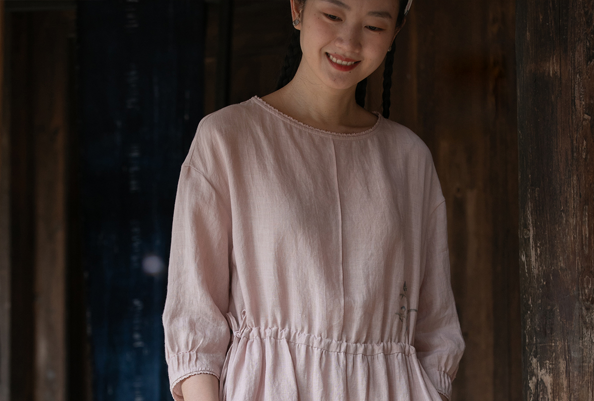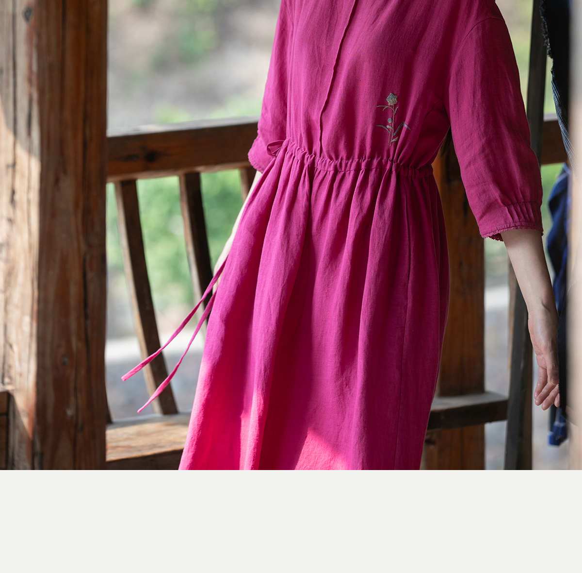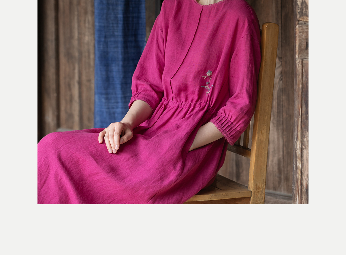 牧衣游原创 汉麻手工刺绣连衣裙宽松轻薄柔软抽绳圆领长裙 无极