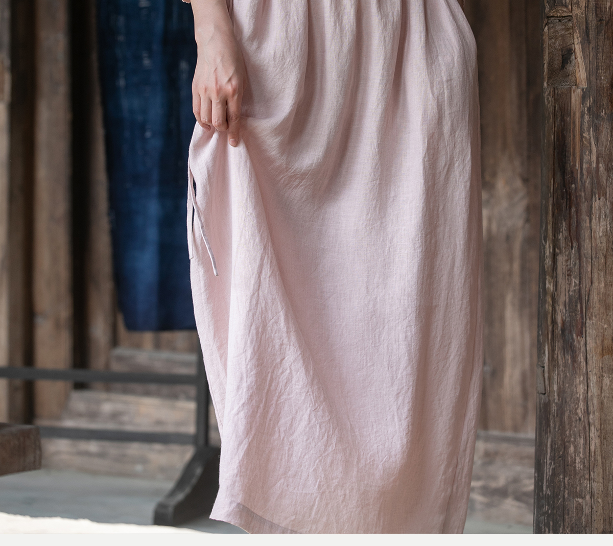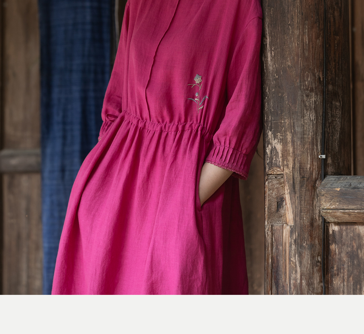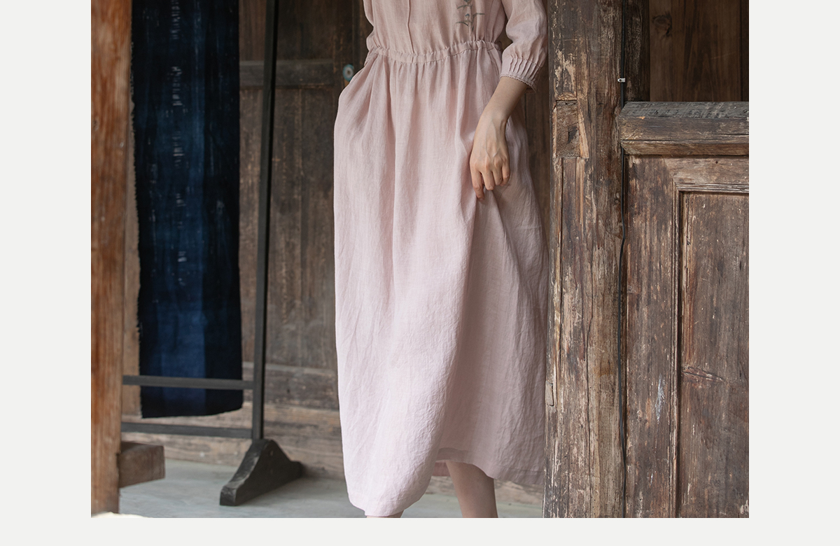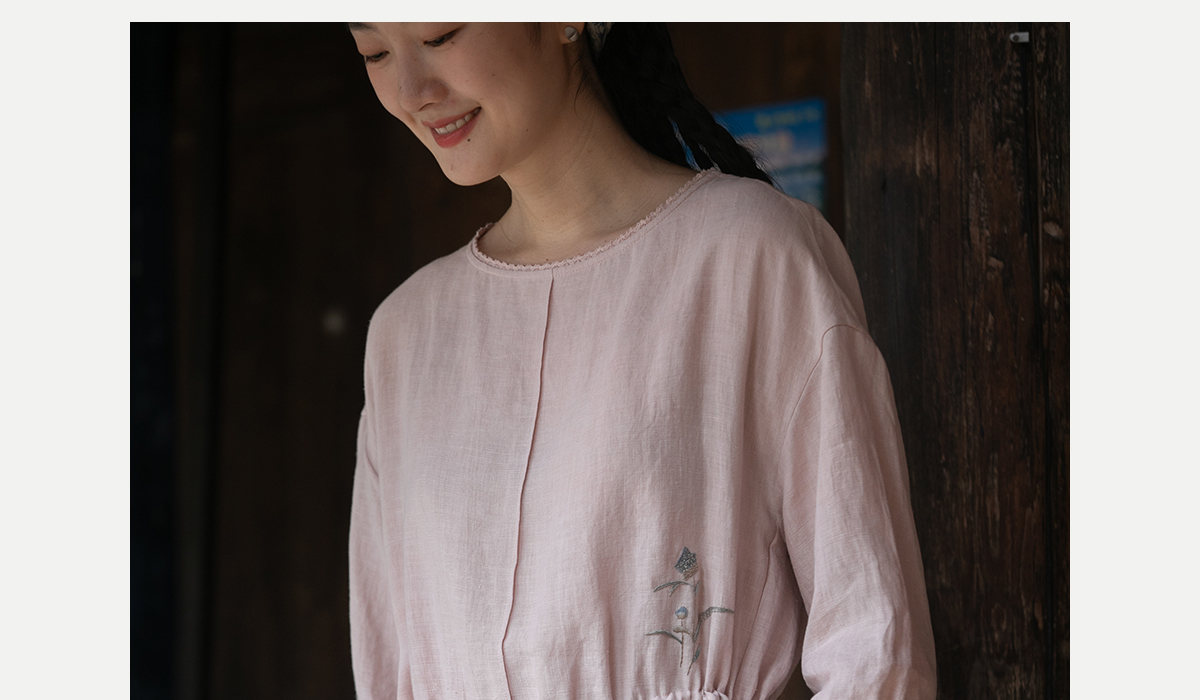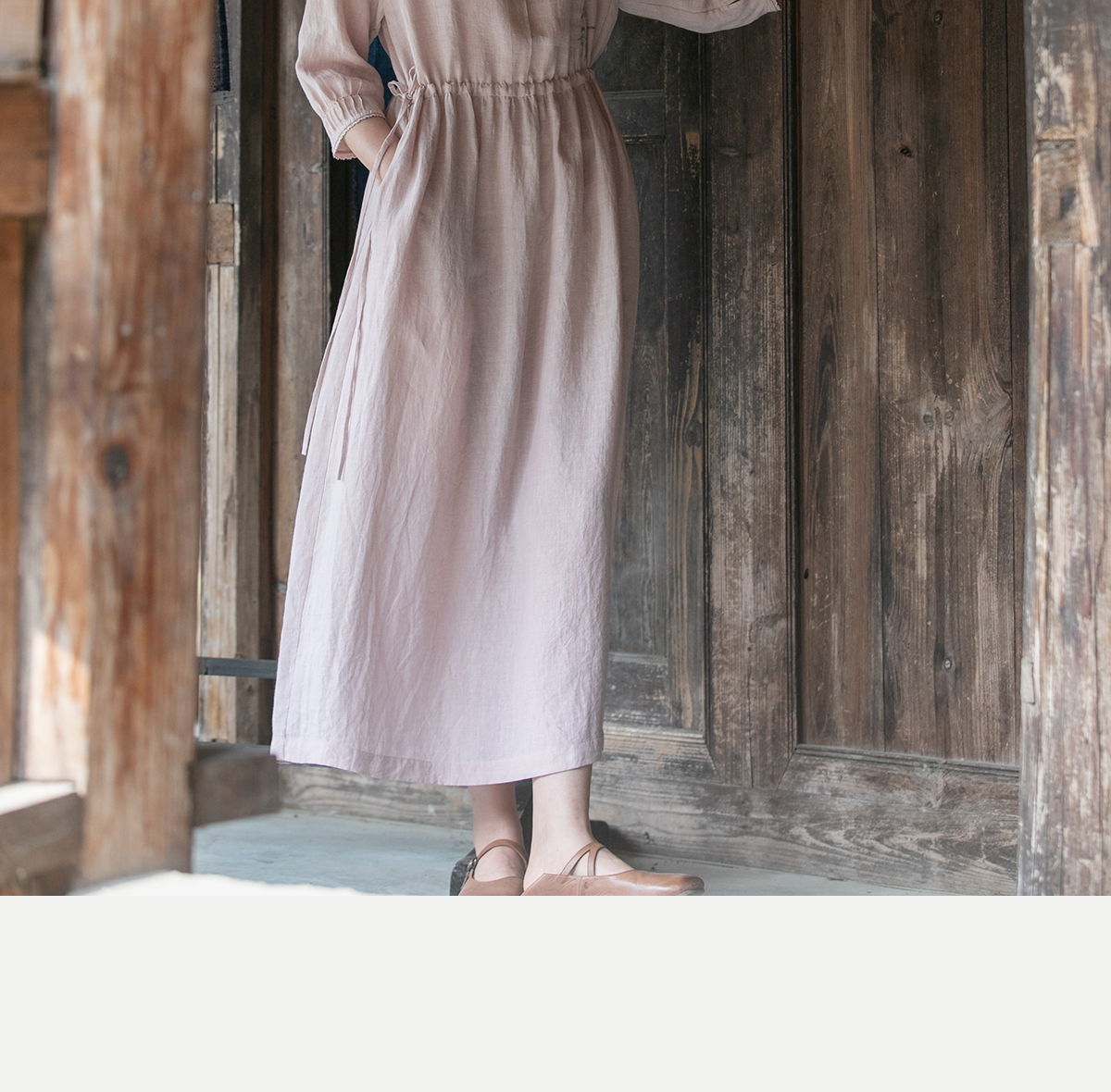 牧衣游原创 汉麻手工刺绣连衣裙宽松轻薄柔软抽绳圆领长裙 无极