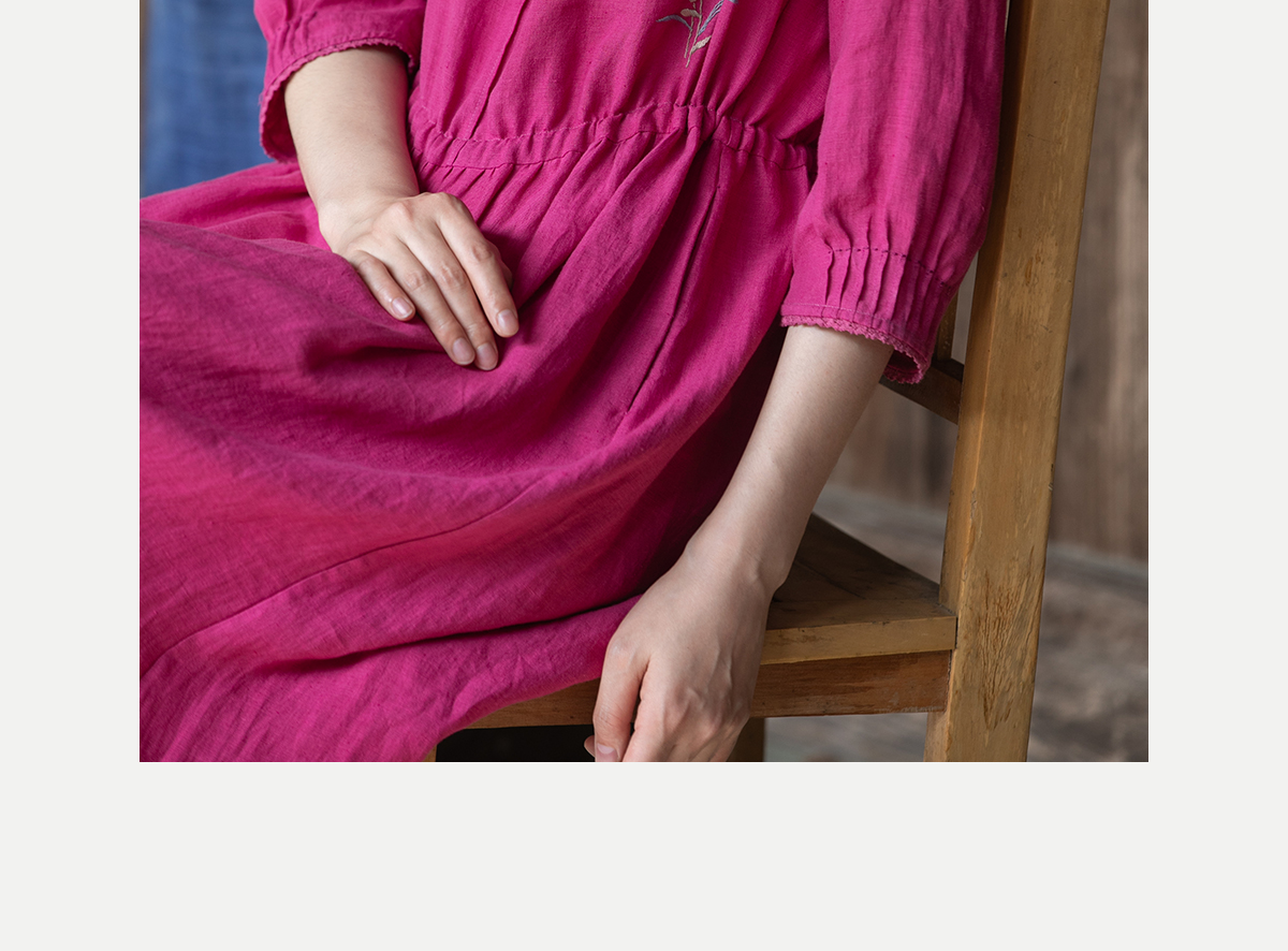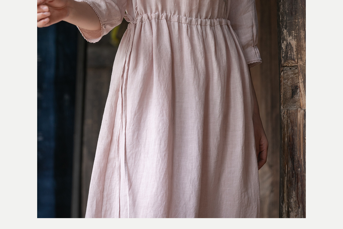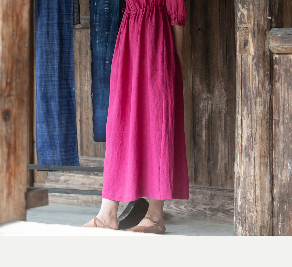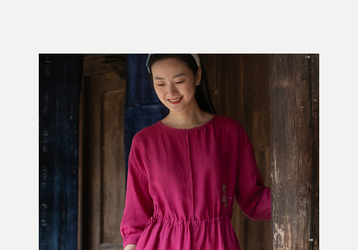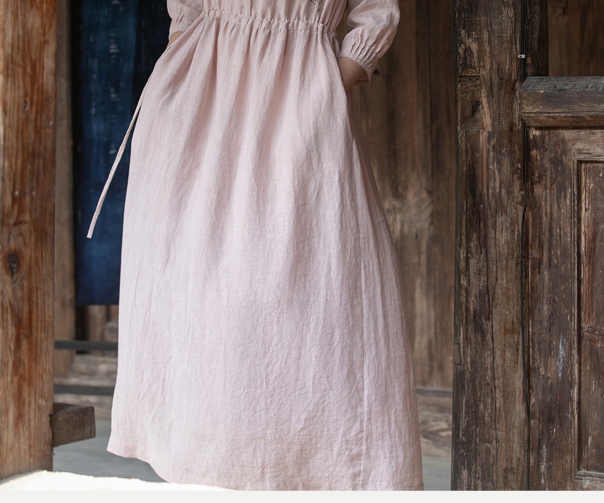 牧衣游原创 汉麻手工刺绣连衣裙宽松轻薄柔软抽绳圆领长裙 无极