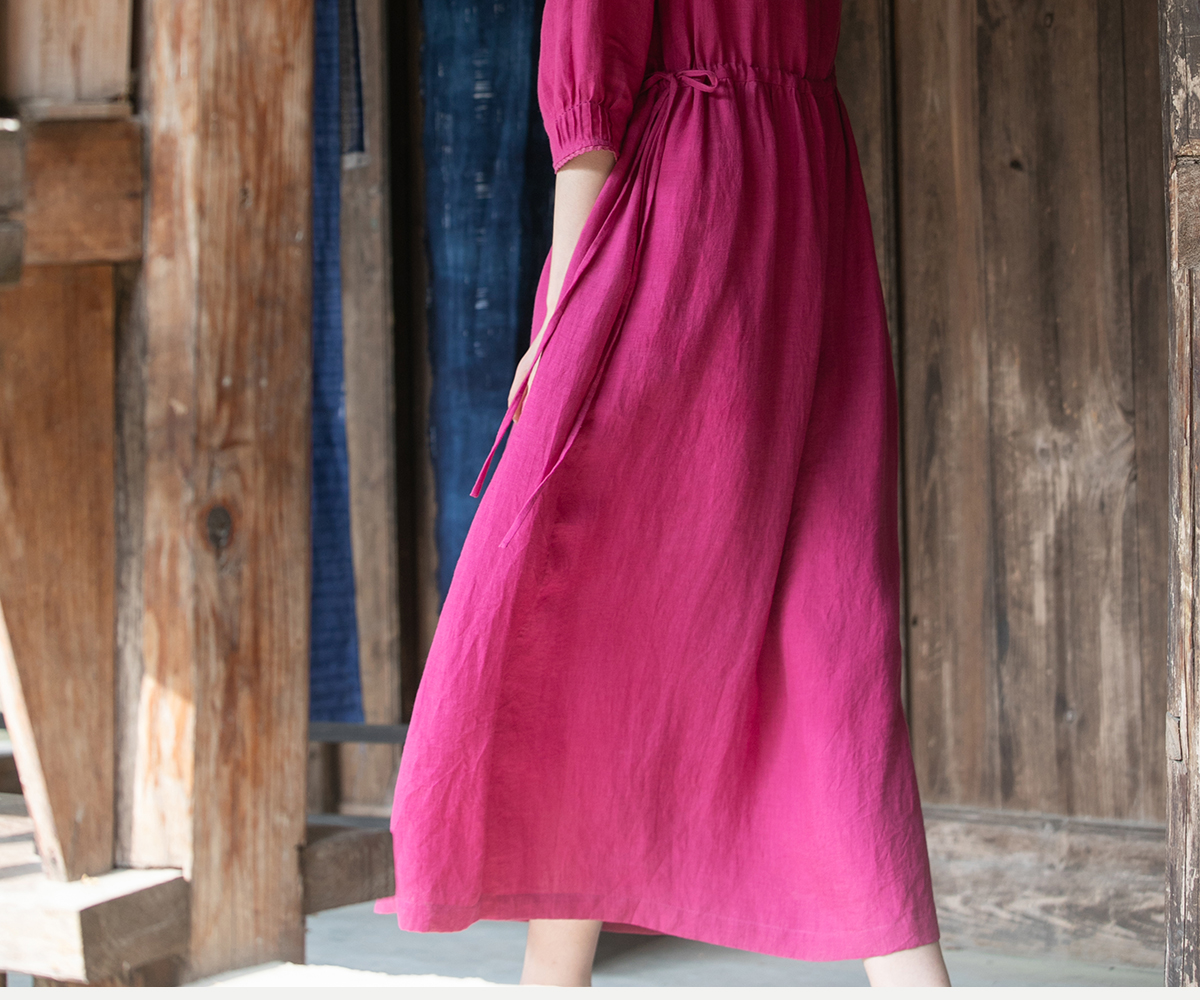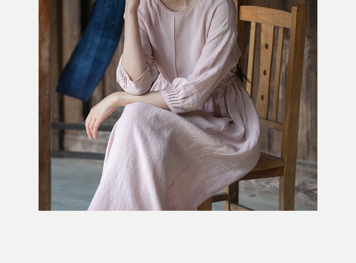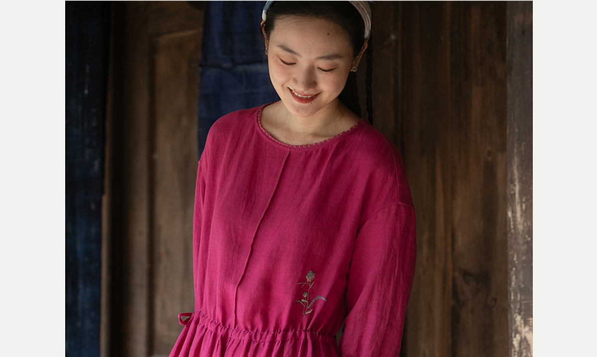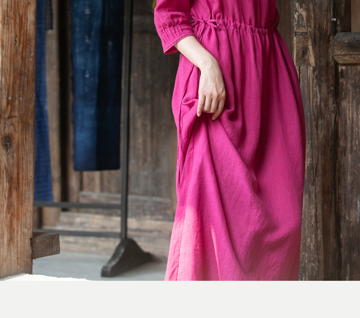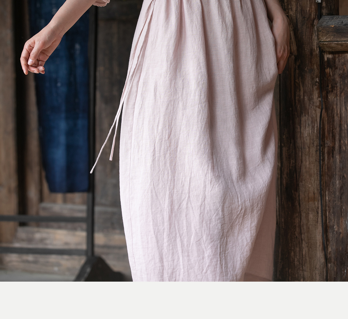 牧衣游原创 汉麻手工刺绣连衣裙宽松轻薄柔软抽绳圆领长裙 无极