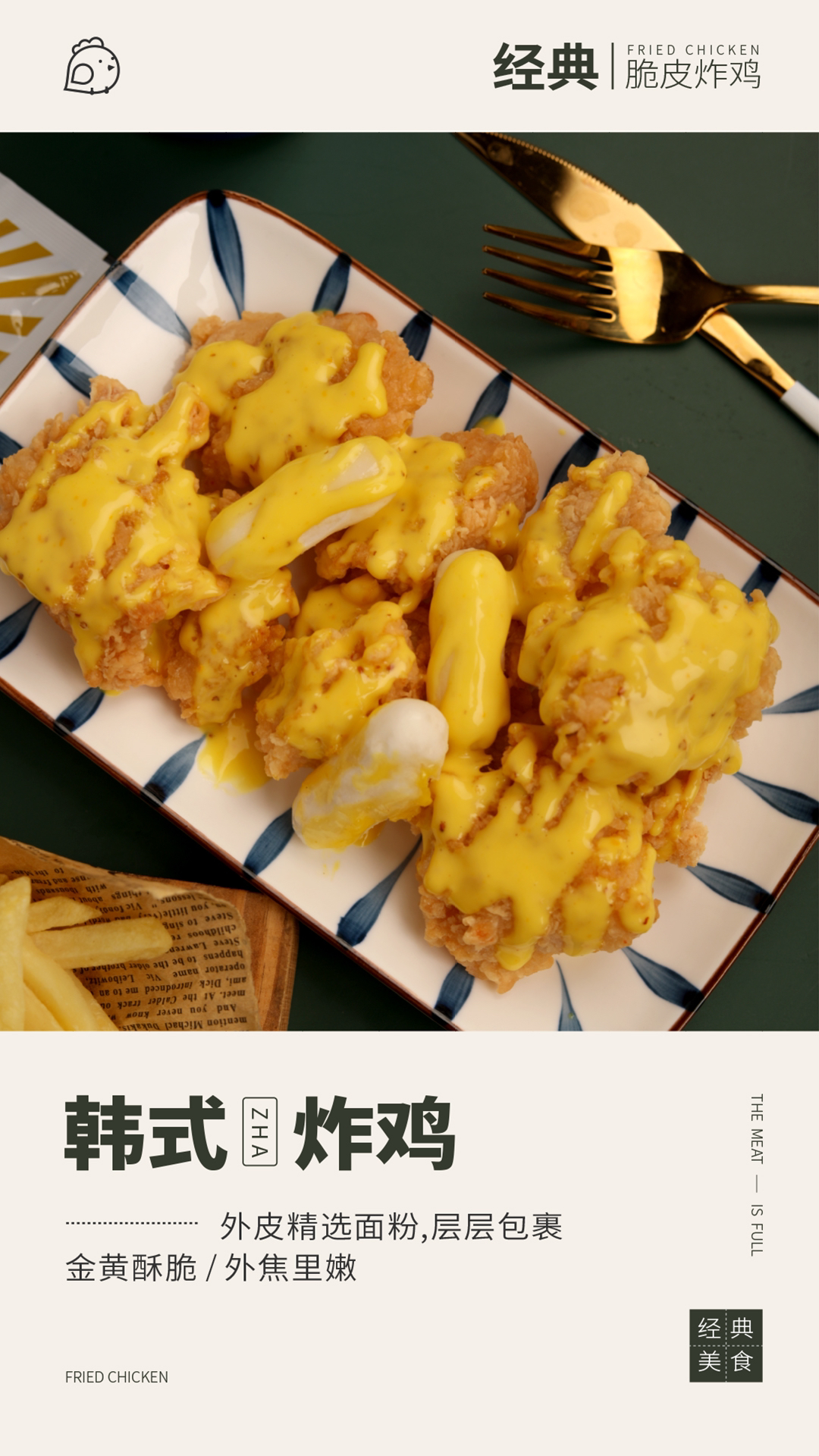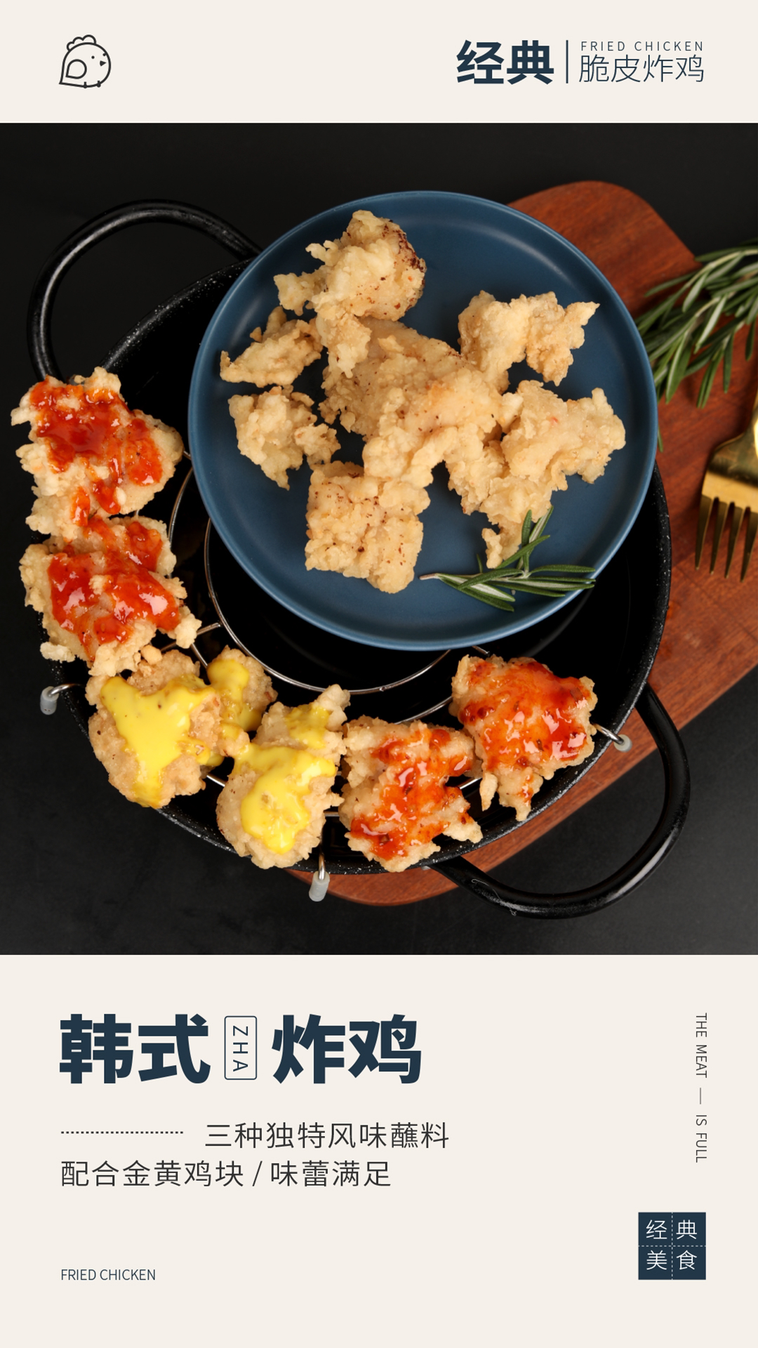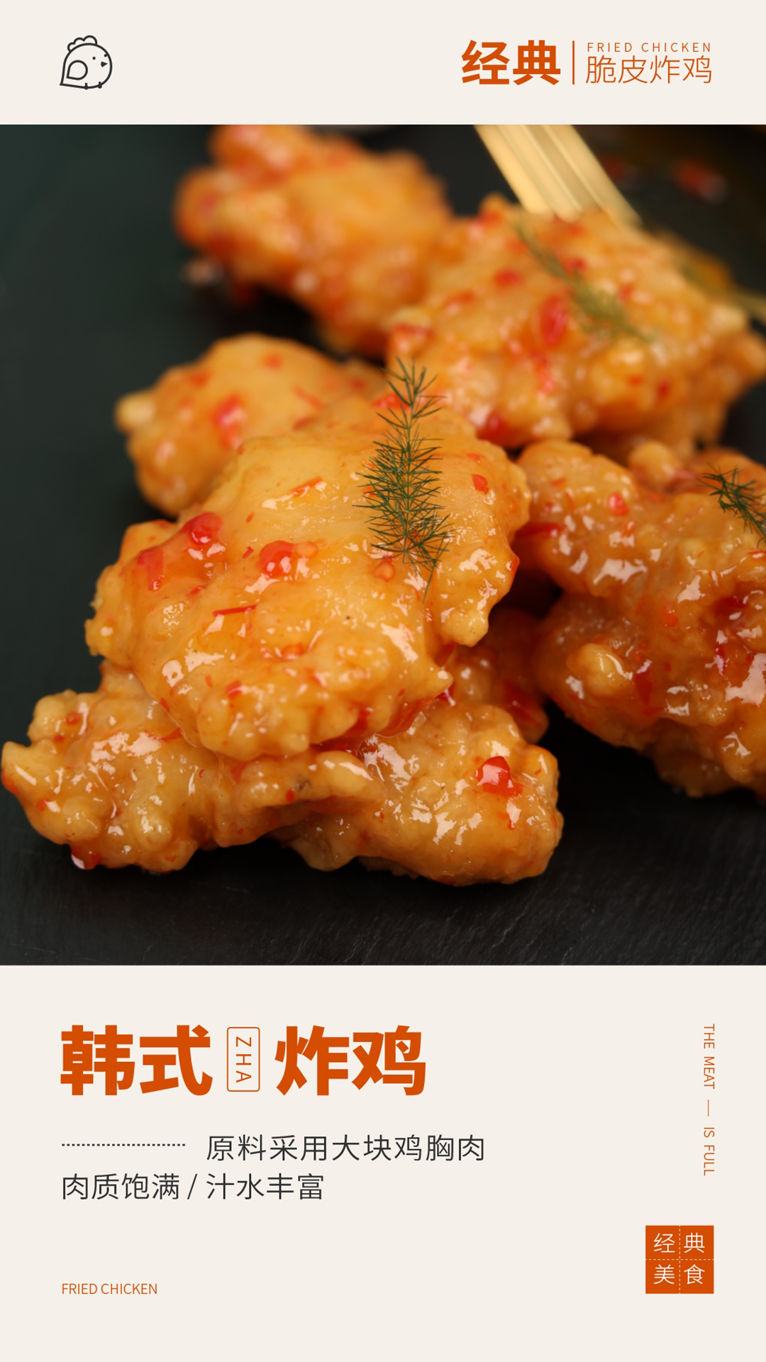 优选自然生长的健康鸡,精心挑选鸡胸肉制作韩式炸鸡,鸡肉细腻,口感不干不柴,入口便知的鲜嫩美味
