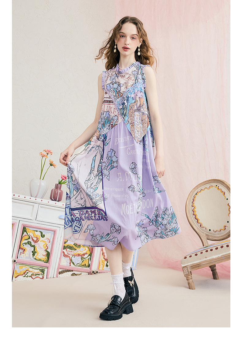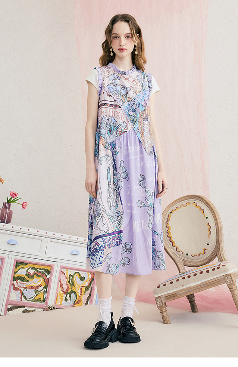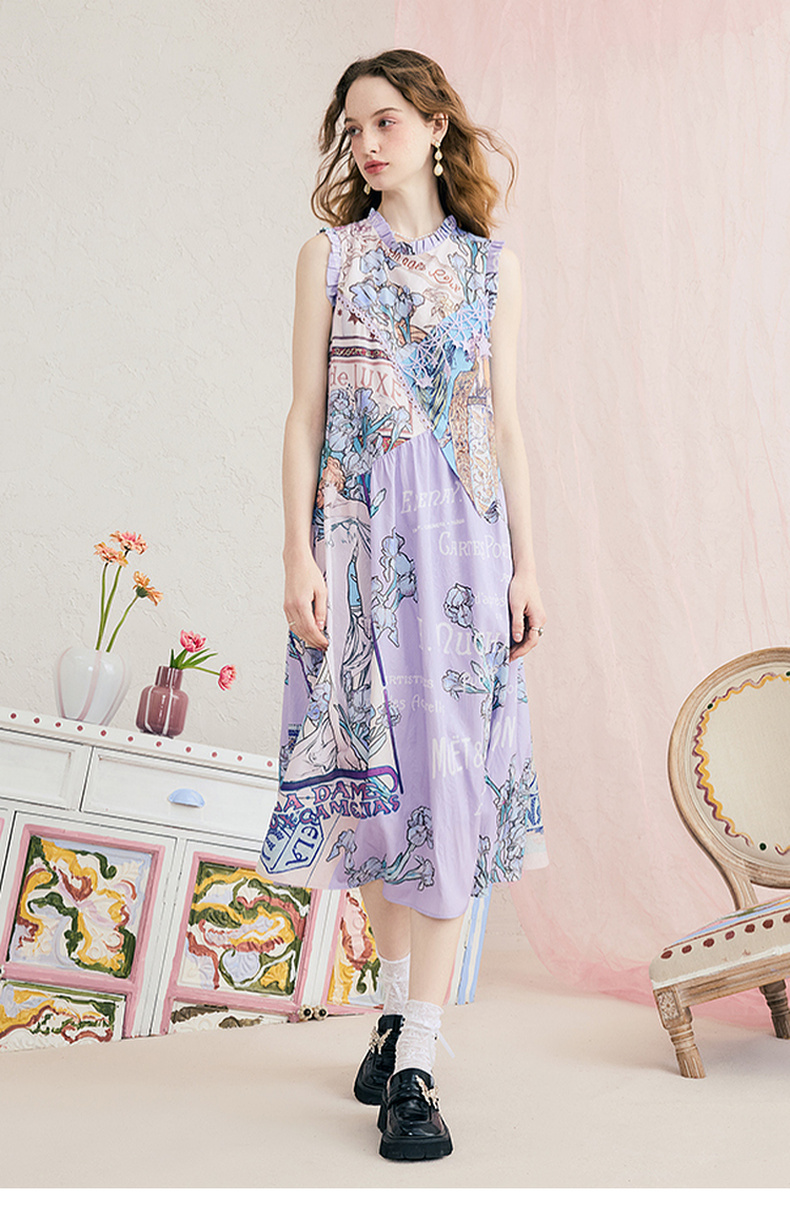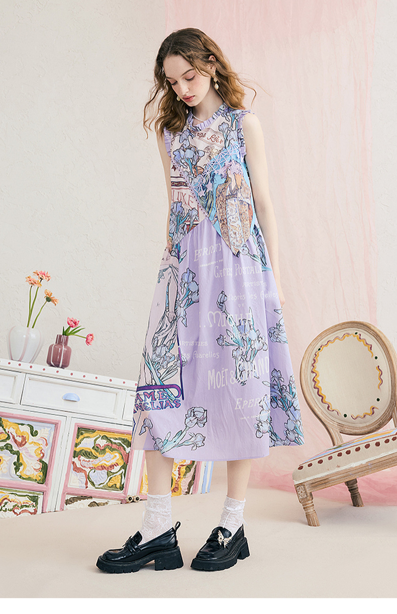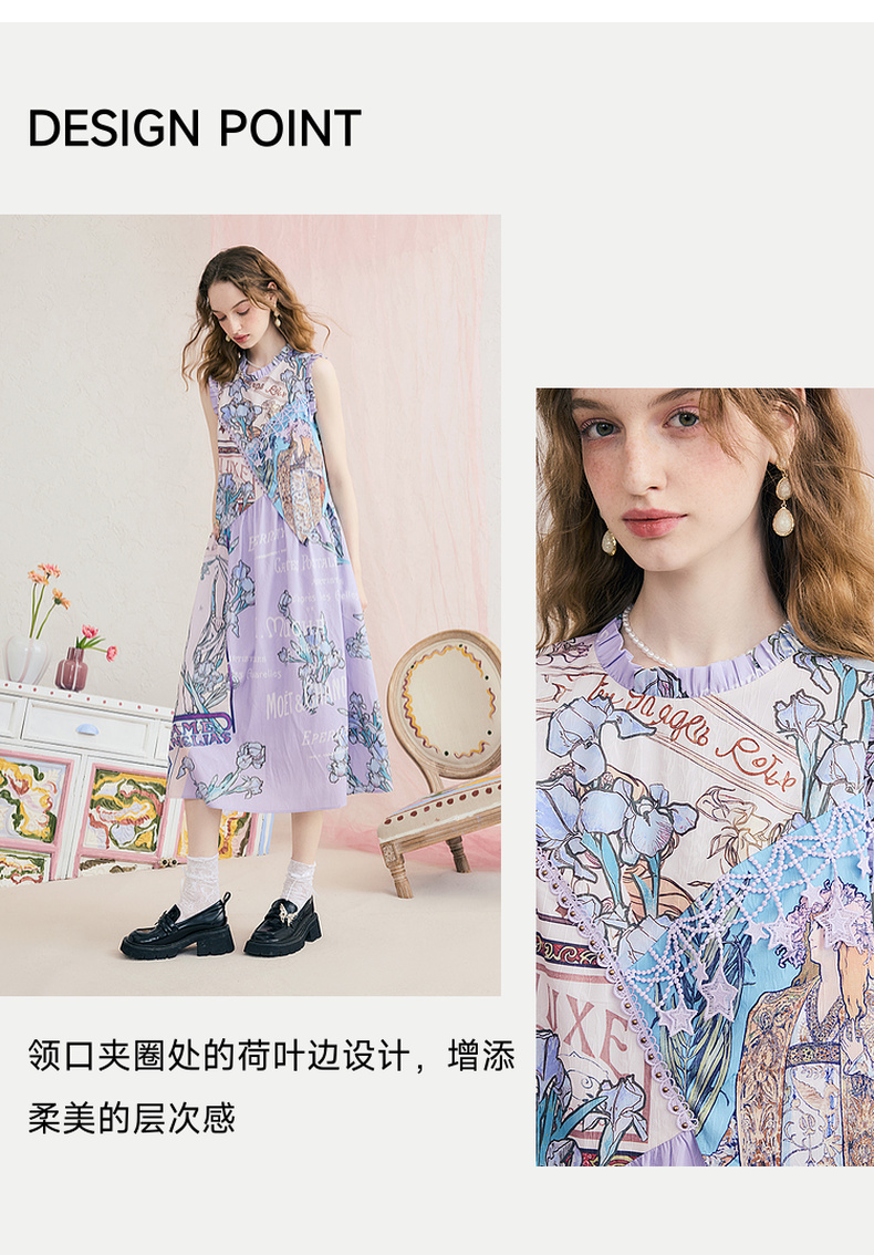 两三事糖霜星轨2025夏新款甜美镂空花边拼接印花无袖背心裙连衣裙