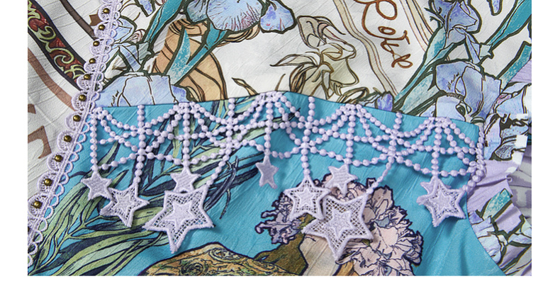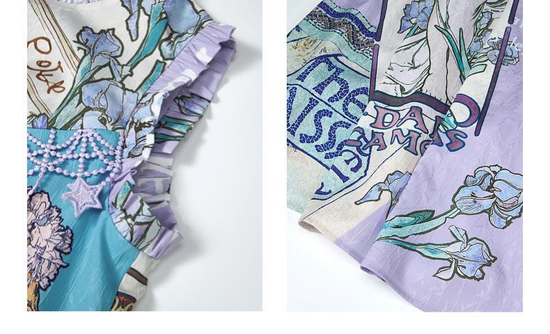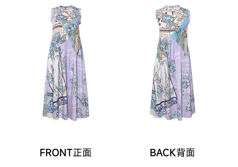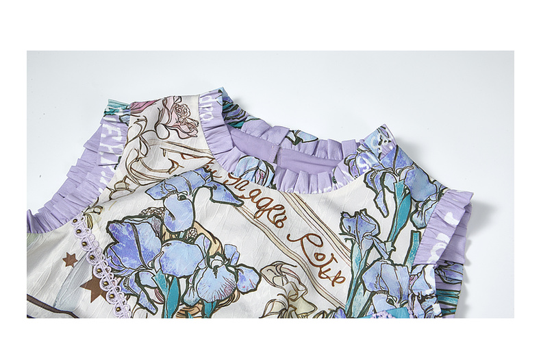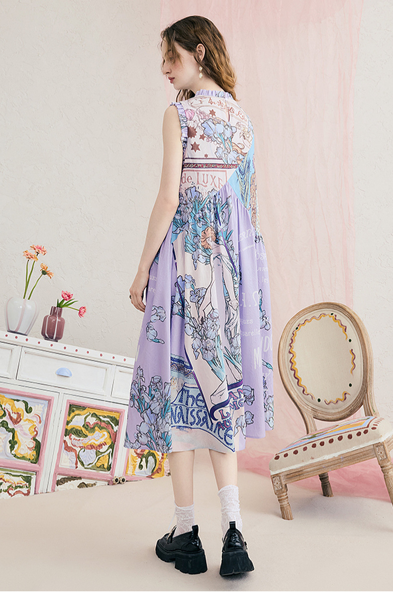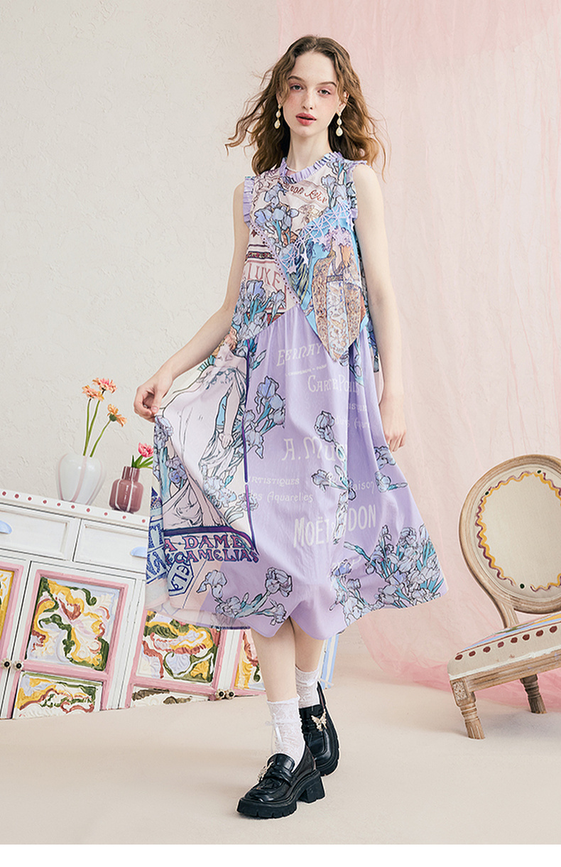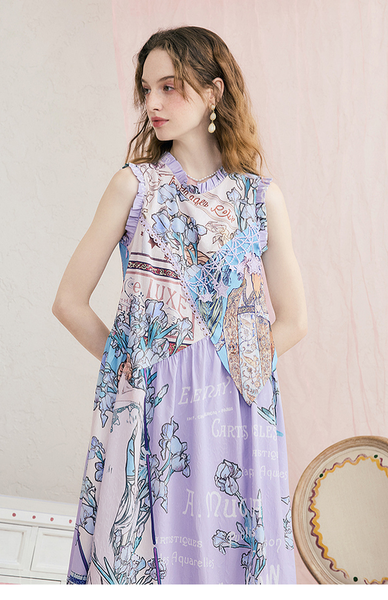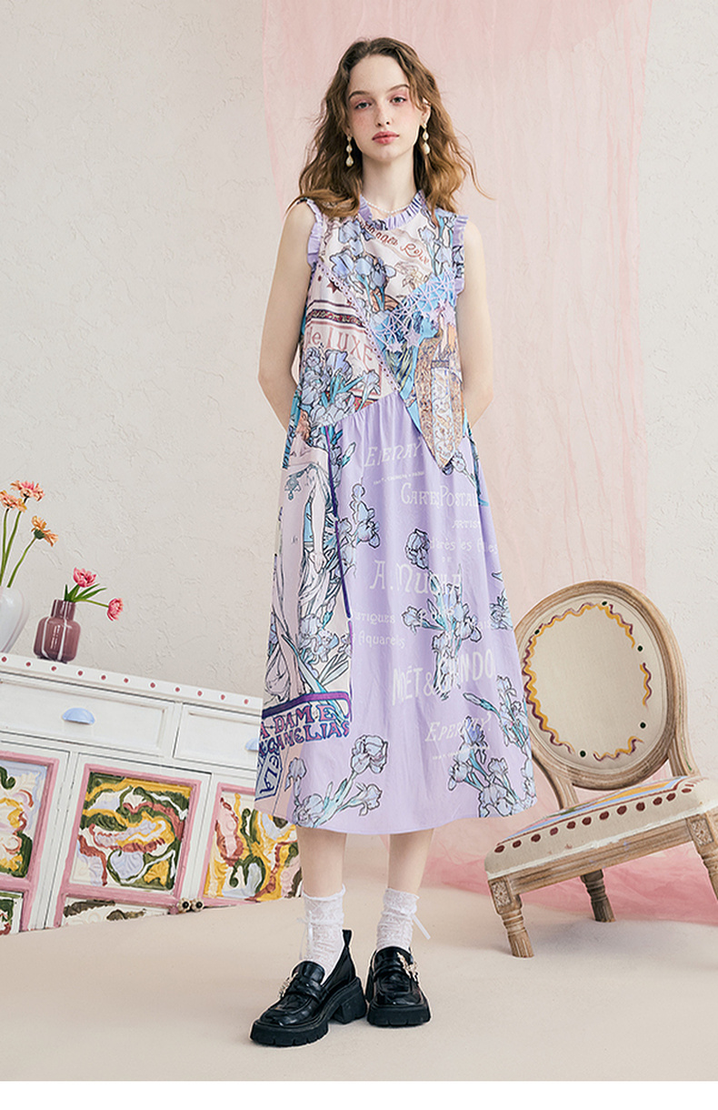 两三事糖霜星轨2025夏新款甜美镂空花边拼接印花无袖背心裙连衣裙