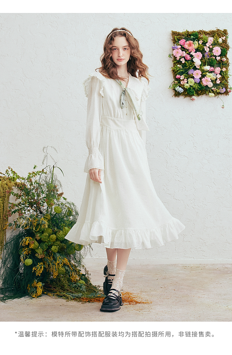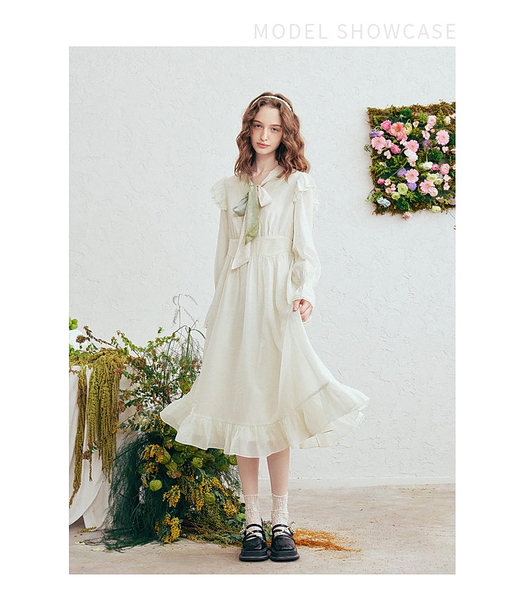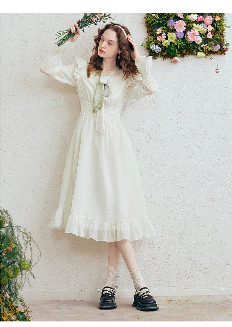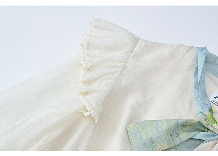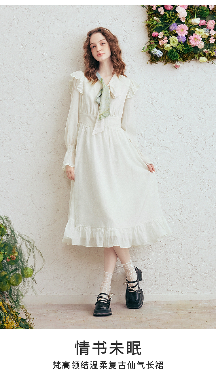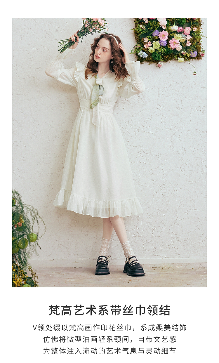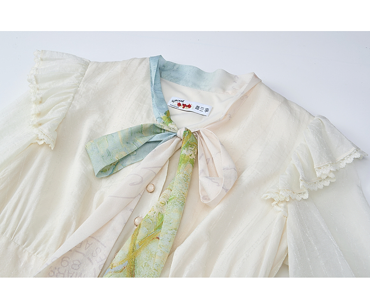 两三事梵高文艺情书未眠2026春新款甜美荷叶边拼接印花领带连衣裙