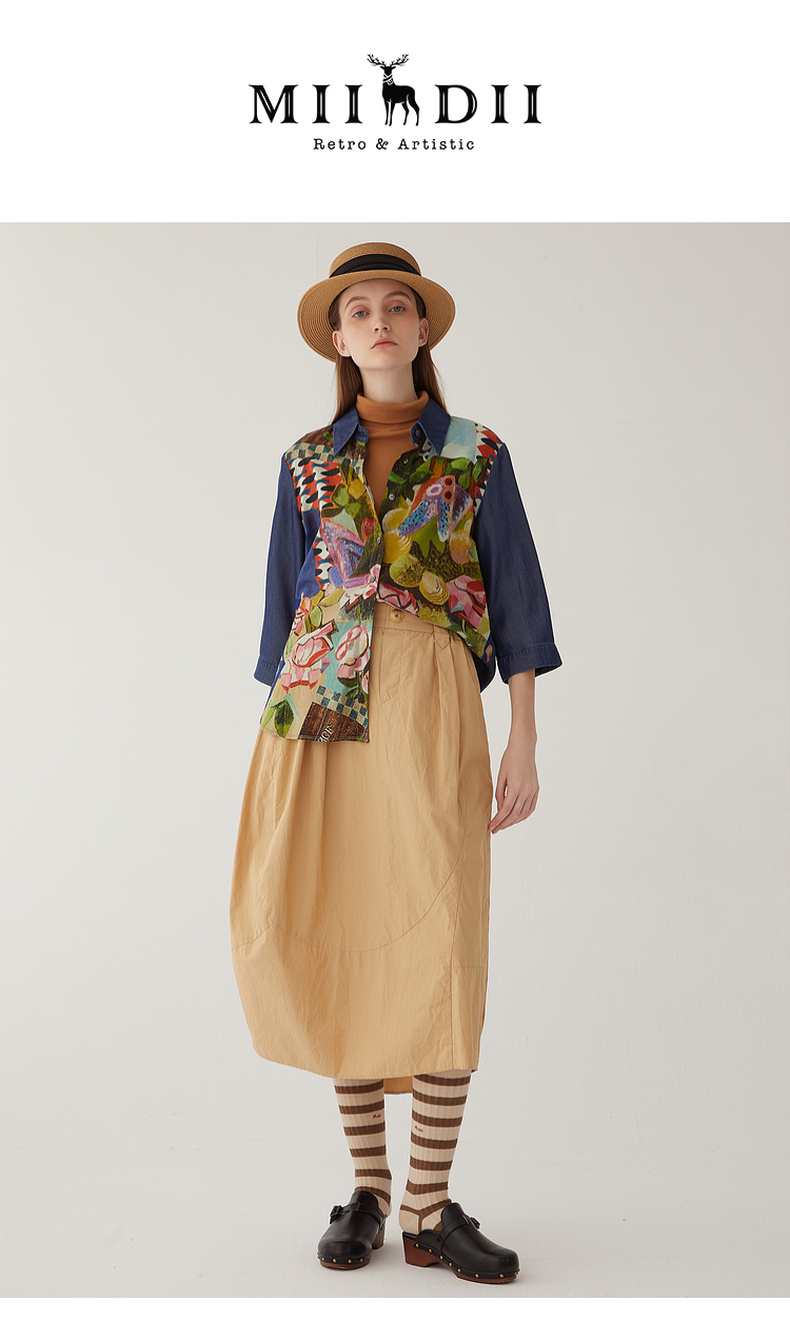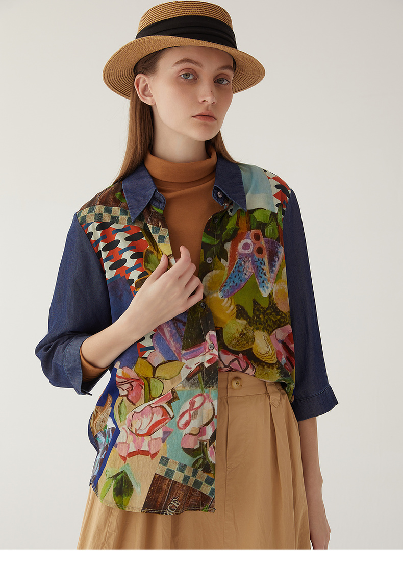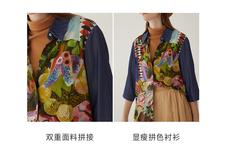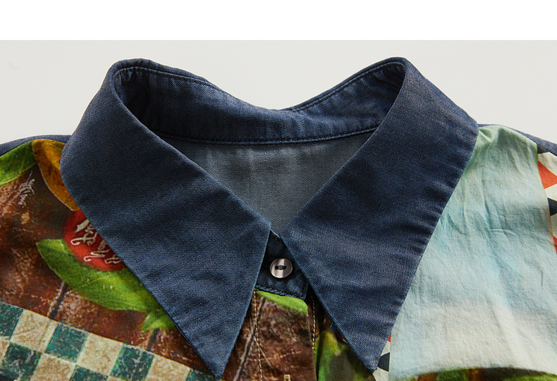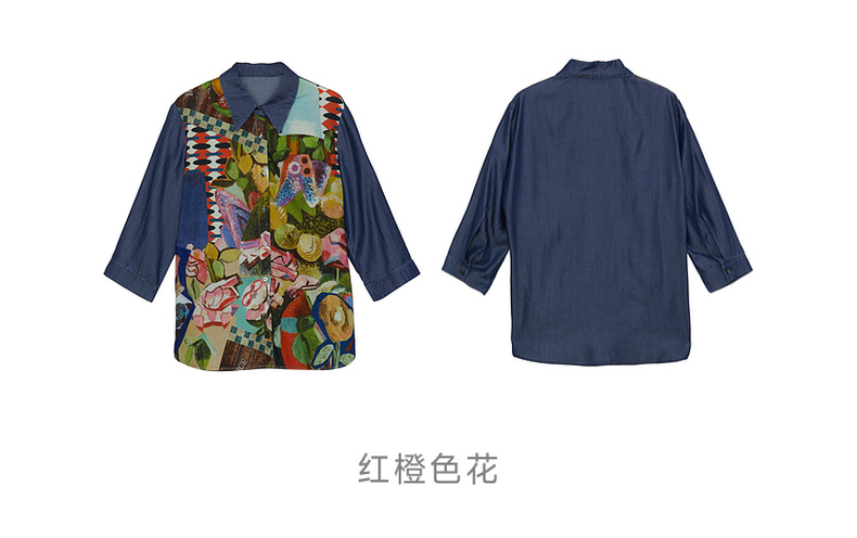 谜底牛仔拼接衬衫分袖女2024夏季新款复古印花亲肤衬衣246MC7071
