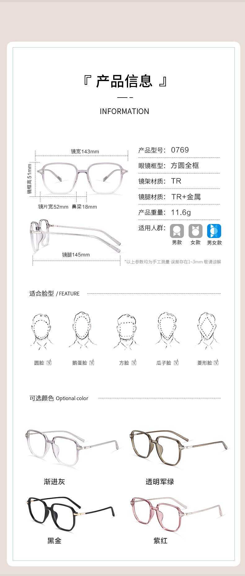 普莱斯0796 素颜ins风 TR+金属材质经典大框 四色可选