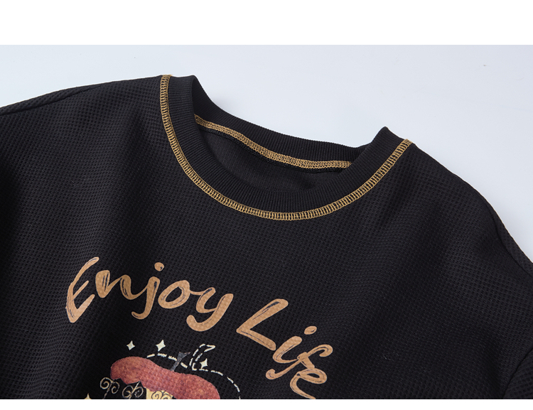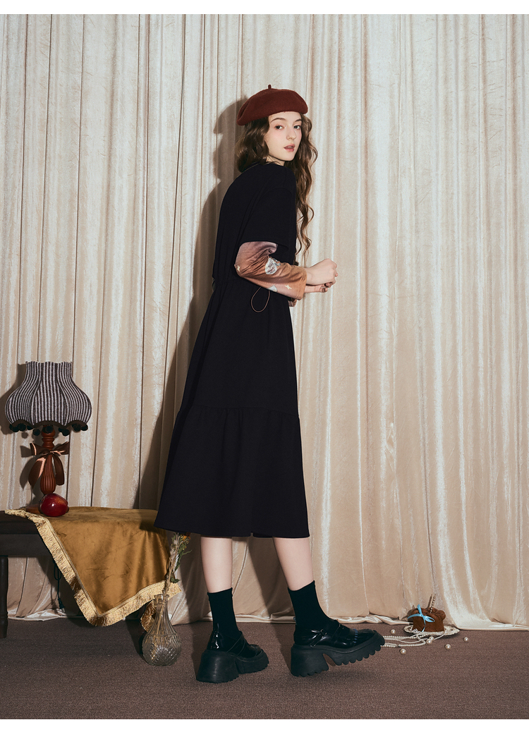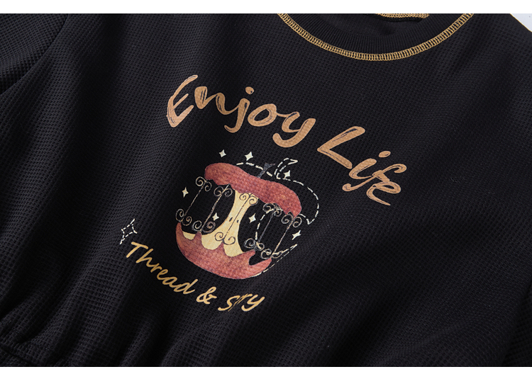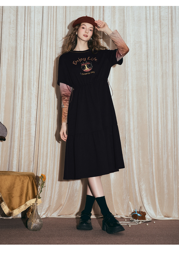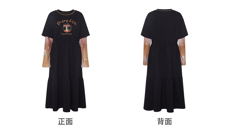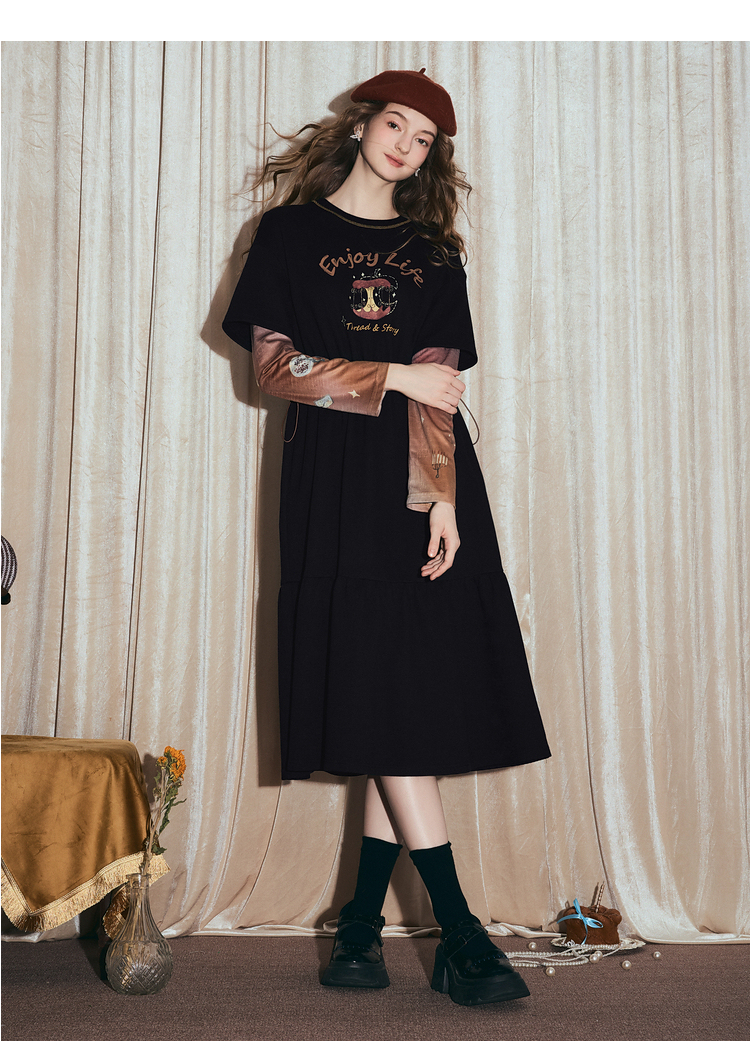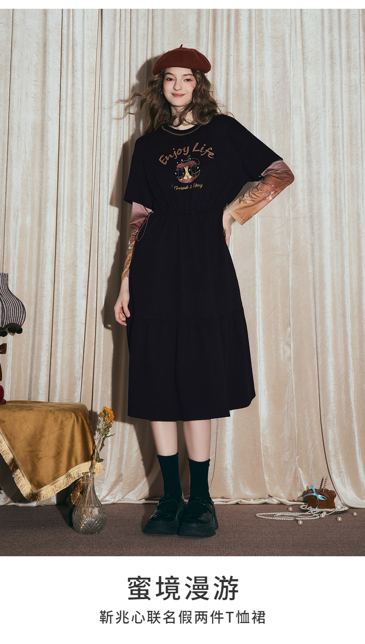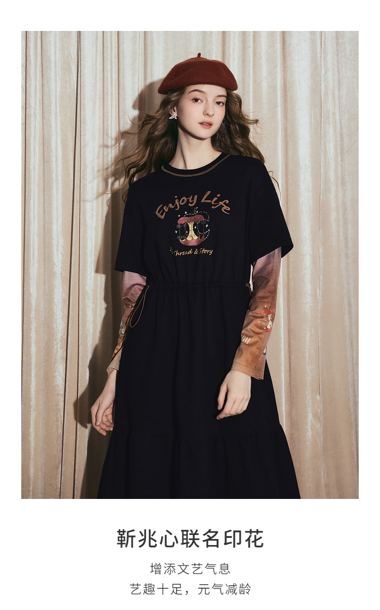 两三事 蜜境漫游 2025秋季新款趣味印花抽绳假两件连衣裙