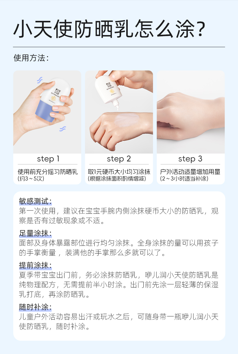 第一次使用本产品建议家长朋友做一下过敏测试,在宝宝手腕内侧或者耳后(没有湿疹的地方或者完整皮肤处)涂抹一下本产品,等待3分钟看是否有发红或红痒现象;如果发红的话可能是过敏现象建议停用,如果不造成发红/红痒那就不对本产品过敏