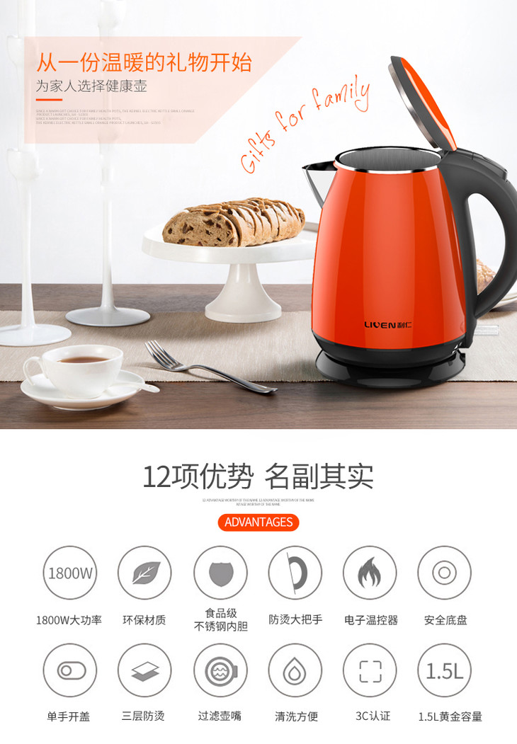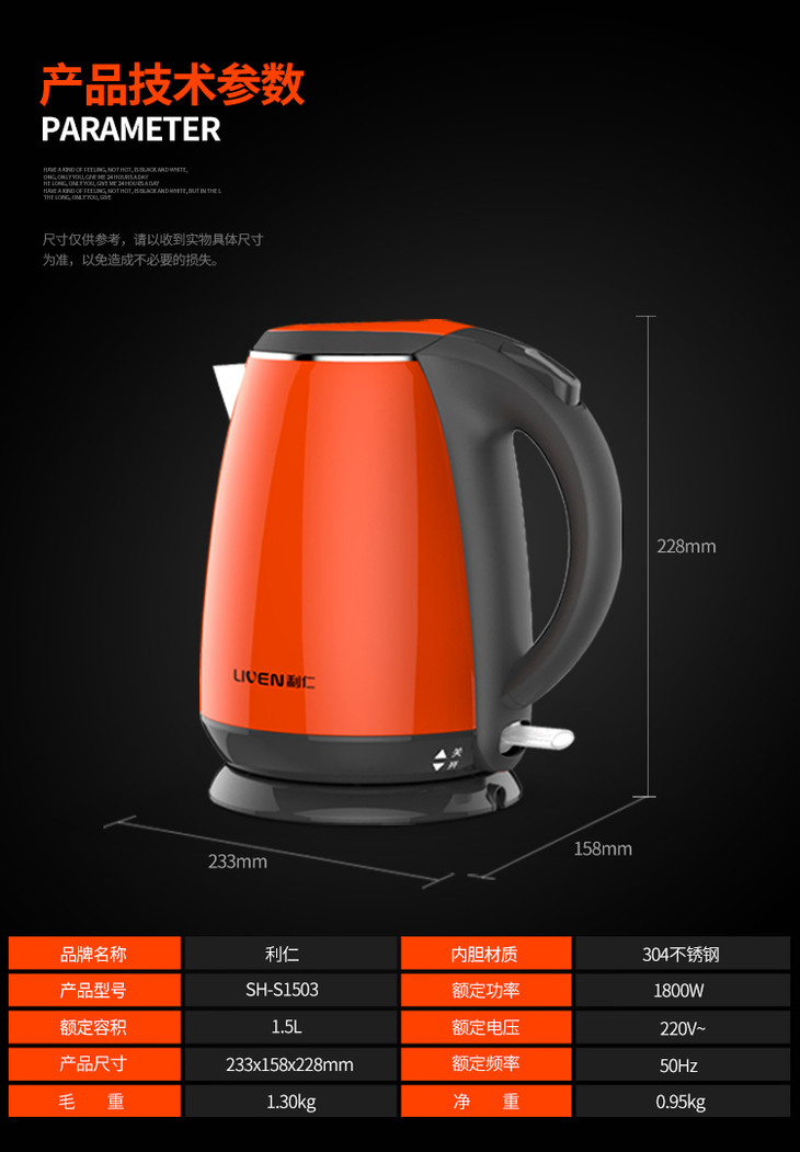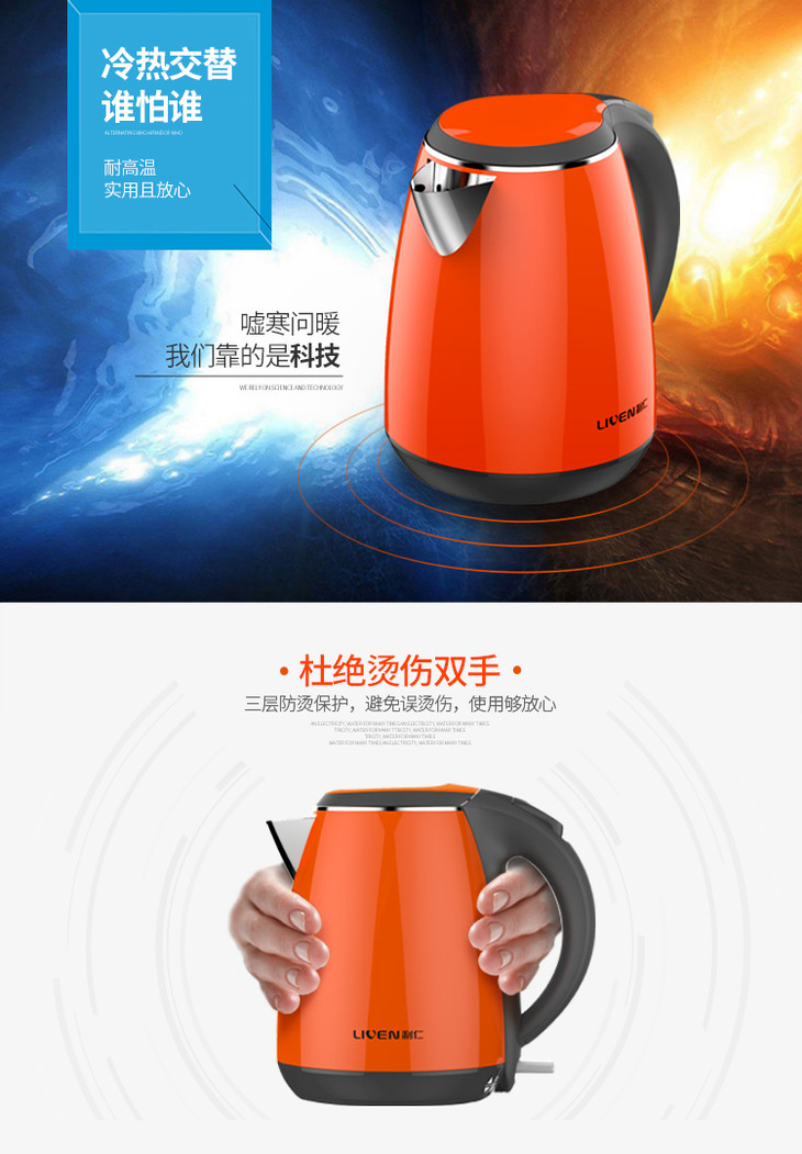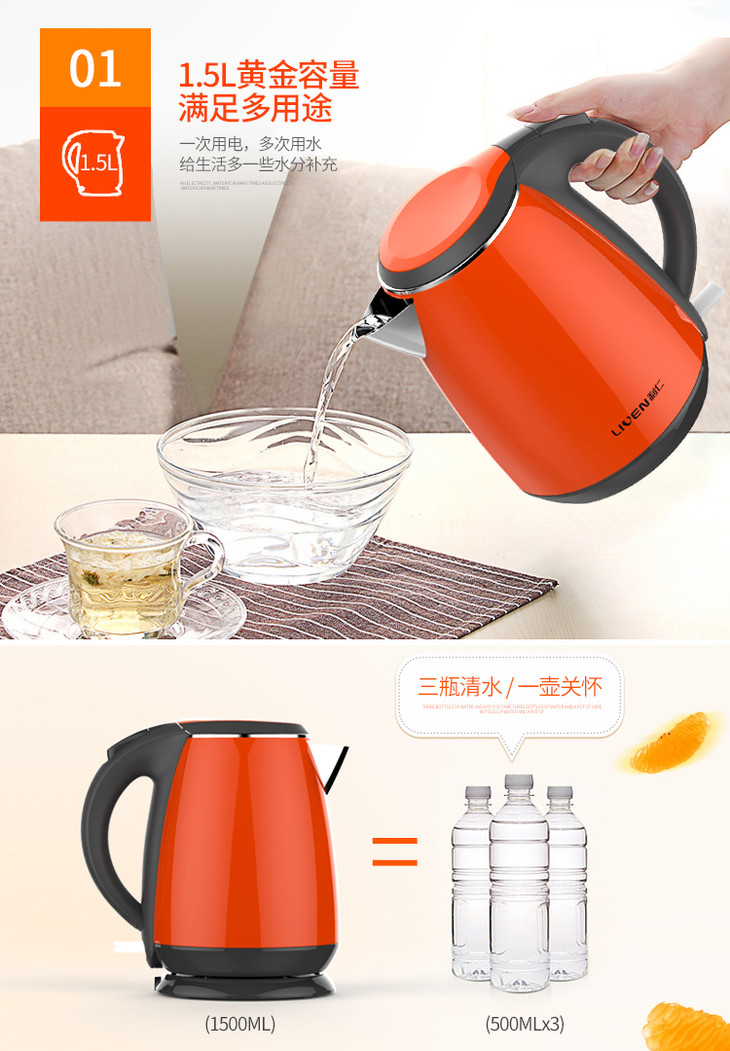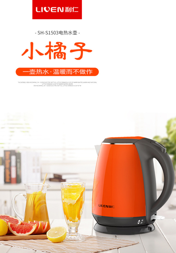 利仁(Liven)电水壶304不锈钢电热水壶1.5L烧水壶双层防烫防干烧 1.5L+防烫+电水壶SH-S1503