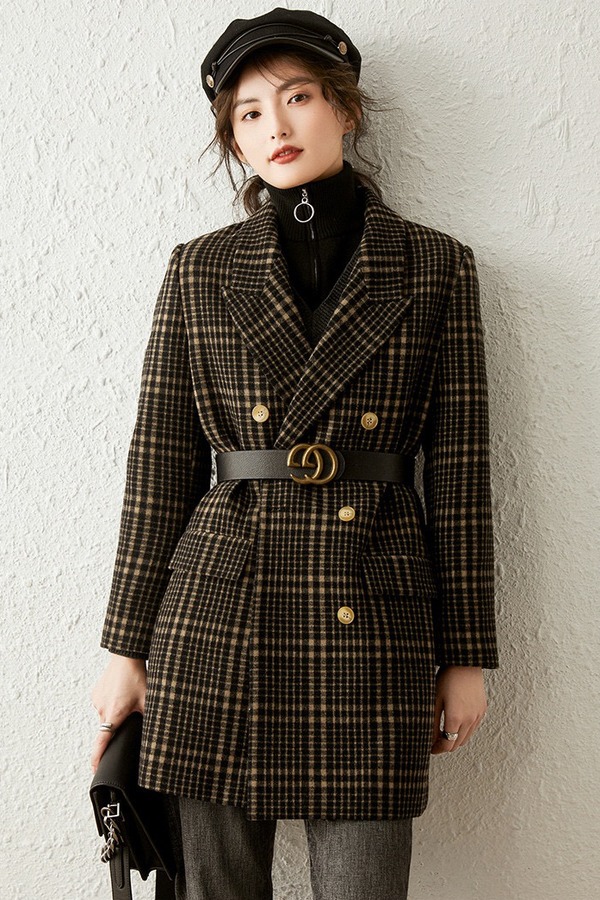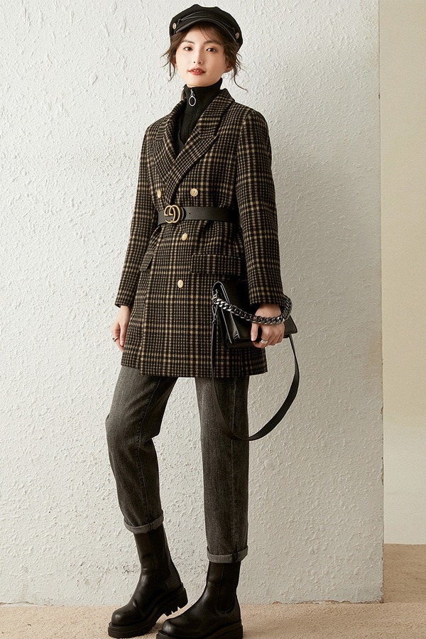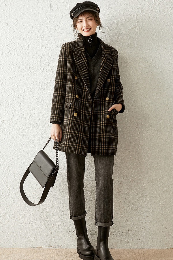 LOUIS YAO/白鹿语 宽松翻领格纹中长款加棉毛呢西装外套 14740