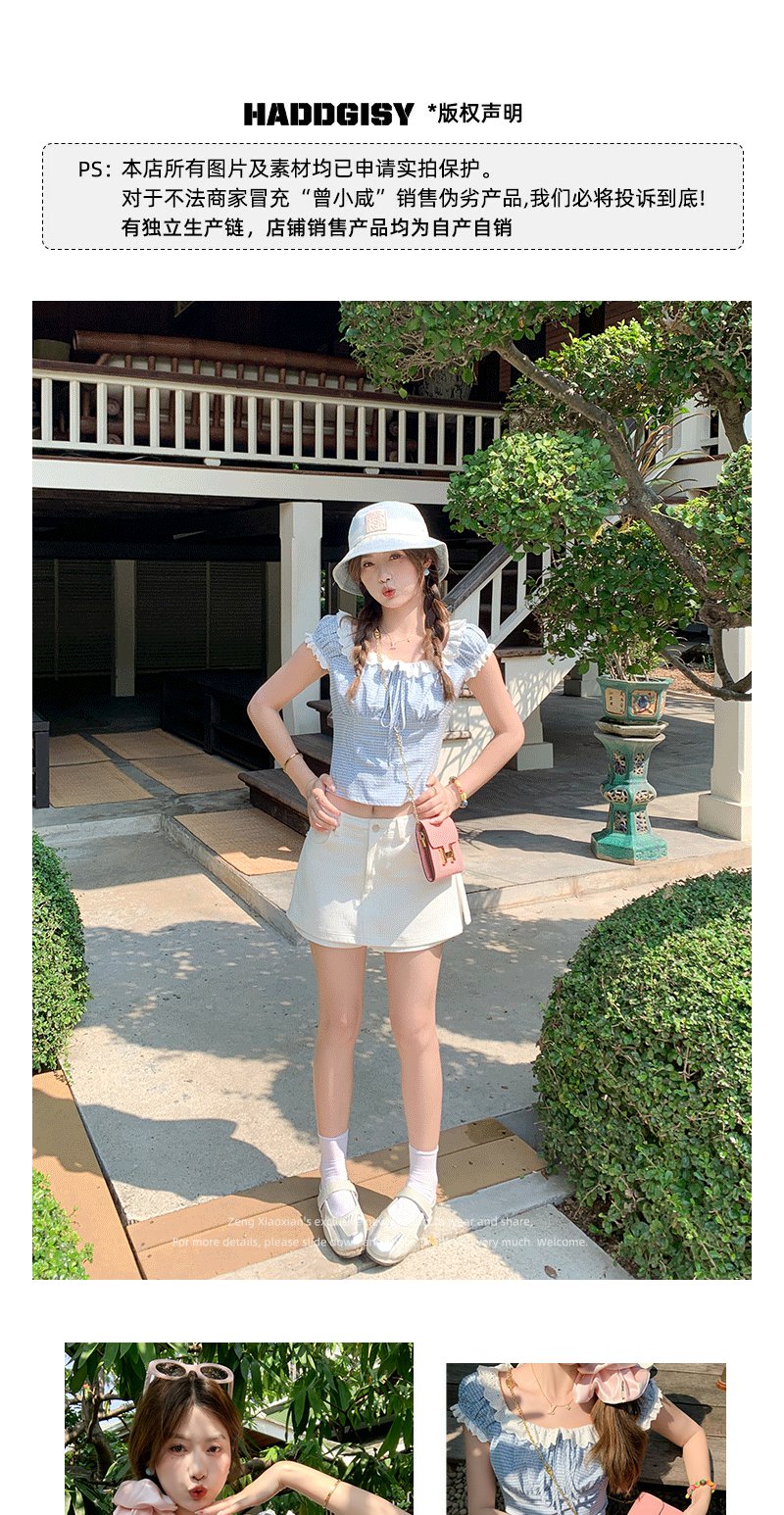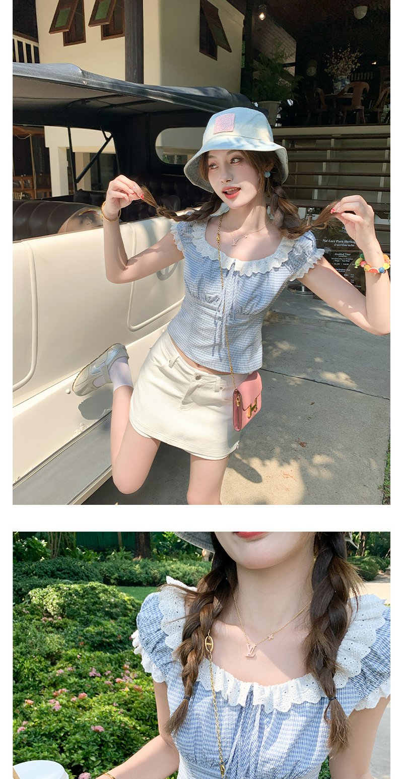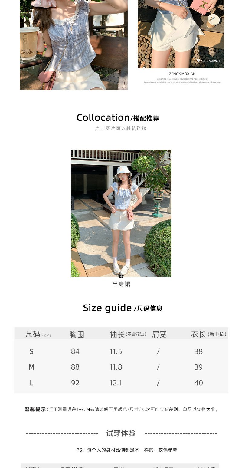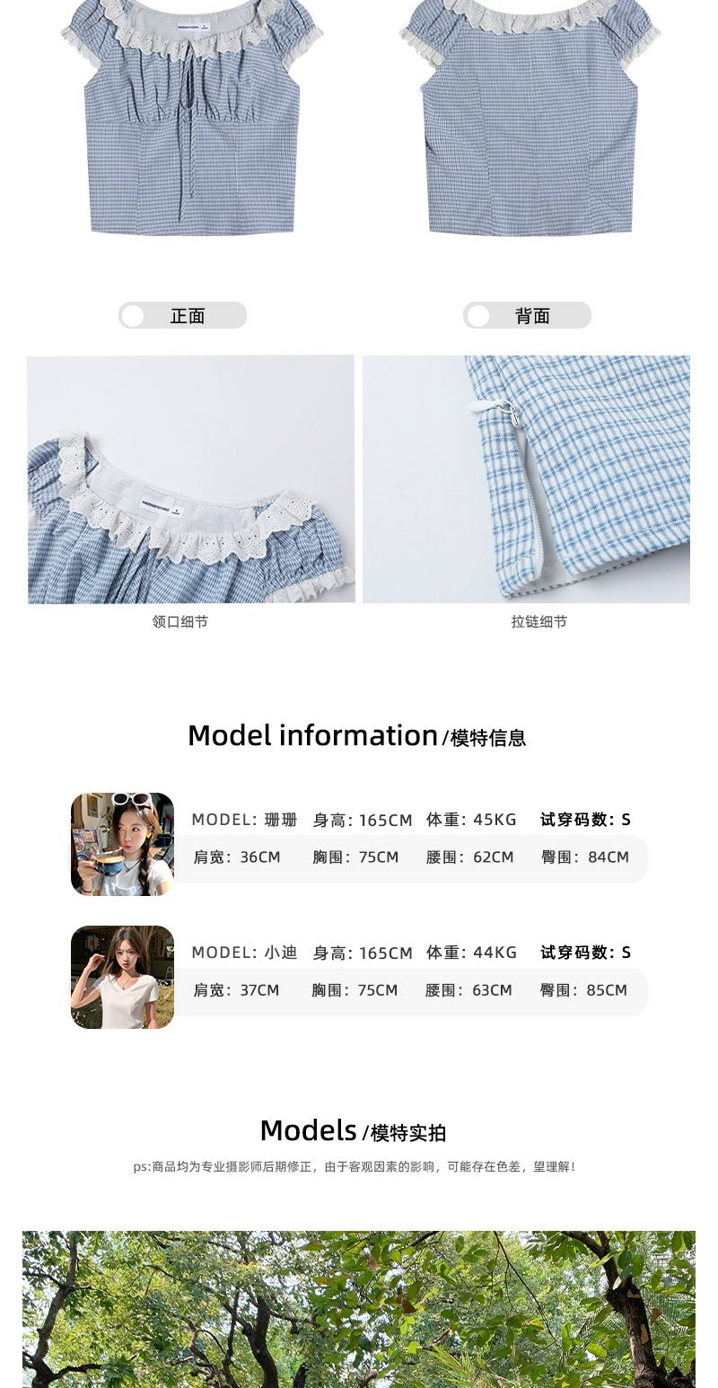 <曾小咸推荐>韩系格子拼接蕾丝泡泡袖衬衫