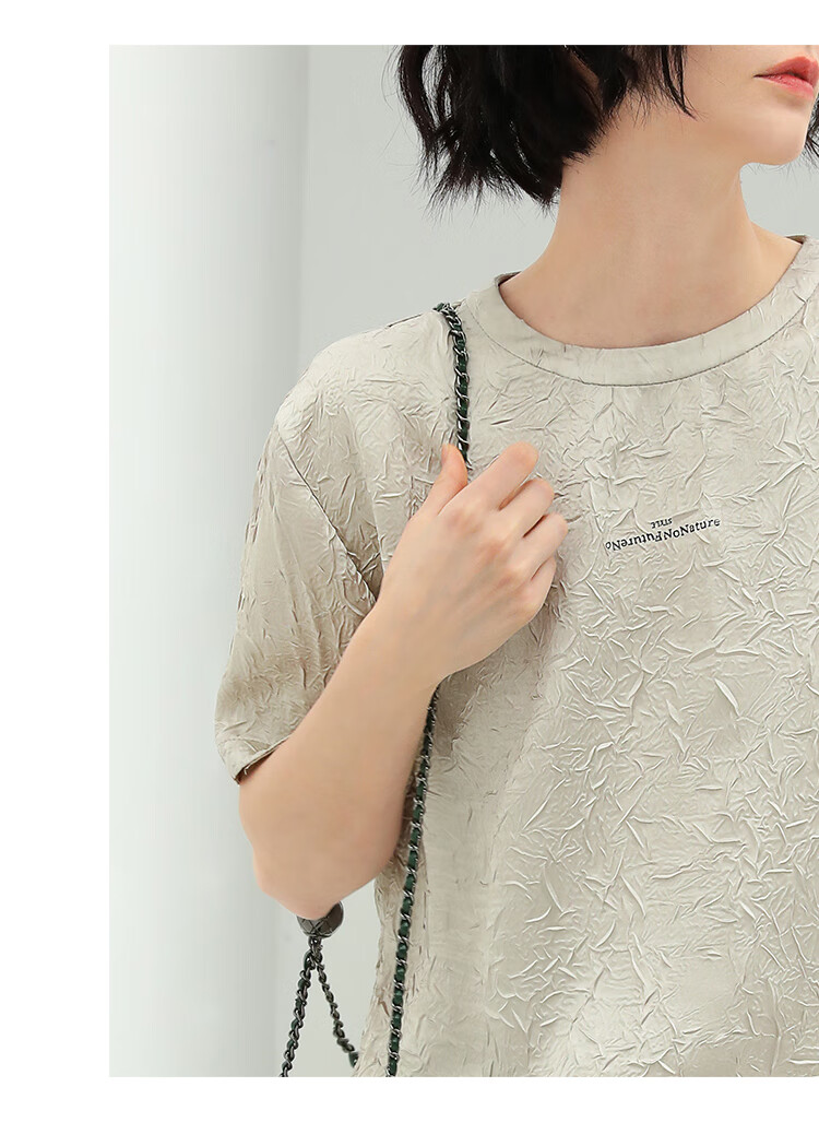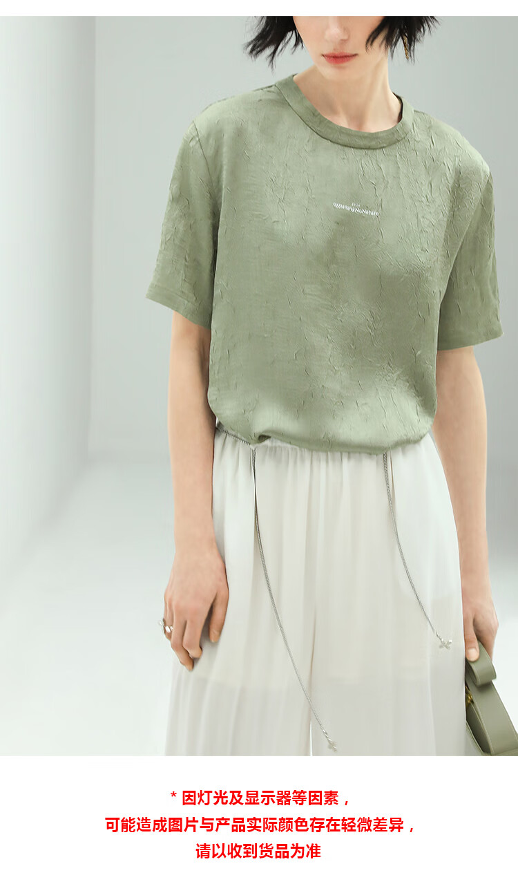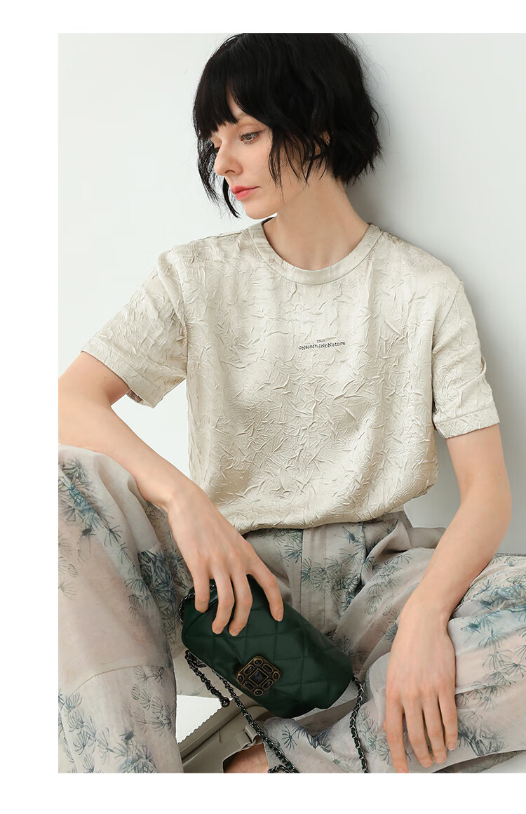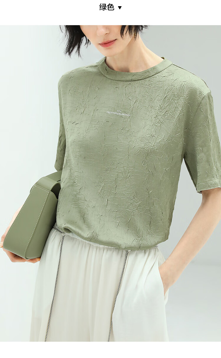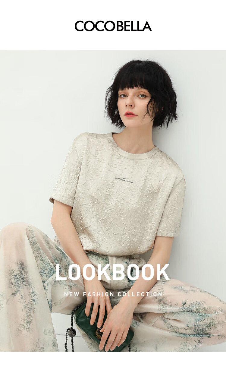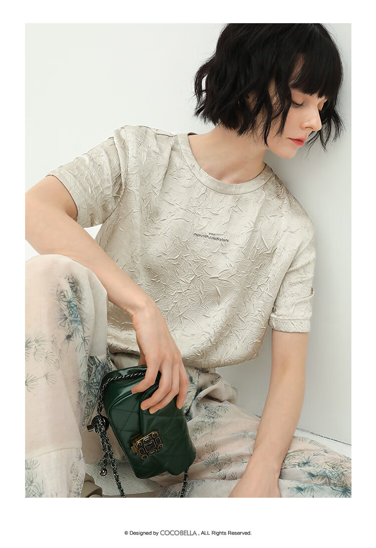 COCOBELLA肌理褶皱字母圆领上衣女夏光泽感缎面短袖T恤TS632