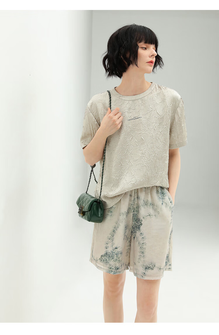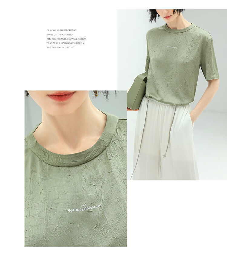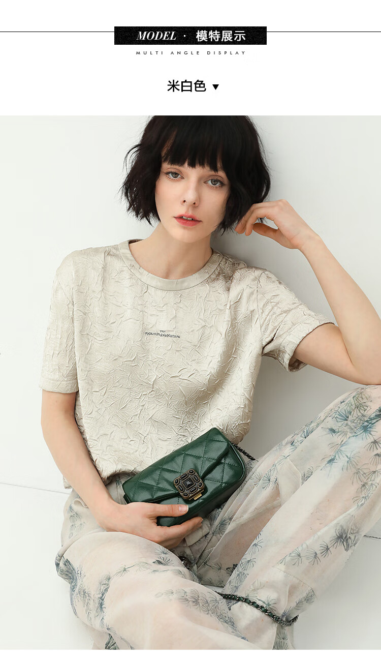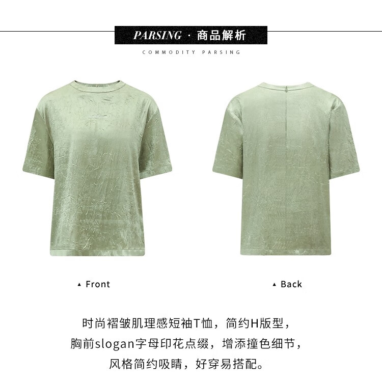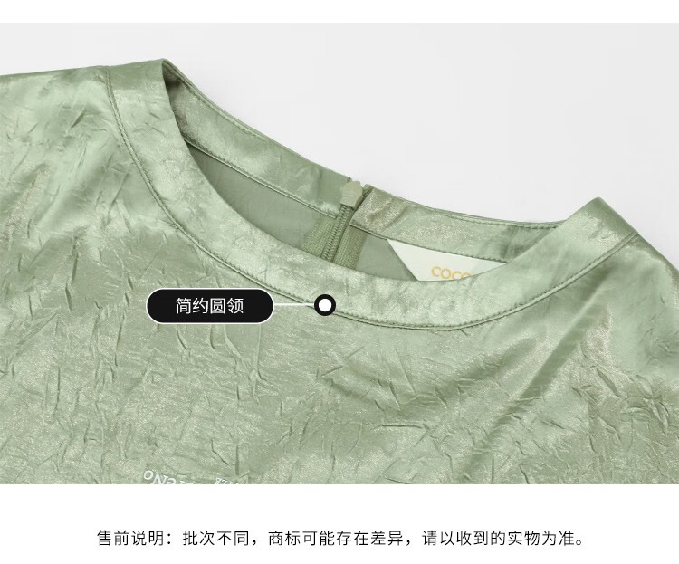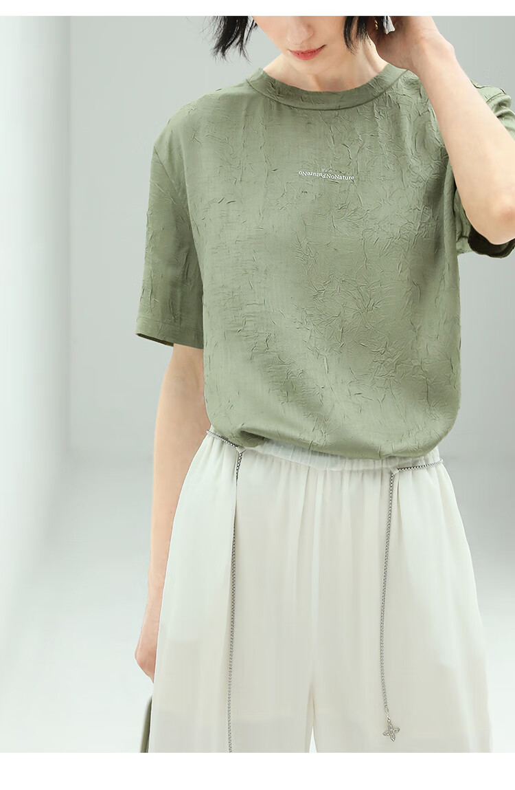 COCOBELLA肌理褶皱字母圆领上衣女夏光泽感缎面短袖T恤TS632