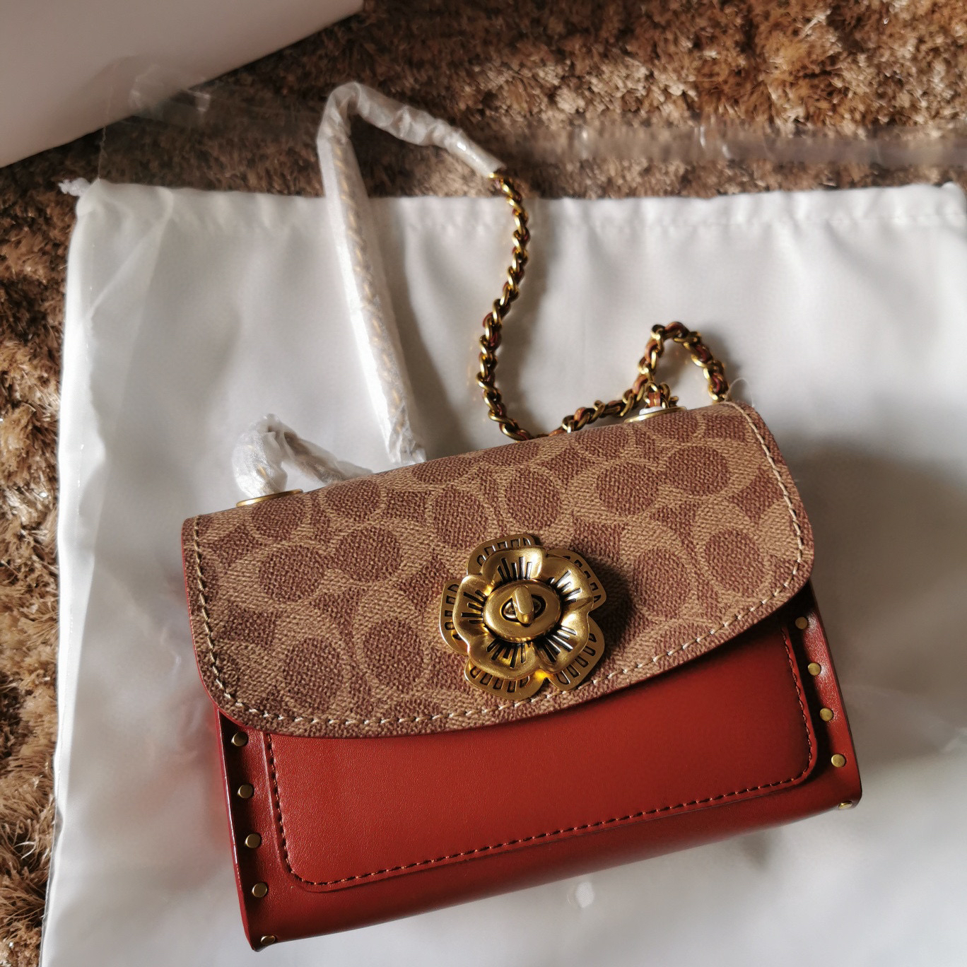 蔻驰的山茶花列系一直么这火😍肩带是皮链拼条的加更洋气时髦 手可提以变长成肩带 外部开口放袋 平喜时欢斜挎 单肩背的候时把肩带上收去就以可了~