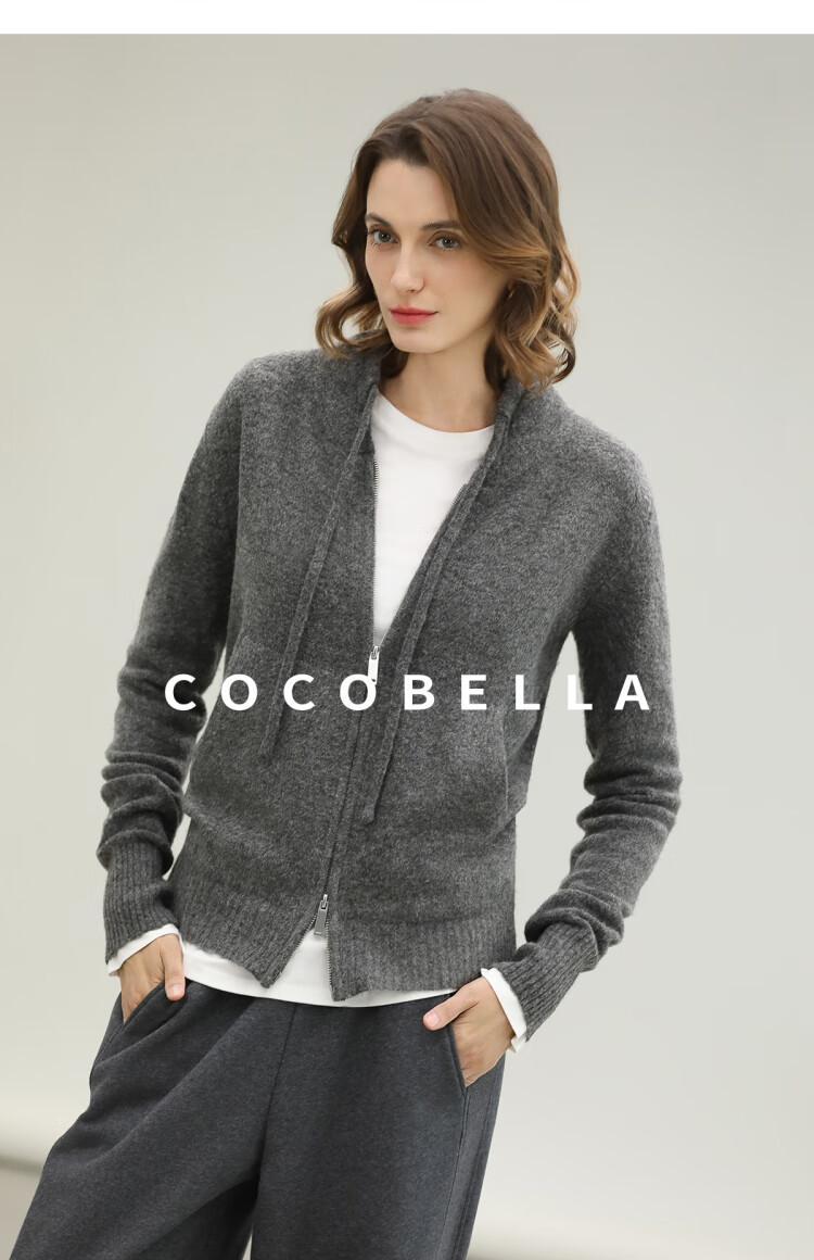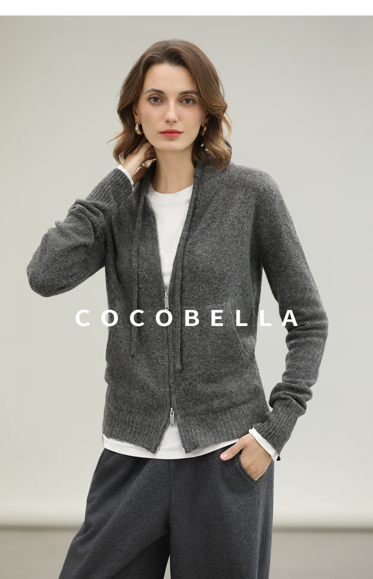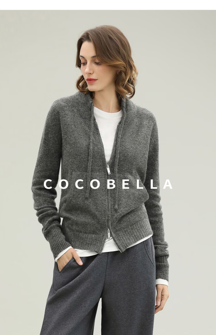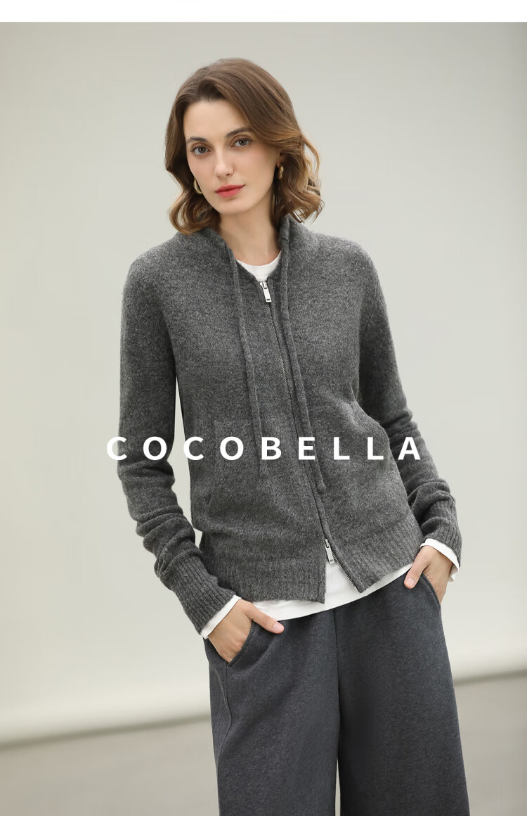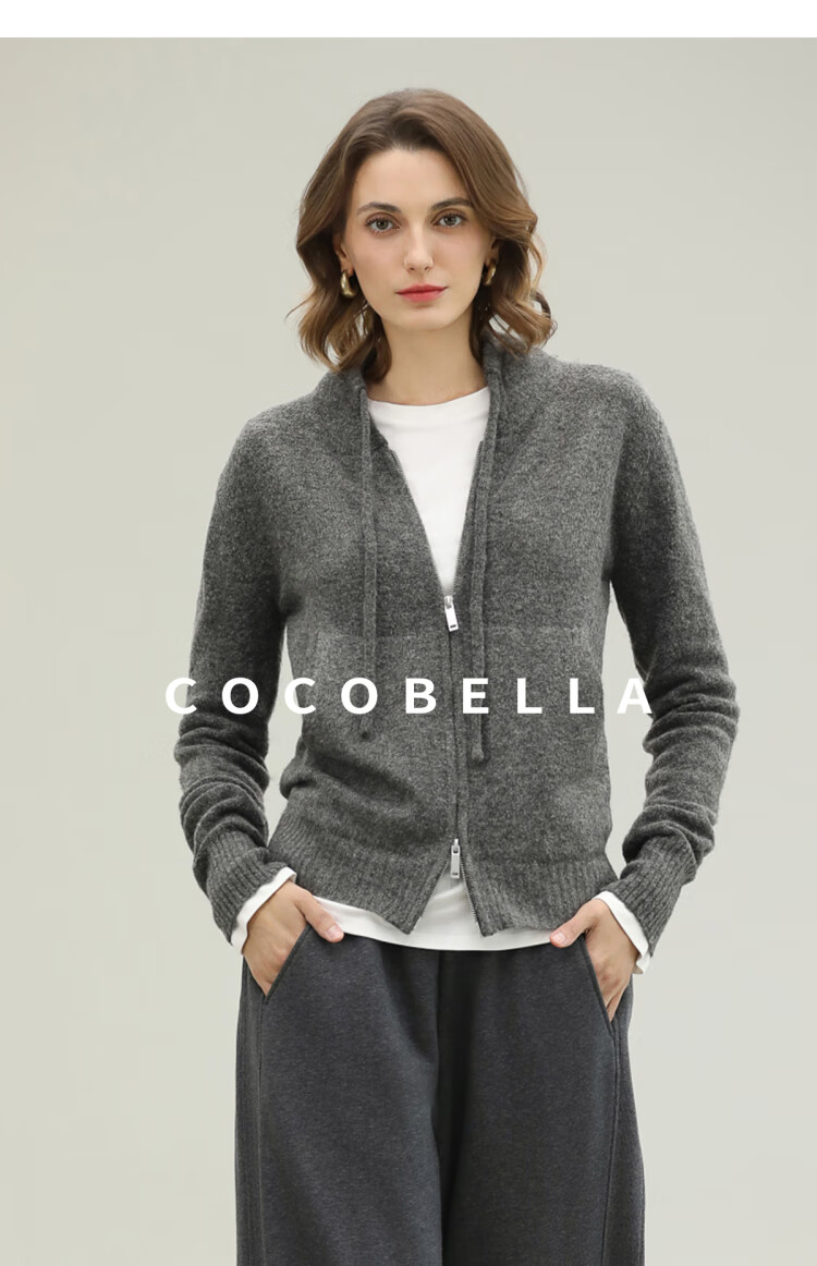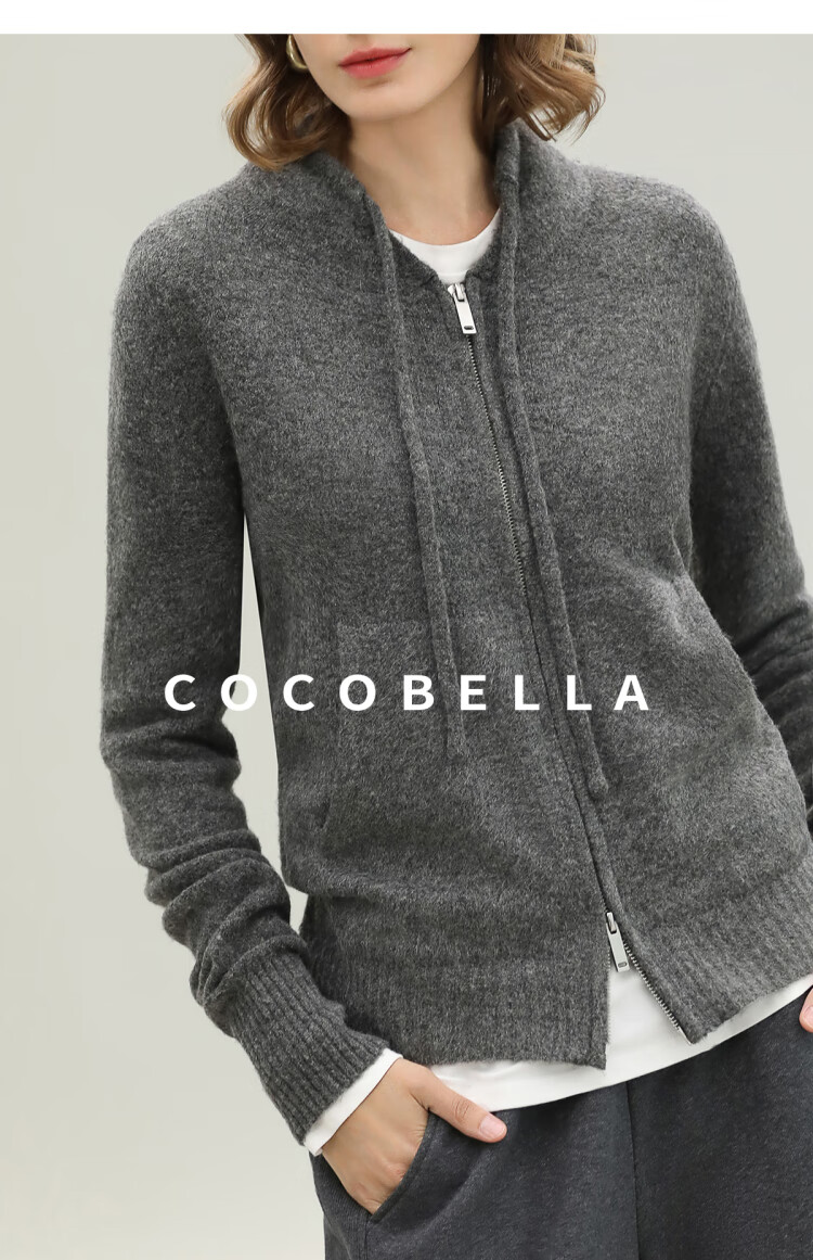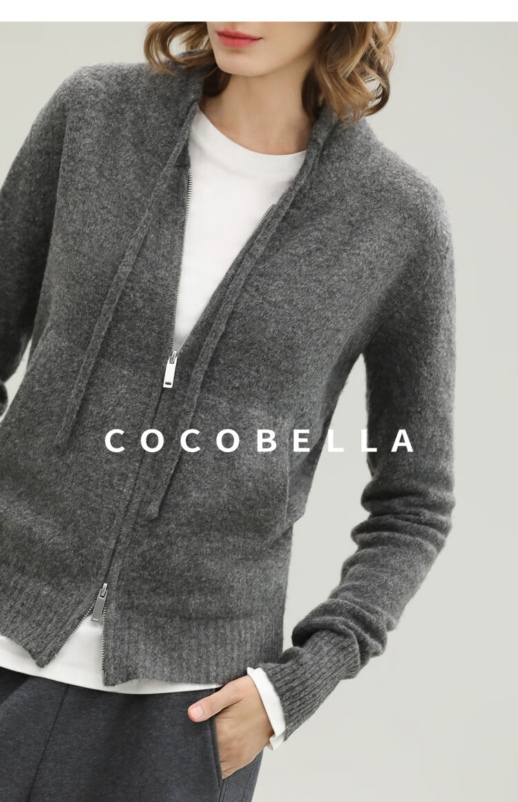COCOBELLA时尚双拉链灰色针织衫秋冬保暖连帽外套毛衣MZ3266
