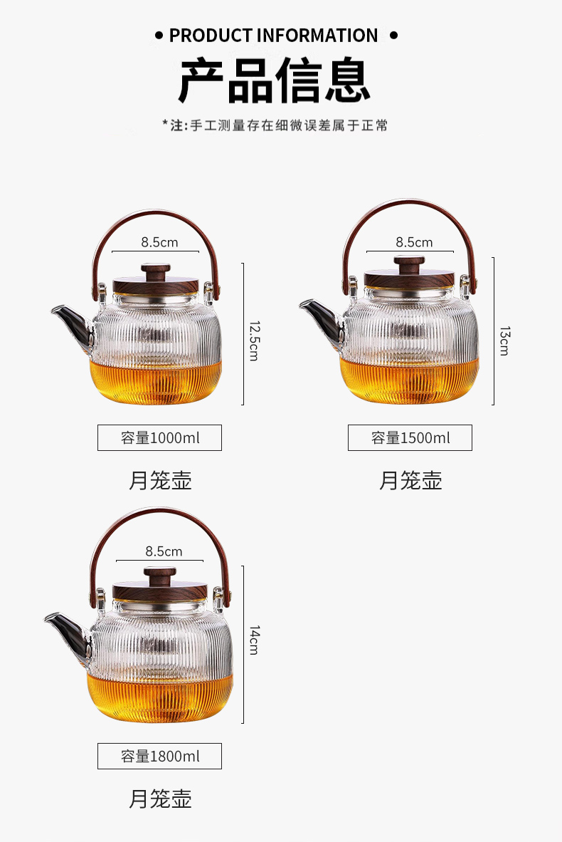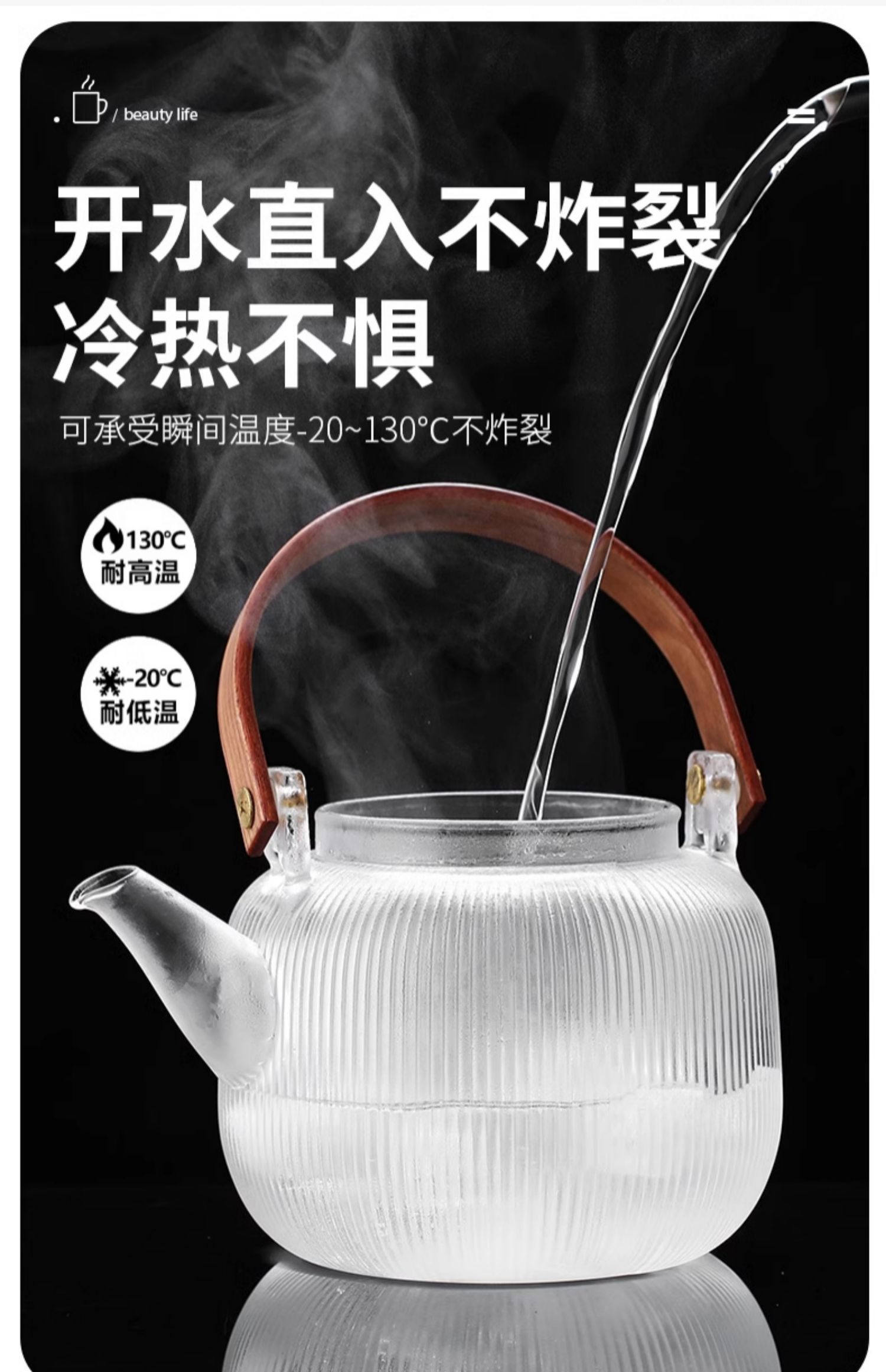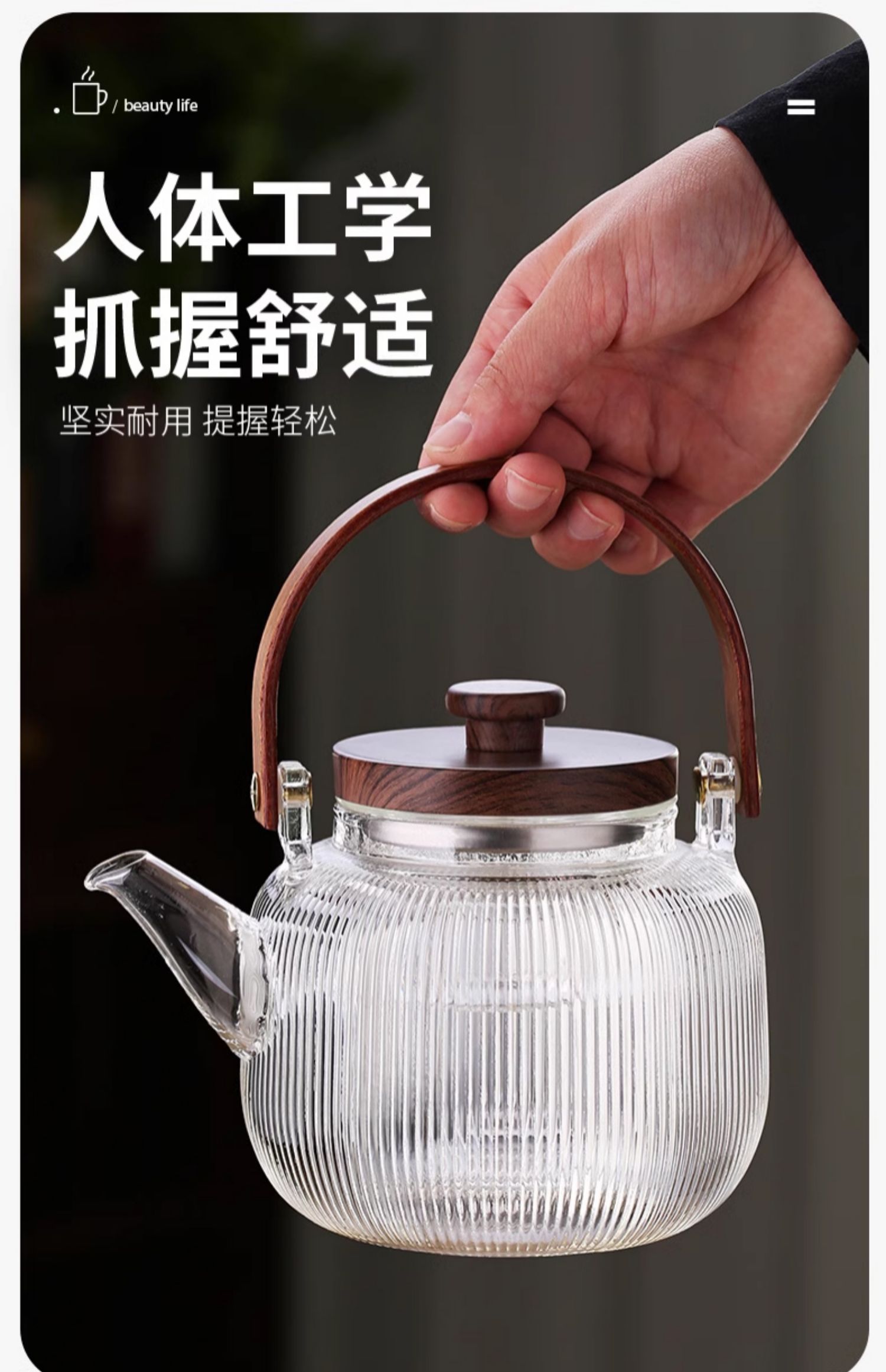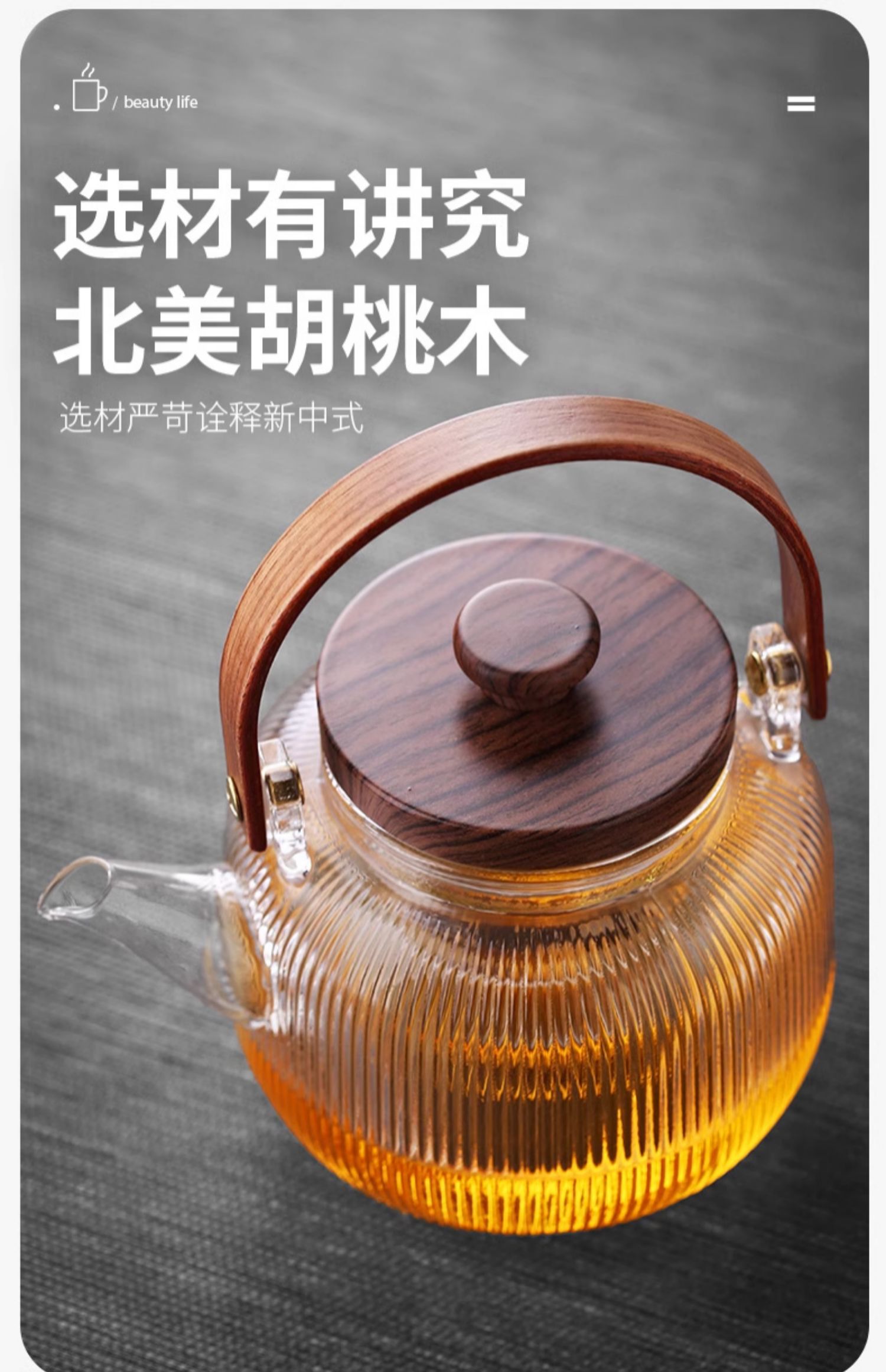 新中式煮茶壶新品高硼硅玻璃茶壶胡桃木盖子泡茶壶新款新品竖条纹提梁壶煮茶器
