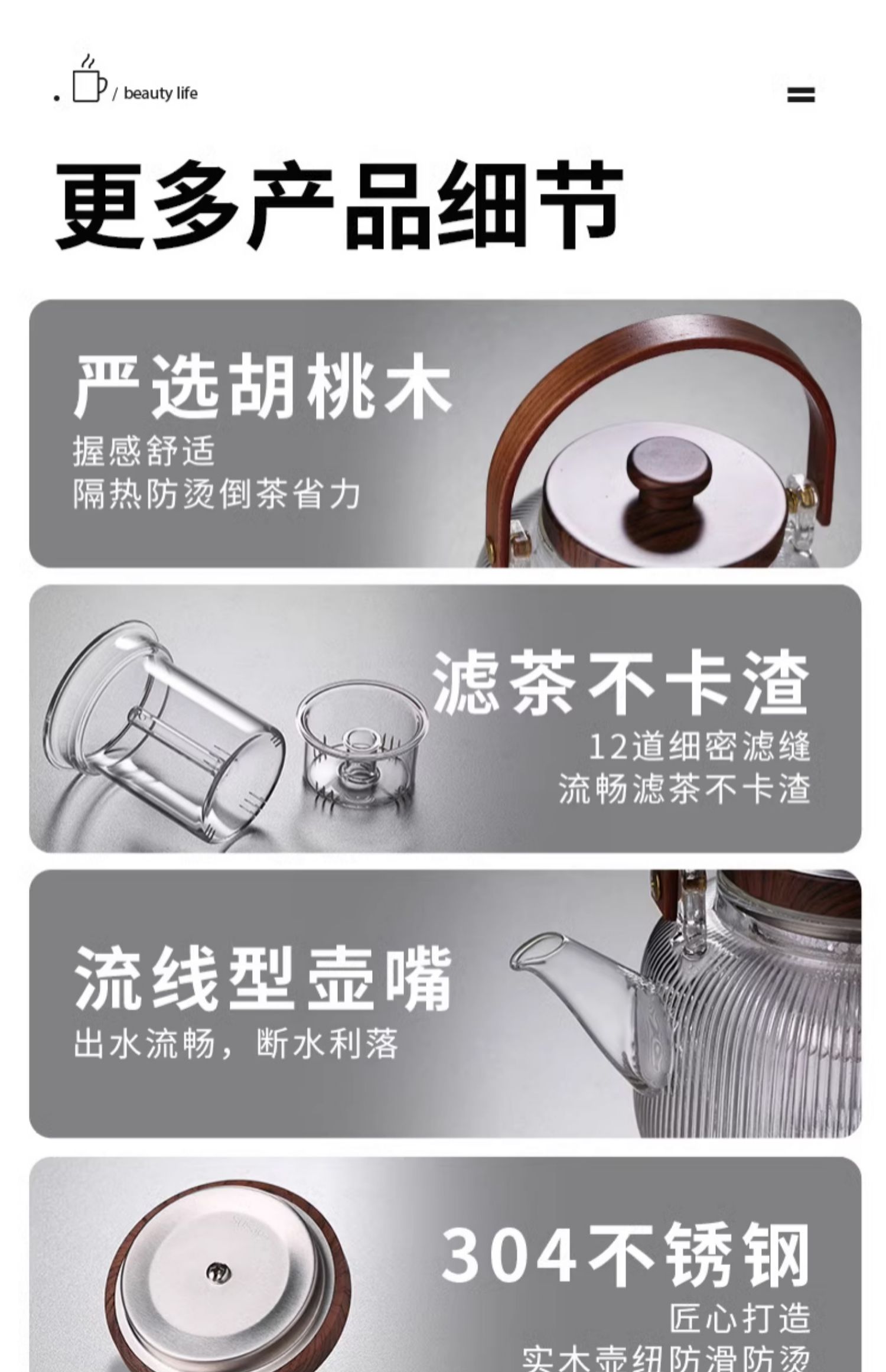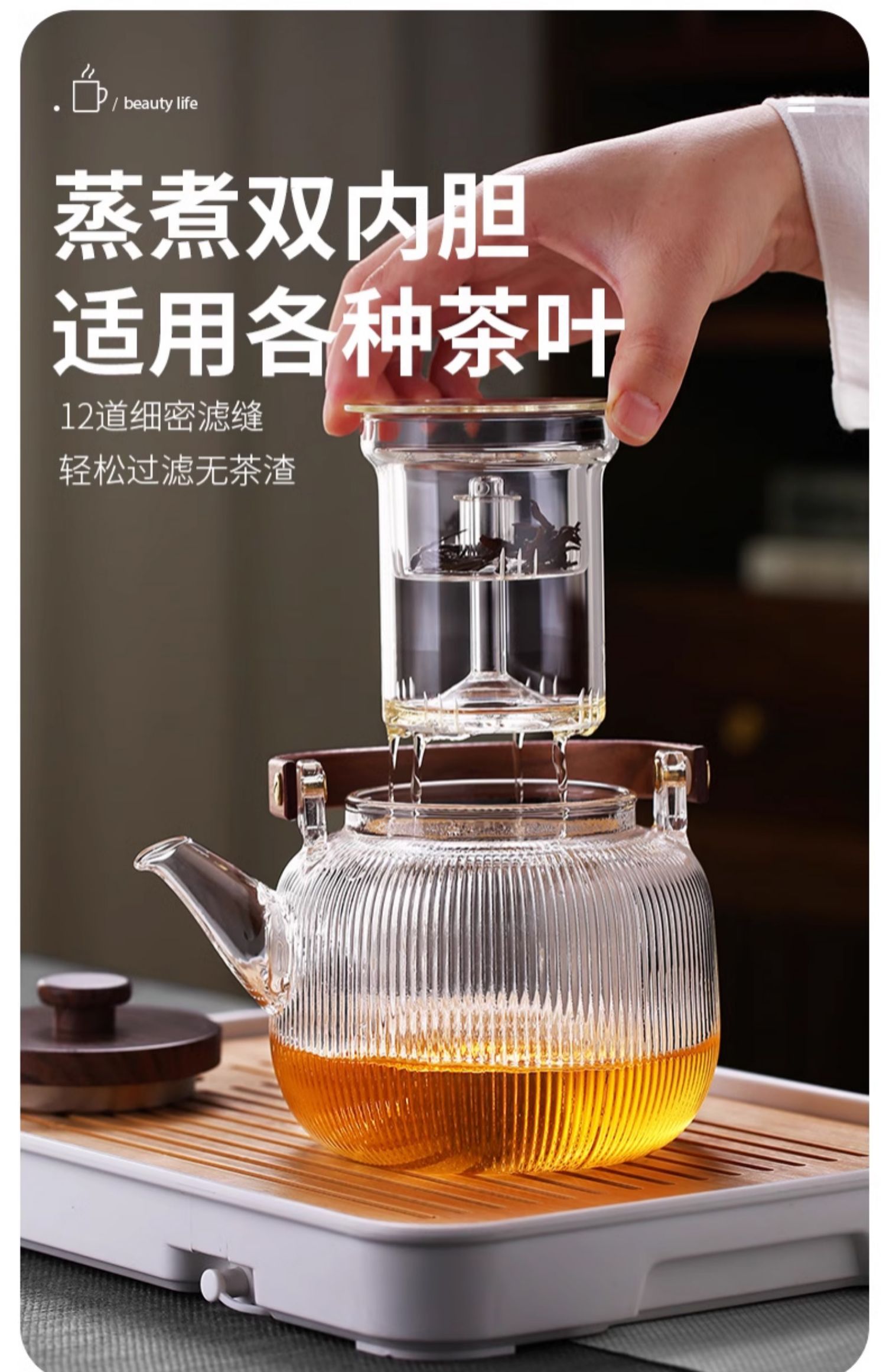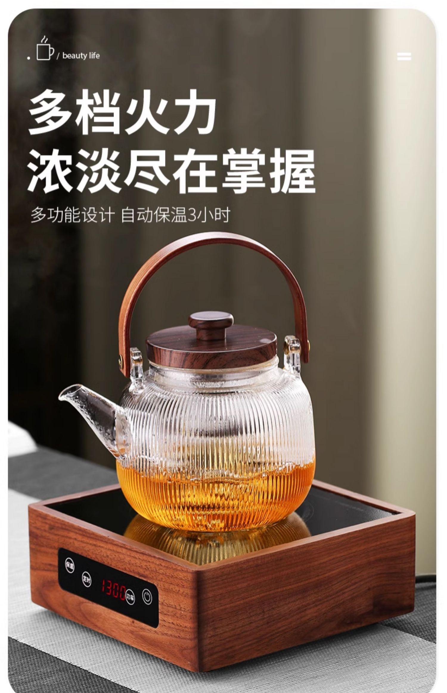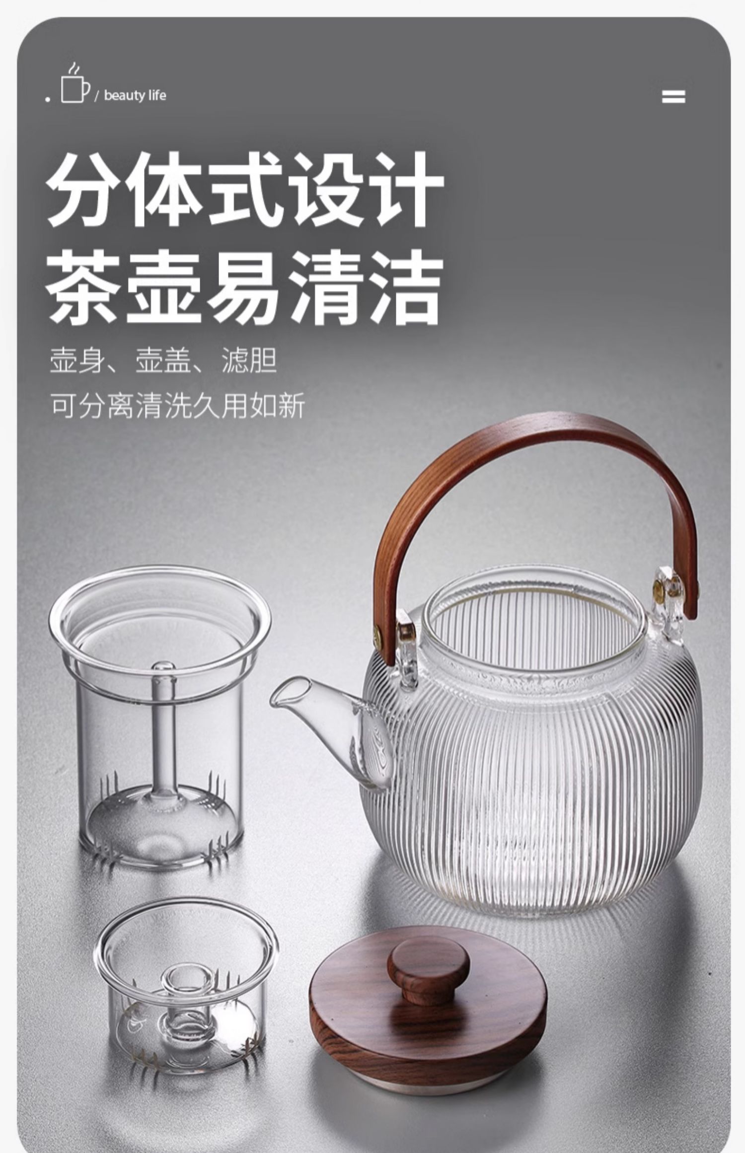 新中式煮茶壶新品高硼硅玻璃茶壶胡桃木盖子泡茶壶新款新品竖条纹提梁壶煮茶器