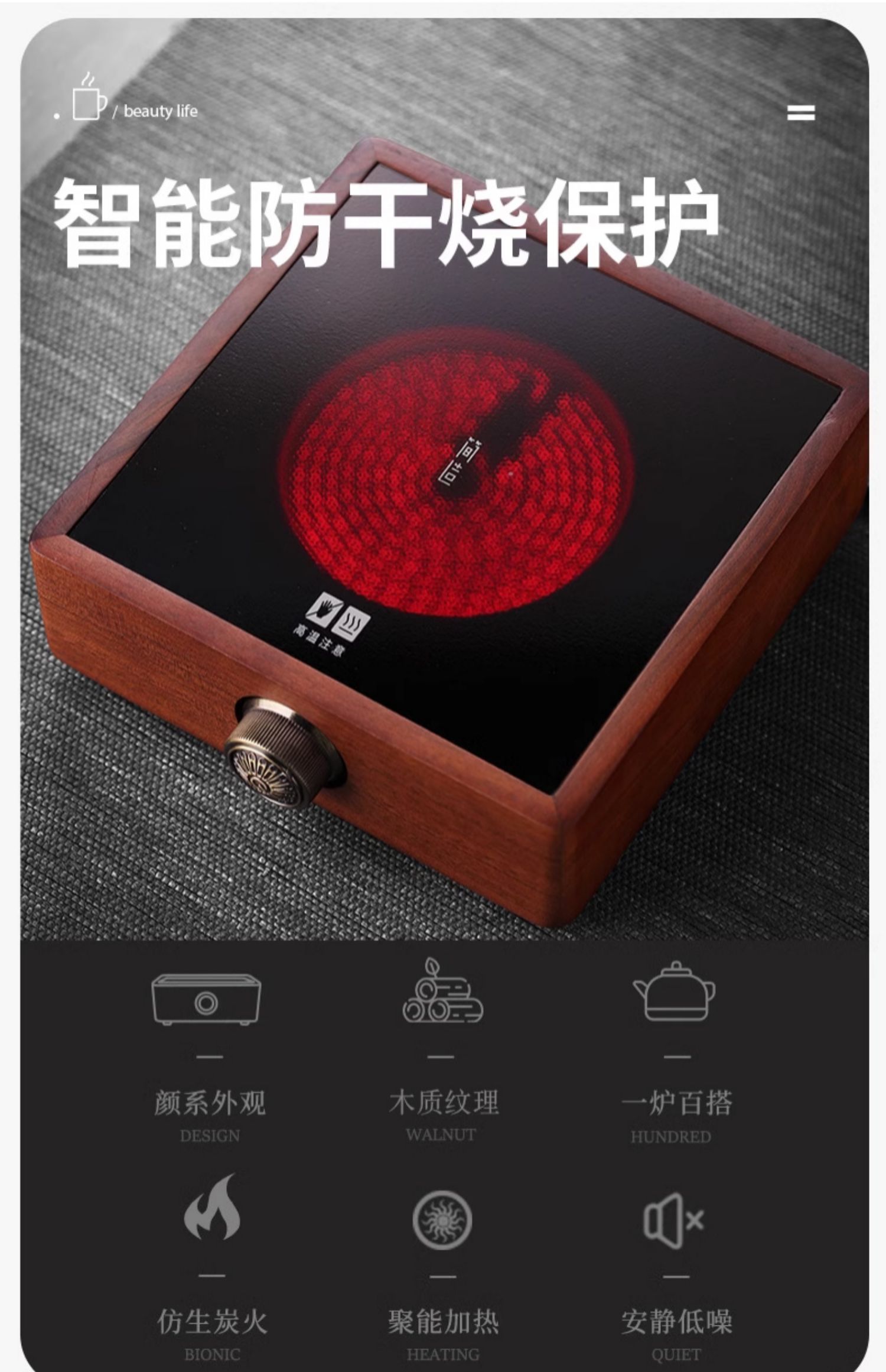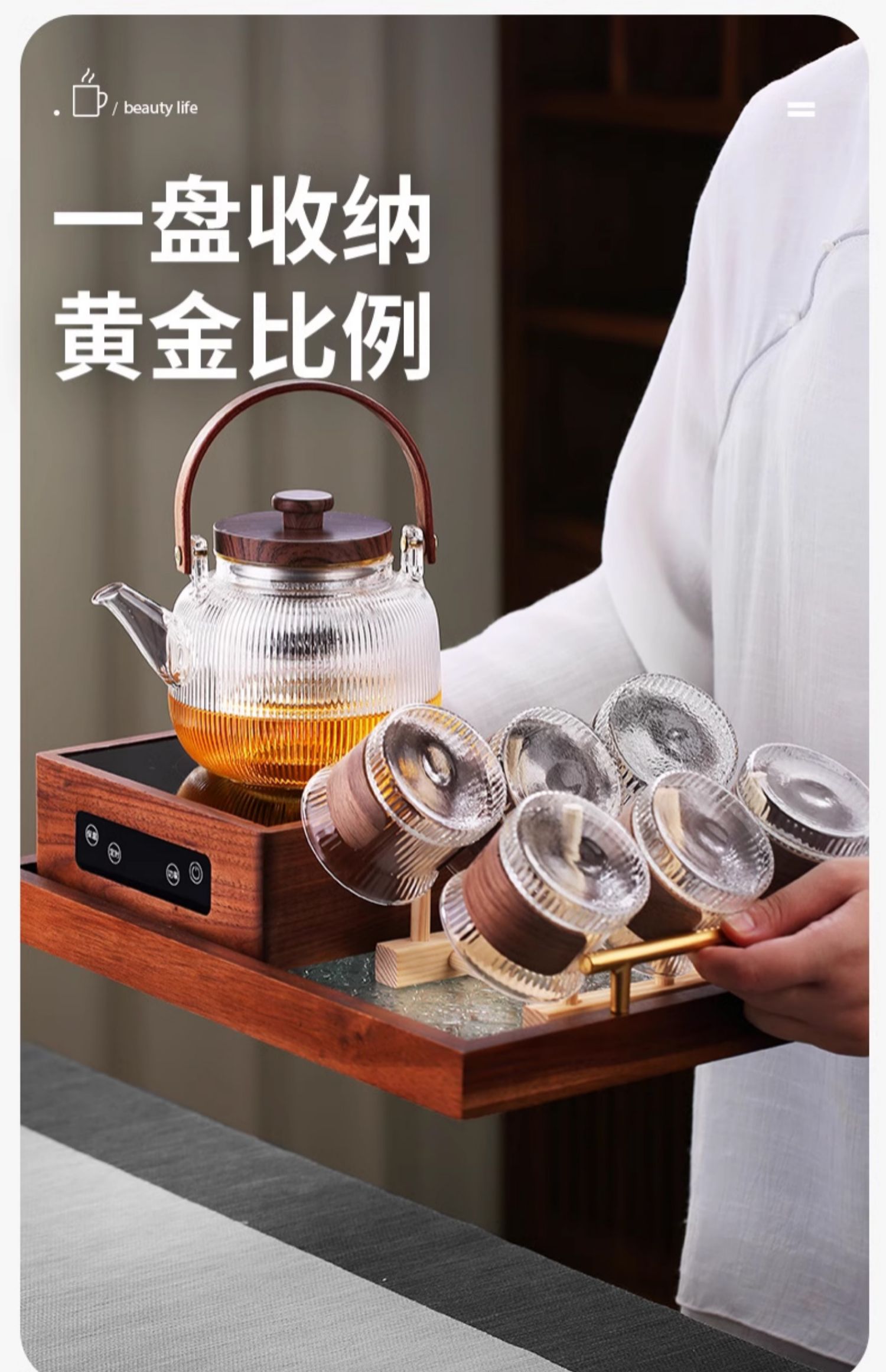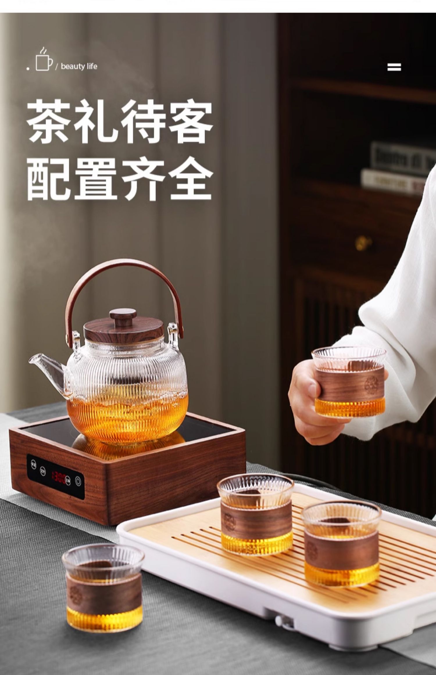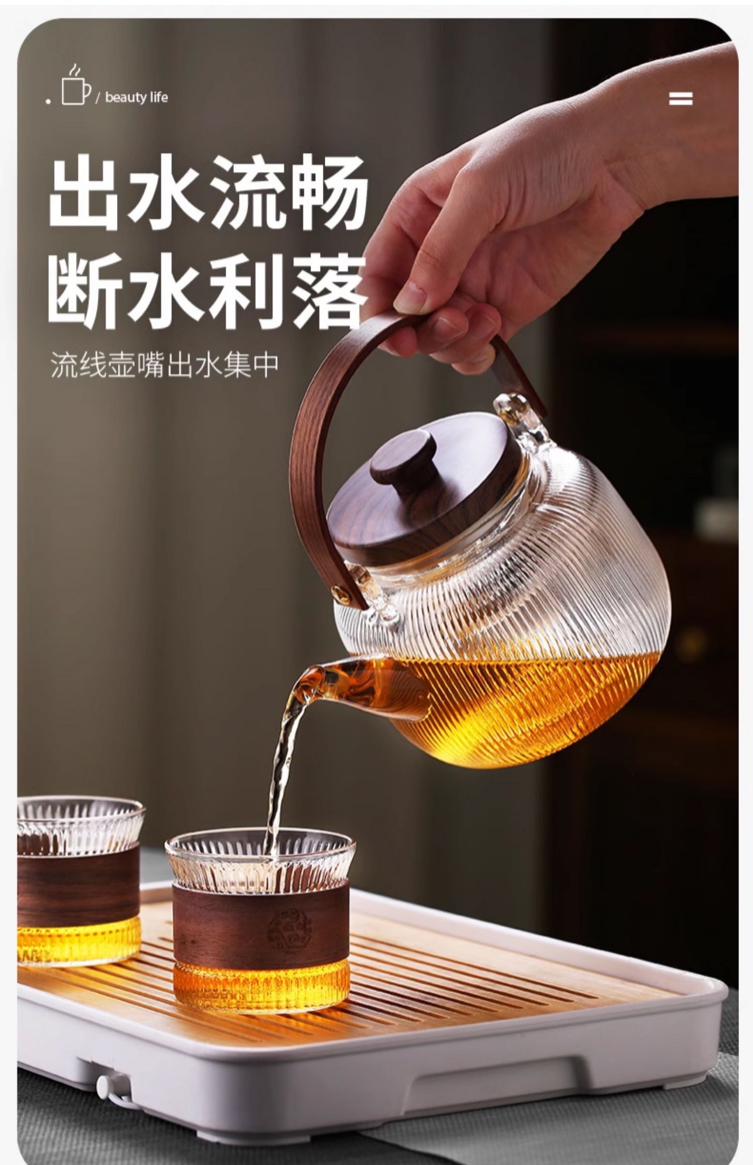 新中式煮茶壶新品高硼硅玻璃茶壶胡桃木盖子泡茶壶新款新品竖条纹提梁壶煮茶器