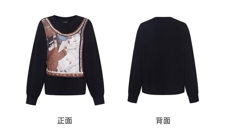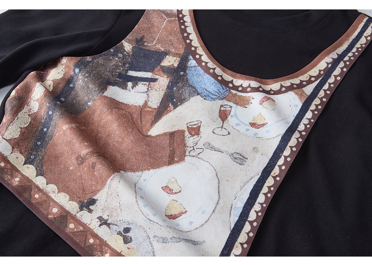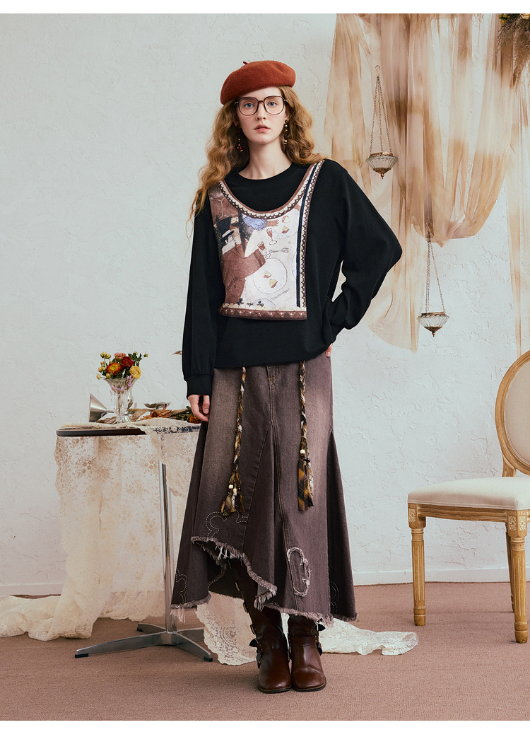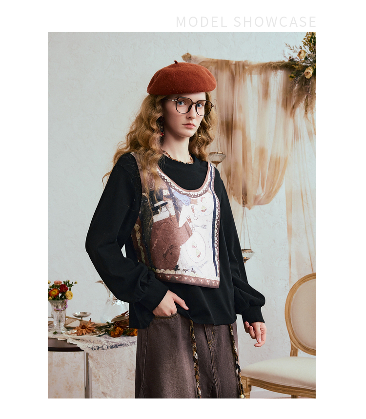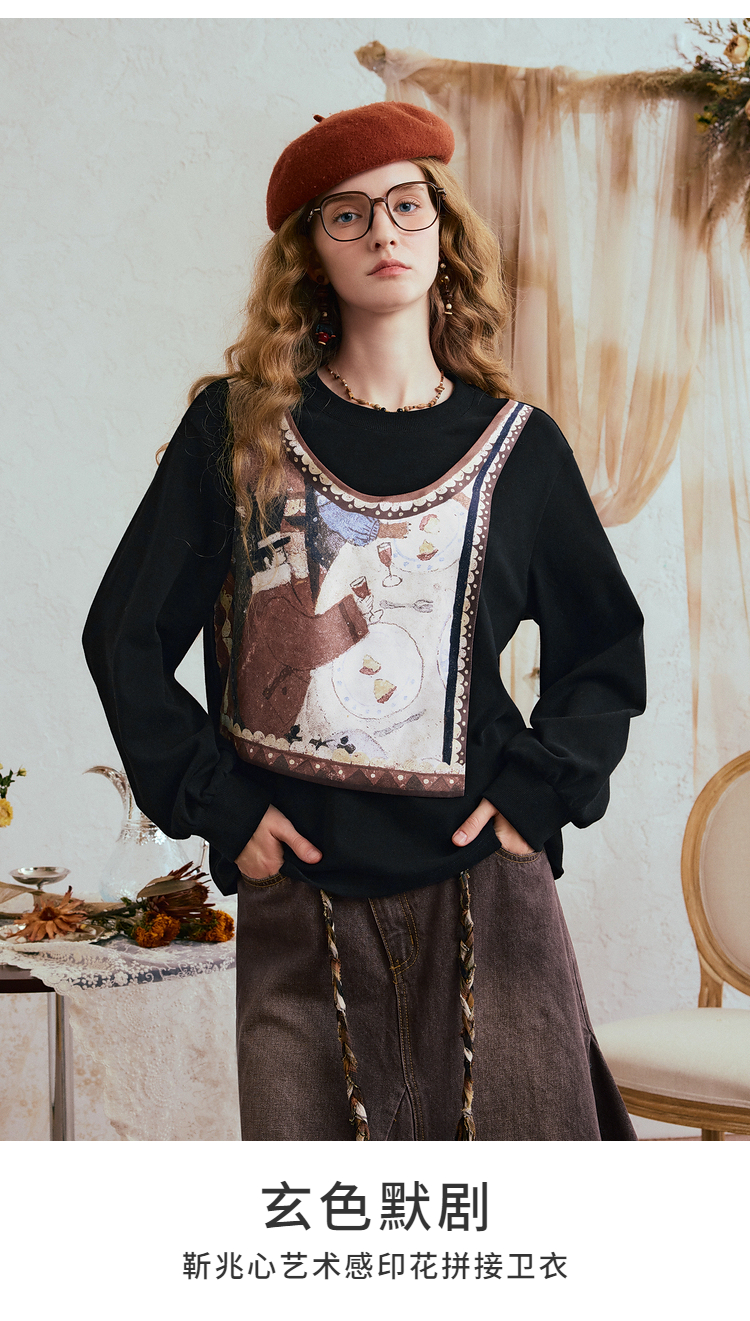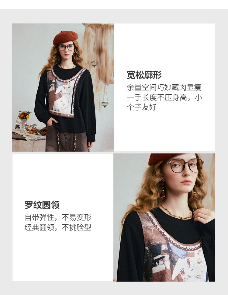 两三事 玄色默剧 2025冬季新款时尚印花拼接假两件长袖t恤女