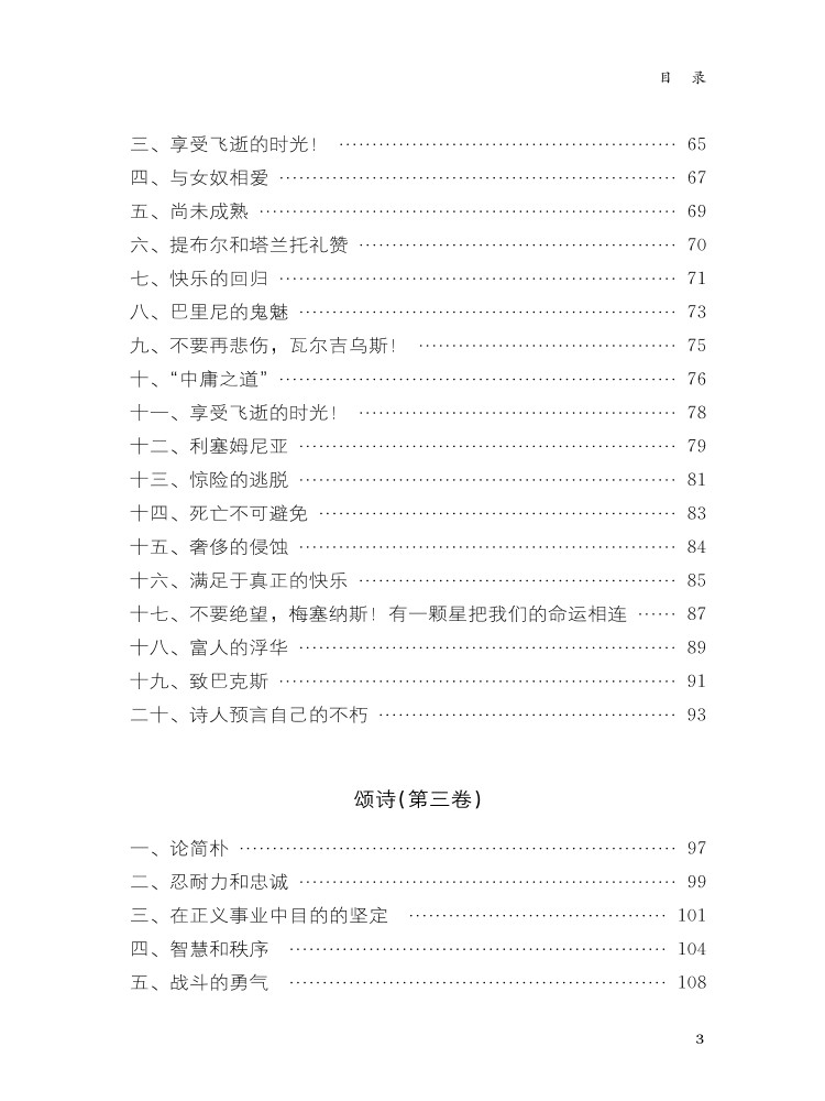 本书依据权威英译本翻译了古罗马著名诗人贺拉斯的颂诗 103 首、长短句 15 首、讽刺诗 17 首和诗体书简 22 首,内容涉及政治、经济、军事、法律、文学、道德、宗教、哲学、文化、艺术、宴饮、友谊和爱情等等。贺拉斯的诗歌不仅是研究古罗马文学的重要文献,也是研究古罗马从共和国末期到帝国初期社会真实状况的珍贵史料。