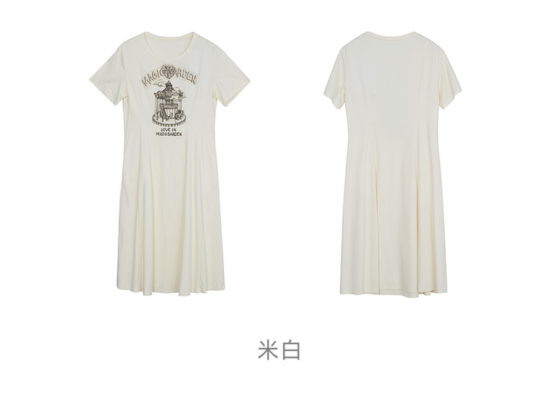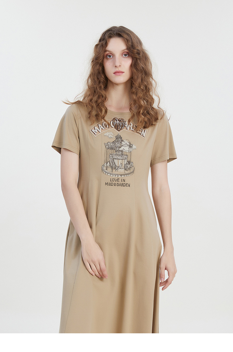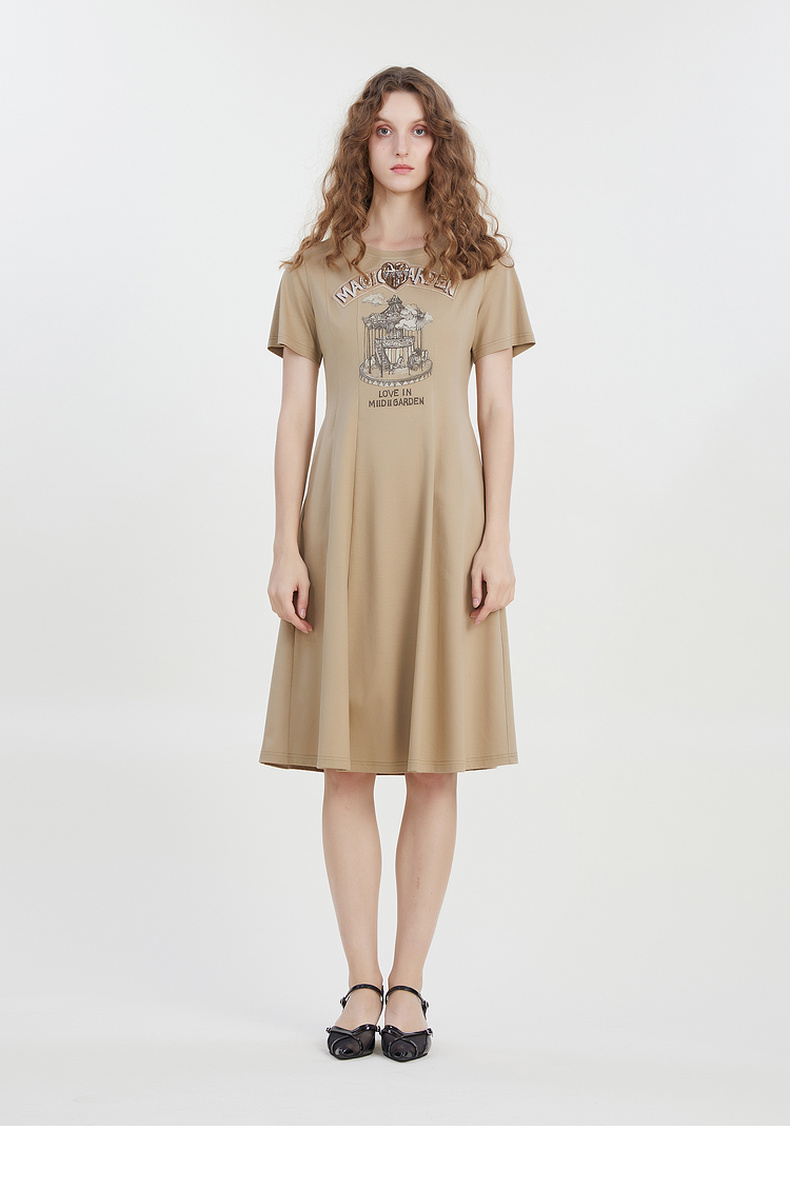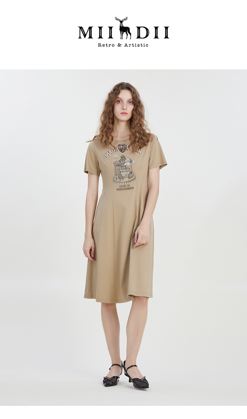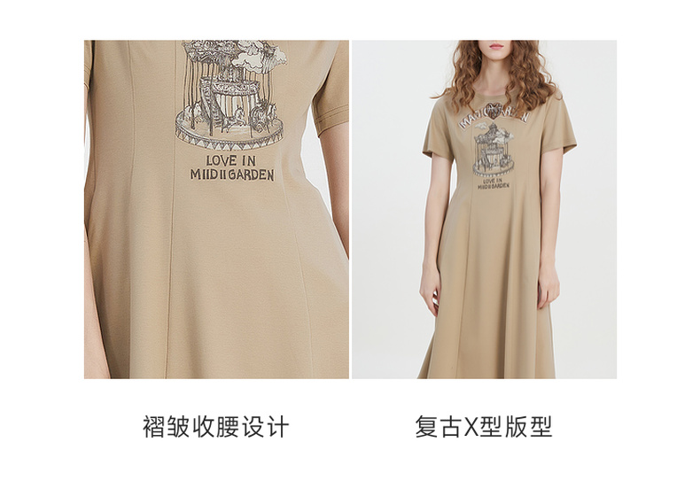 谜底2023夏新款圆领印花短袖连衣裙文艺修身中长裙伞裙232ML0532