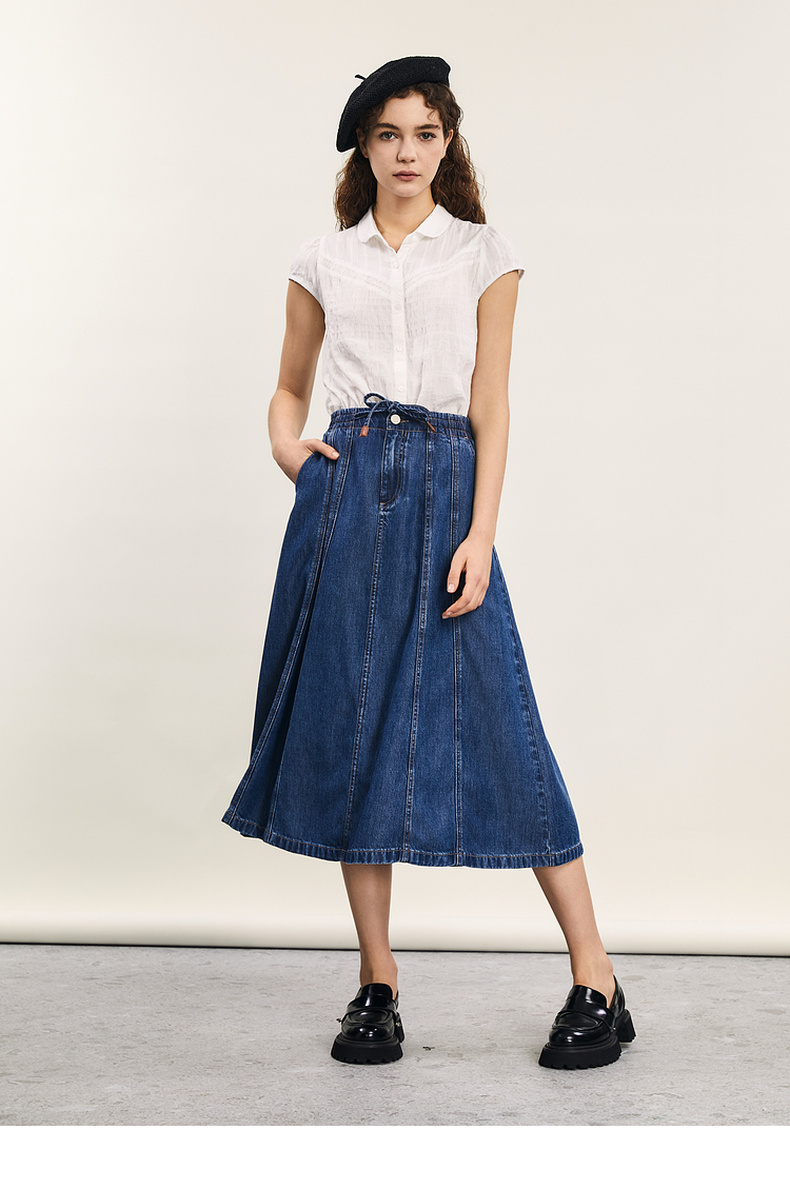 谜底连衣裙2023冬新款复古提花拼接牛仔假两件中长裙女234ML1598