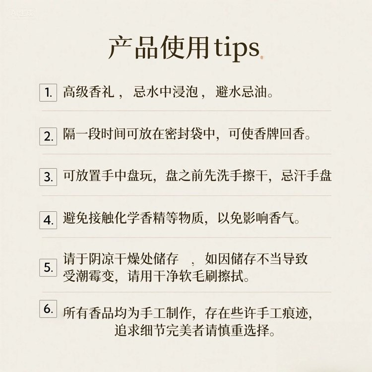 天然合香制品遇水或大量汗水会迅速软化、变形,甚至开裂。请务必在洗漱、洗澡、游泳、做家务前取下并妥善放置于干燥处。