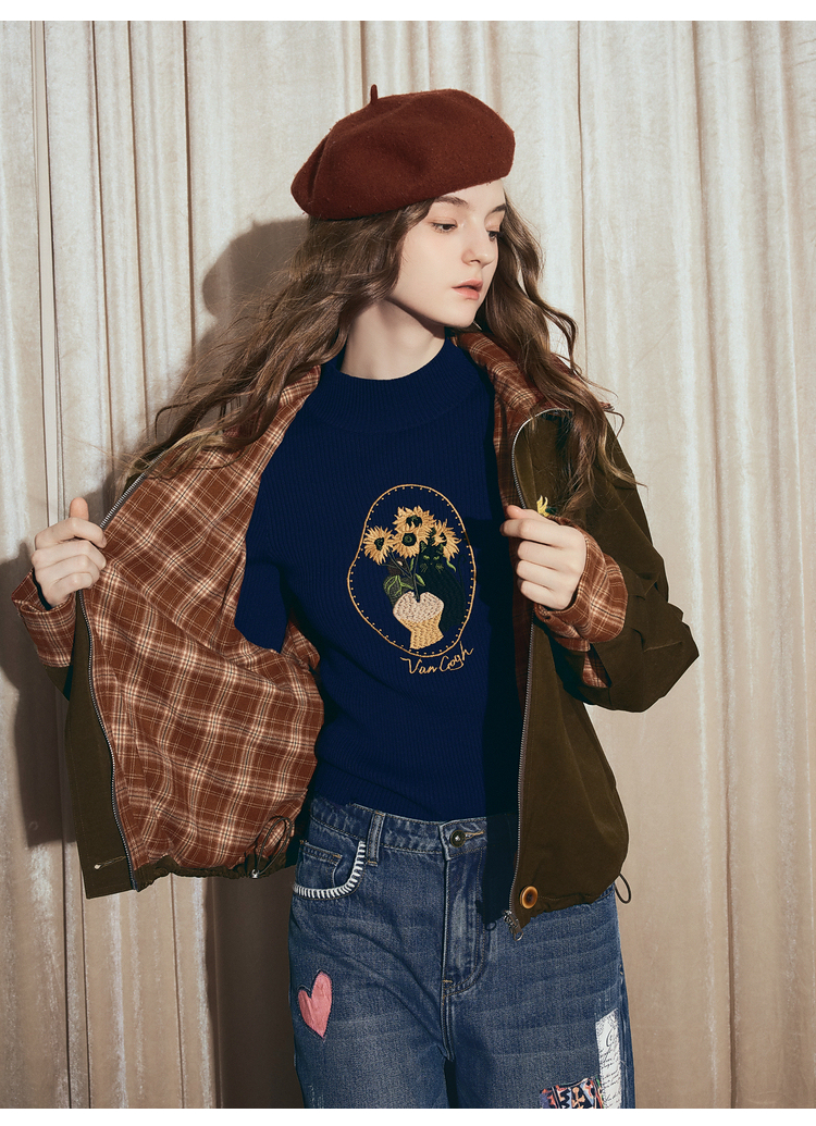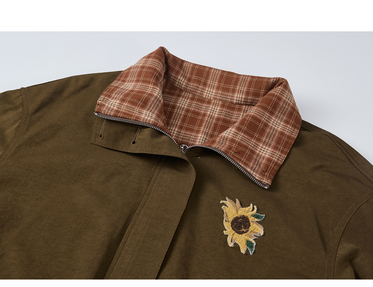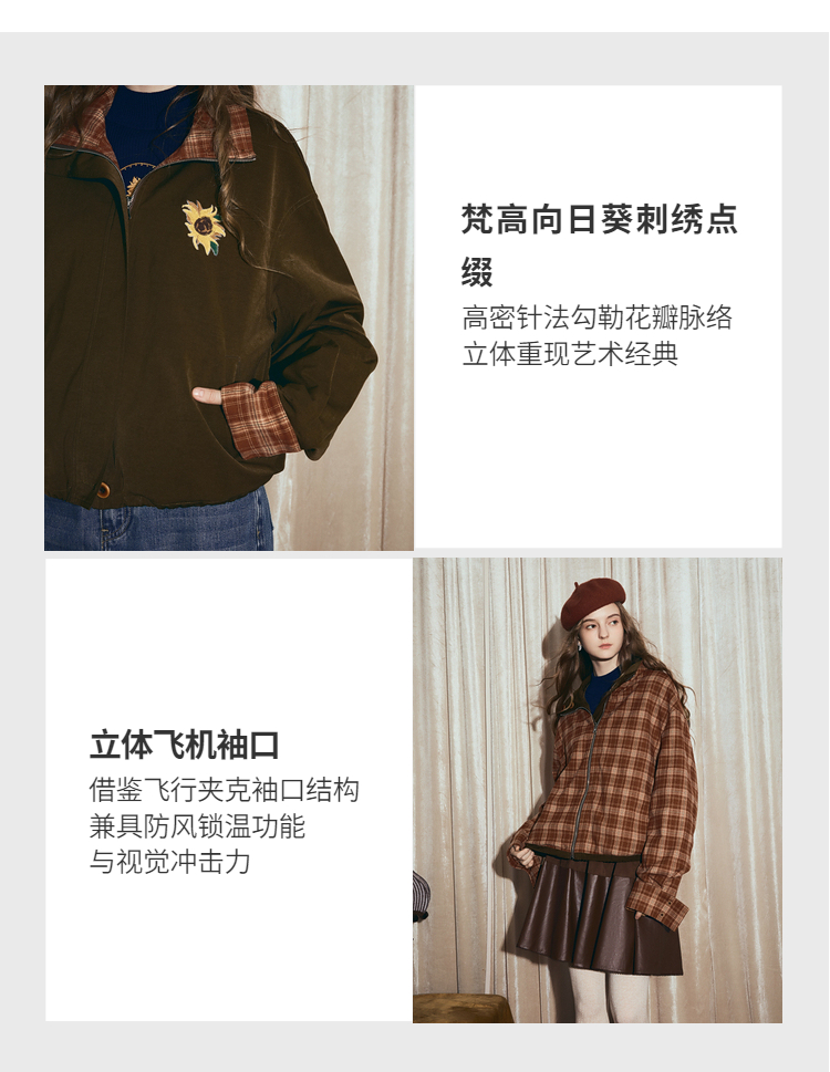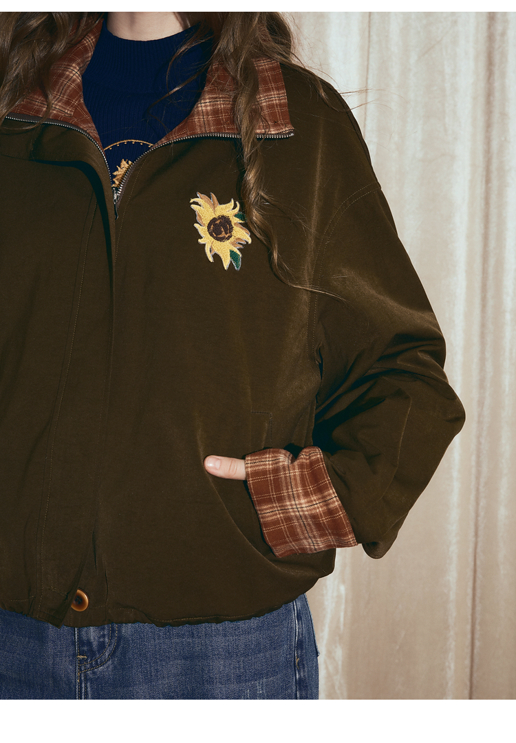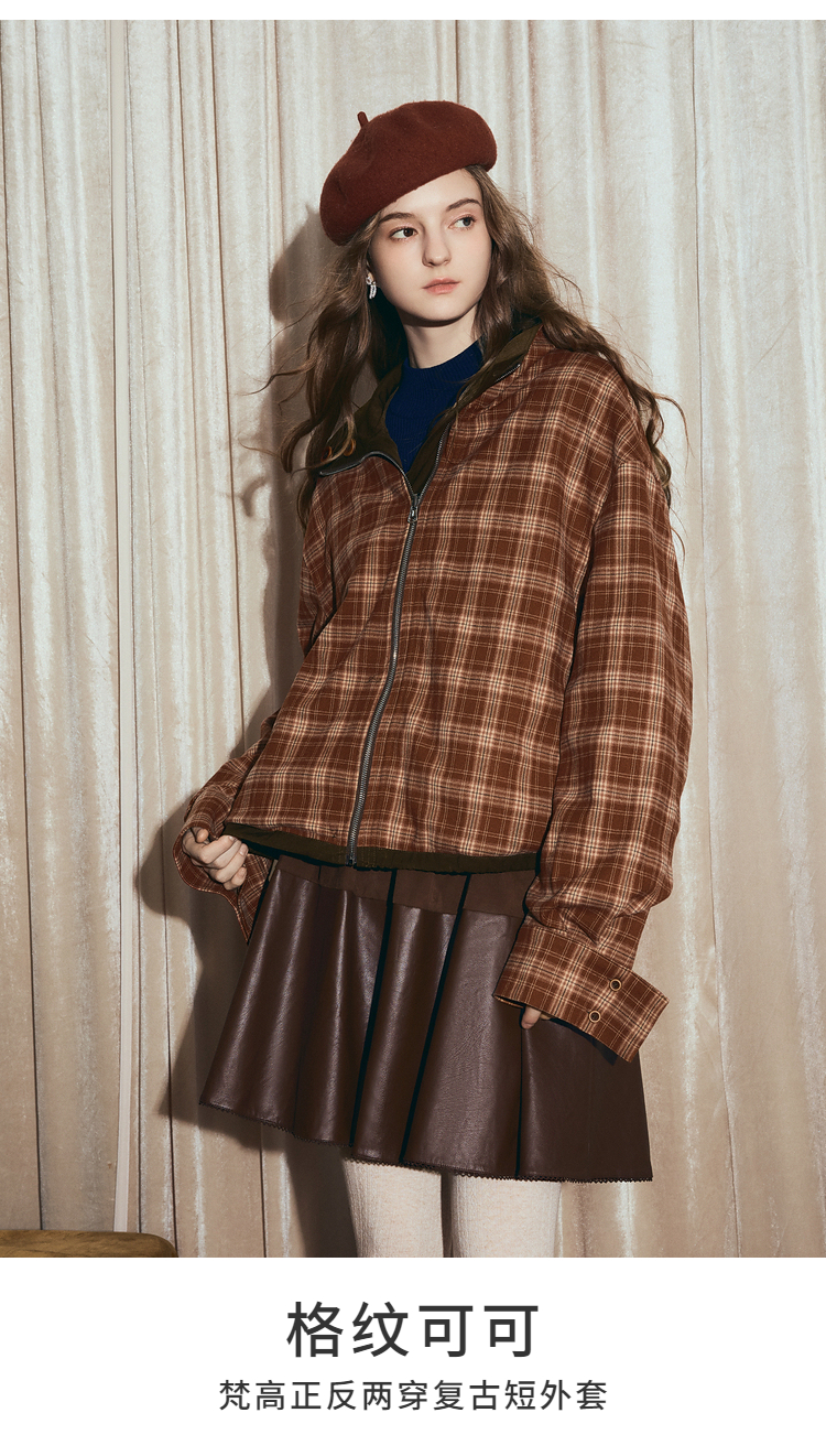 两三事梵高文艺格纹可可2025秋冬新款向日葵刺绣两面穿格子外套女