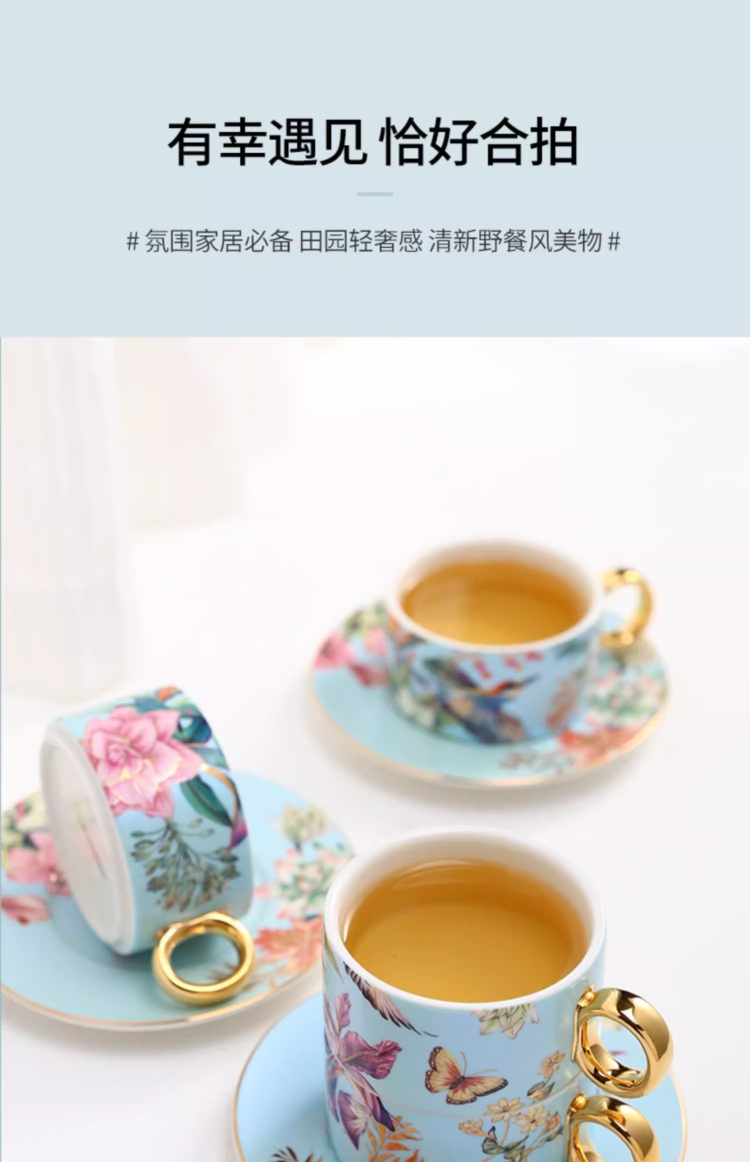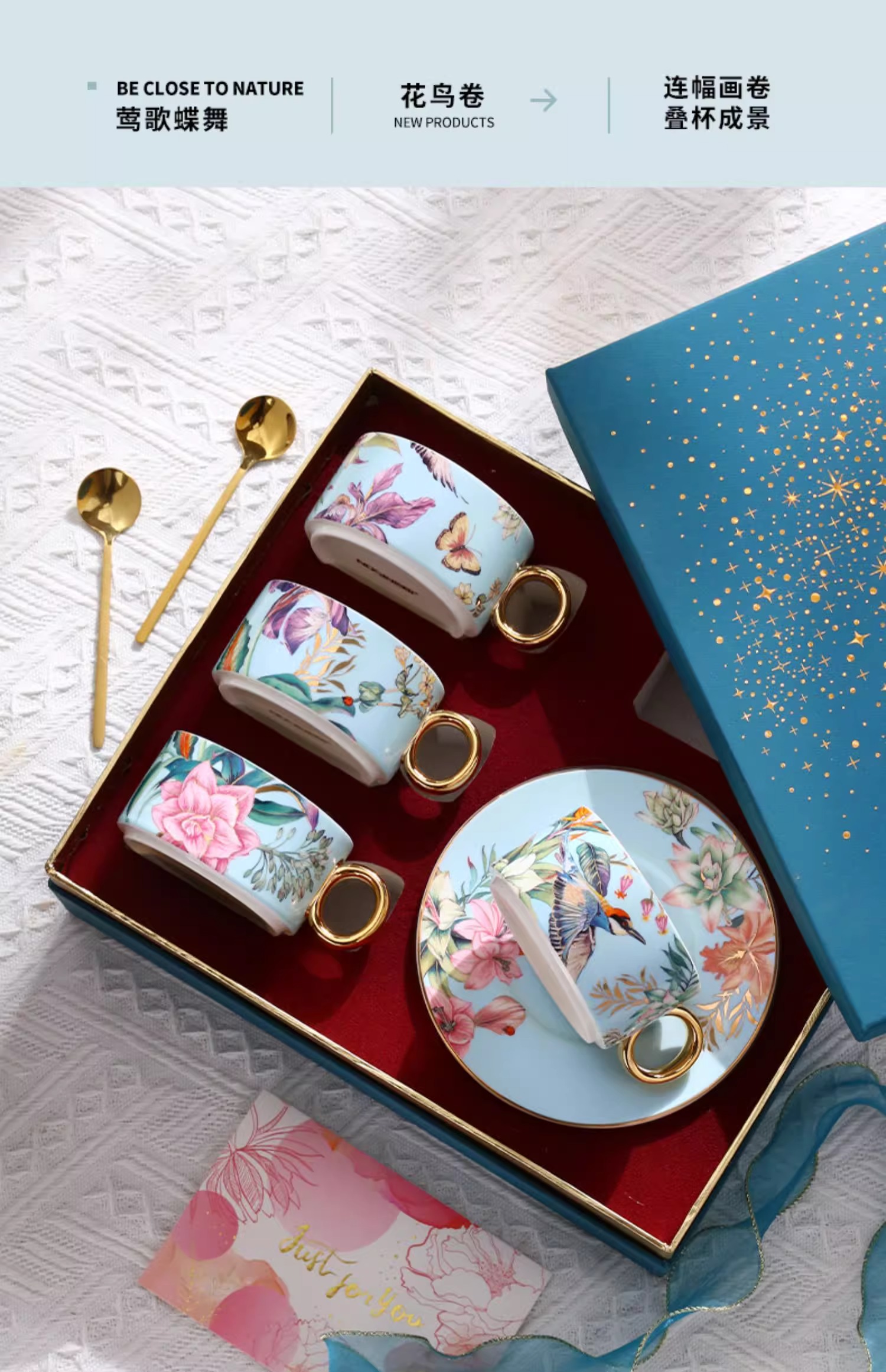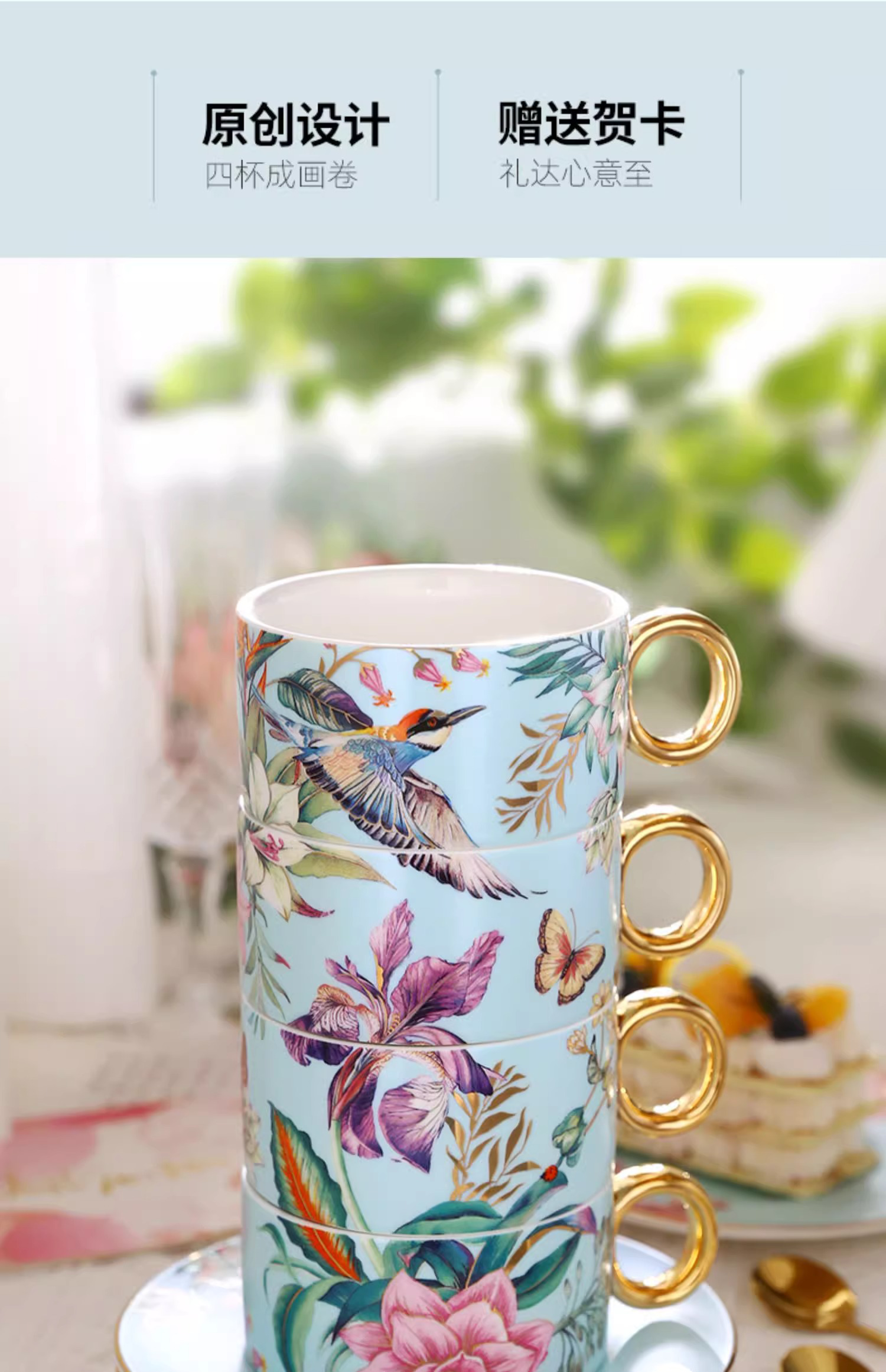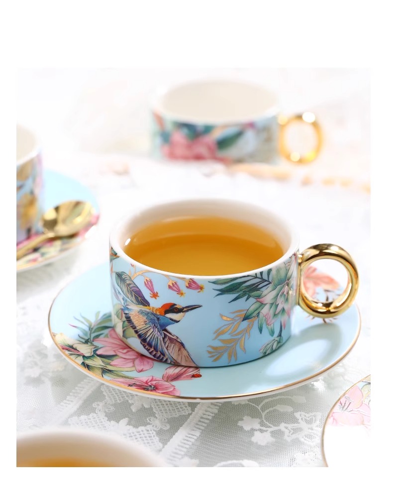 小奢华田园风高级感陶瓷轻奢咖啡杯杯碟套装家用客厅套装杯子水杯NYGWD诺轩叠叠杯莺歌蝶舞4杯碟蓝色礼盒装