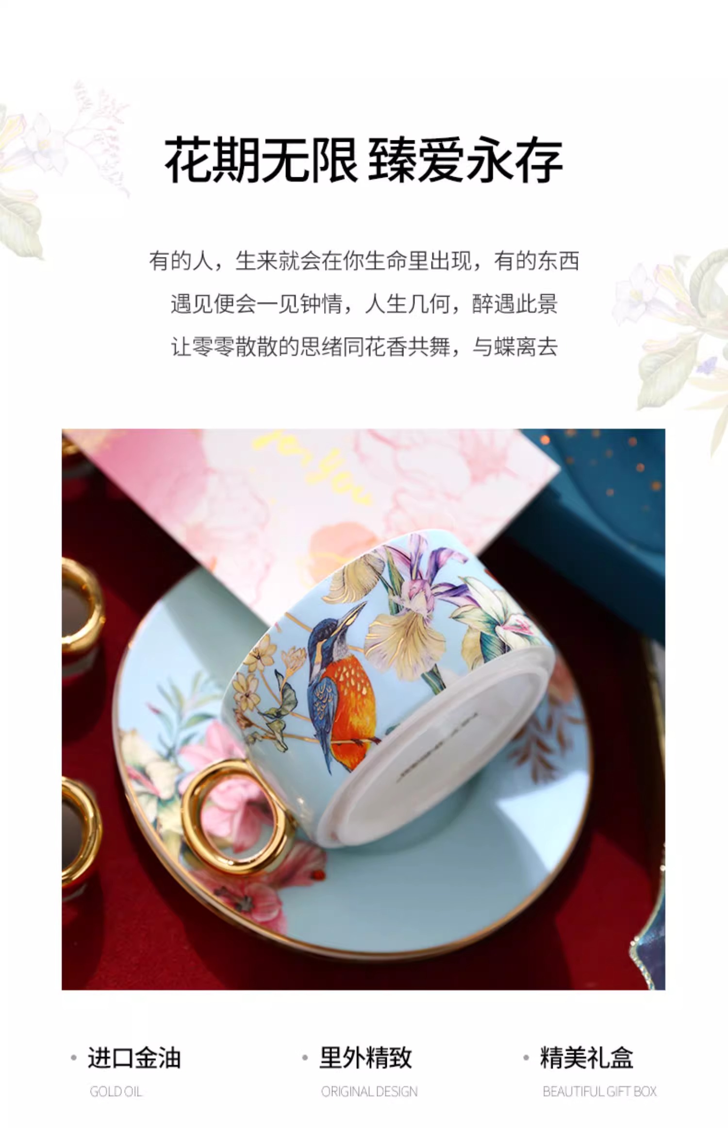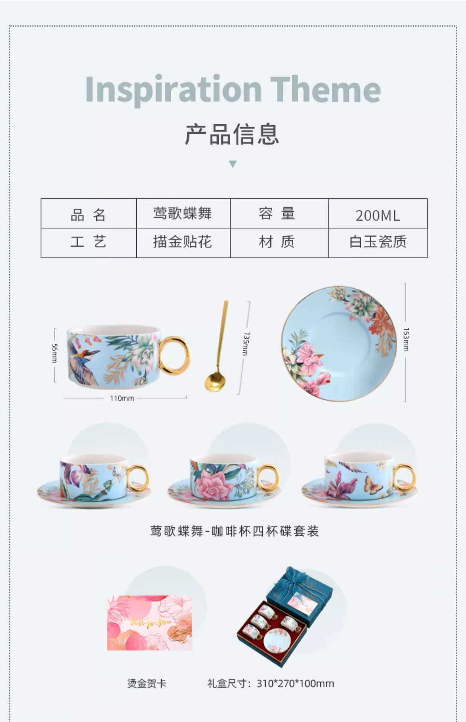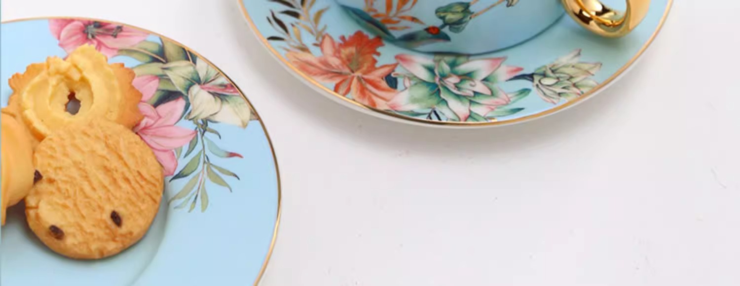 小奢华田园风高级感陶瓷轻奢咖啡杯杯碟套装家用客厅套装杯子水杯NYGWD诺轩叠叠杯莺歌蝶舞4杯碟蓝色礼盒装