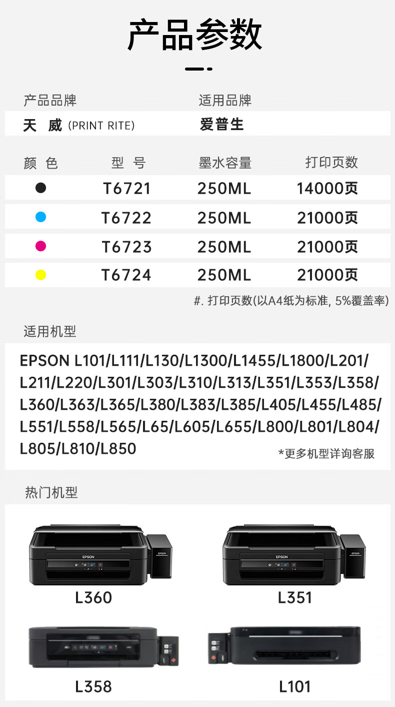 天威 T672墨水250ml 4色套装 适用爱普生打印机墨水EPSON L360 L310 L380 L351 L130 L313 L301 L1300 L383