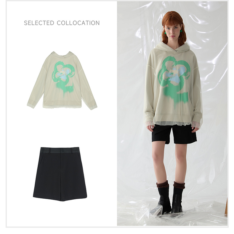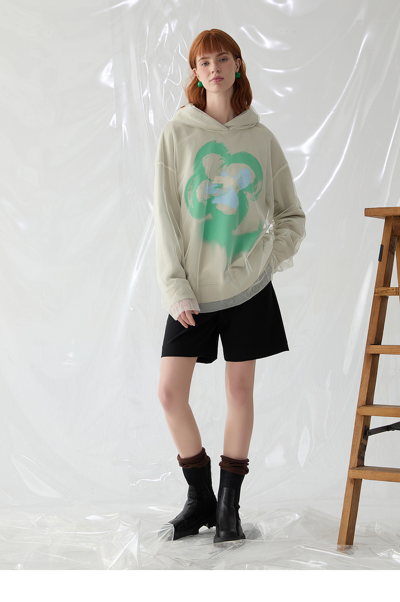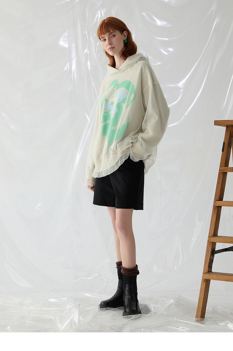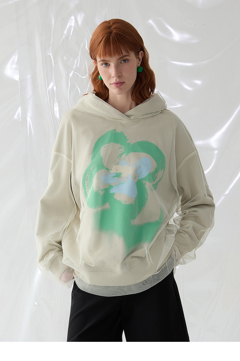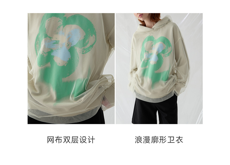 谜底连帽卫衣长袖女2025春新品双层拼接网纱设计感印花251MV0120