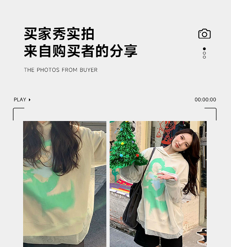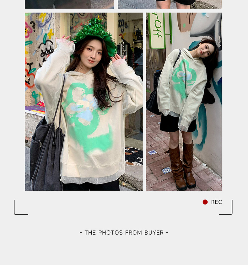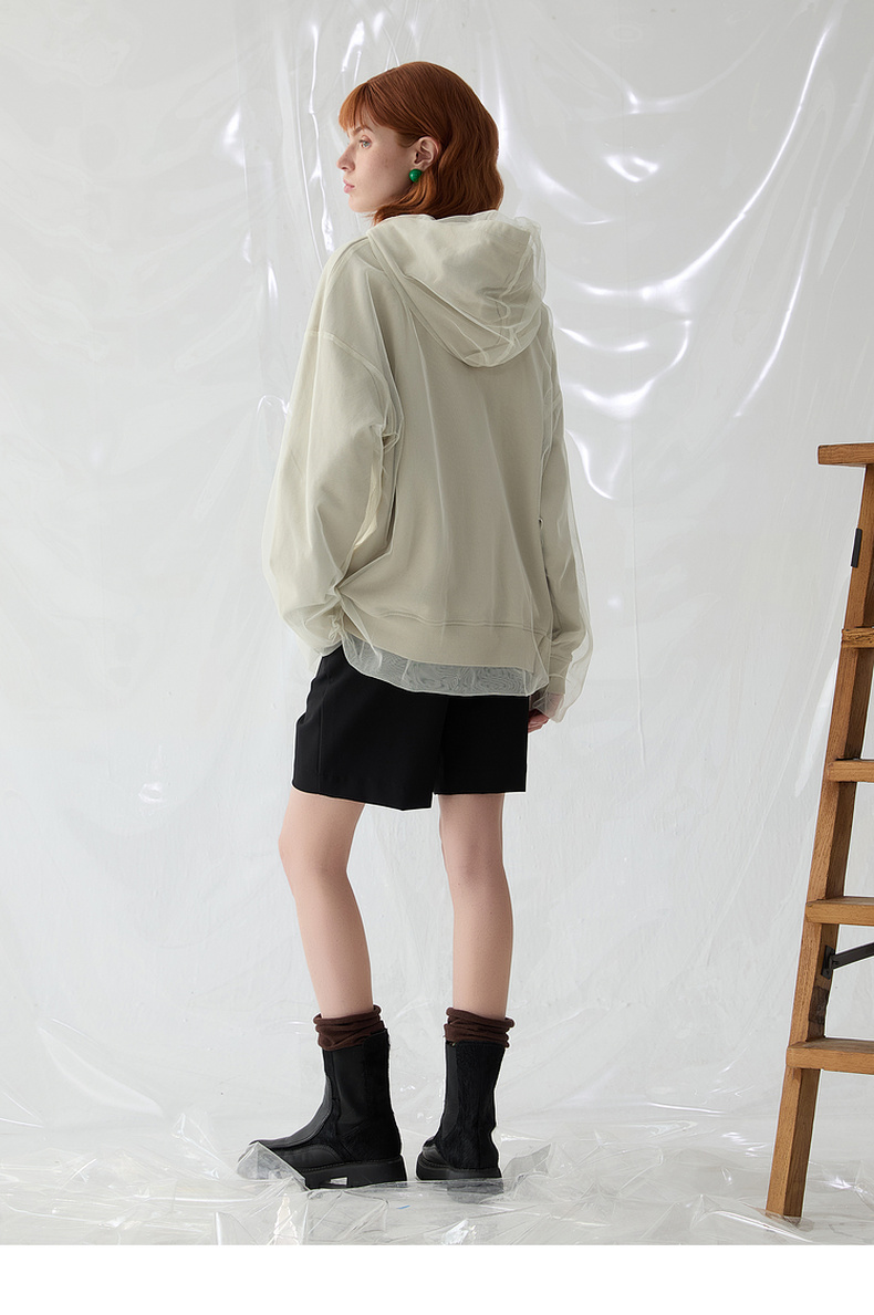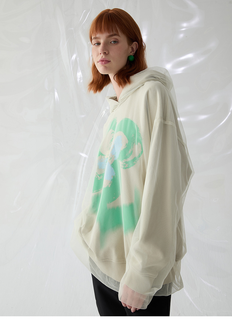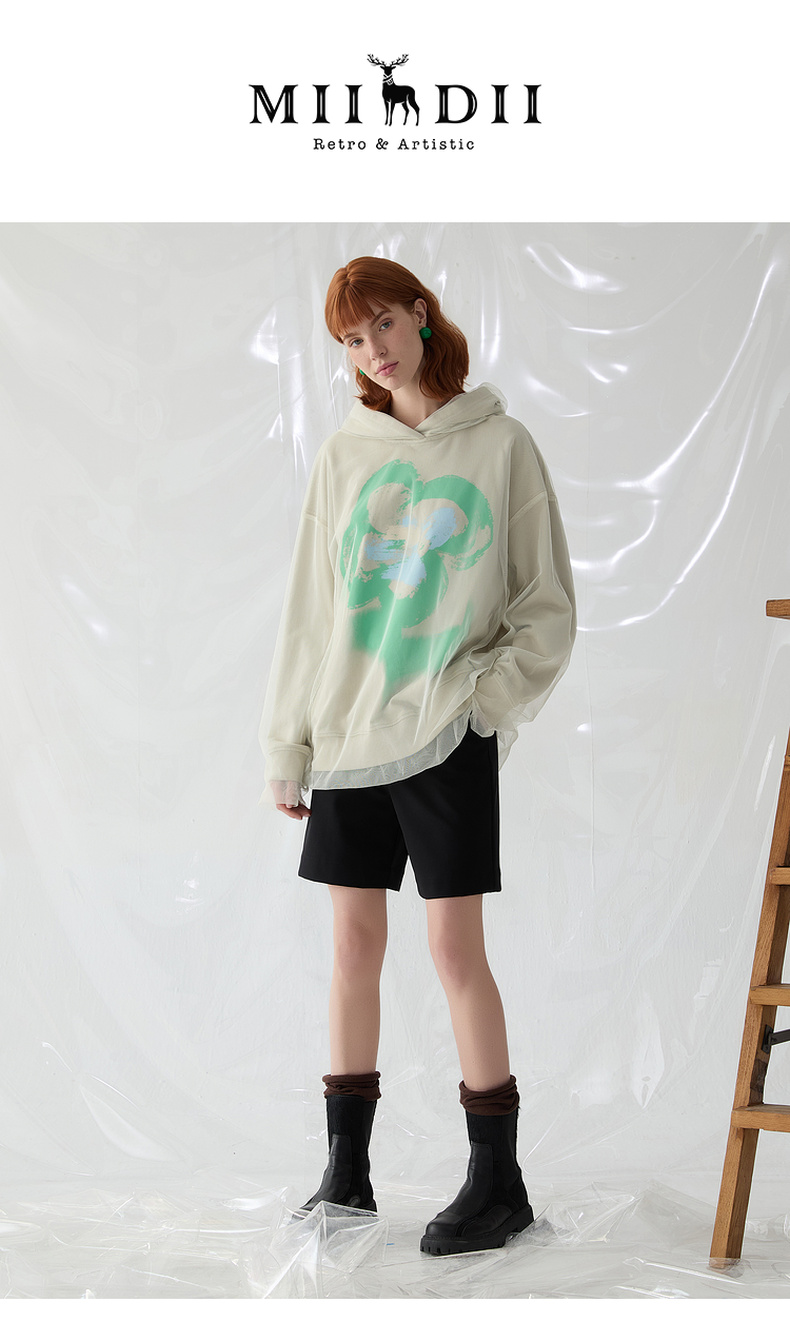 谜底连帽卫衣长袖女2025春新品双层拼接网纱设计感印花251MV0120