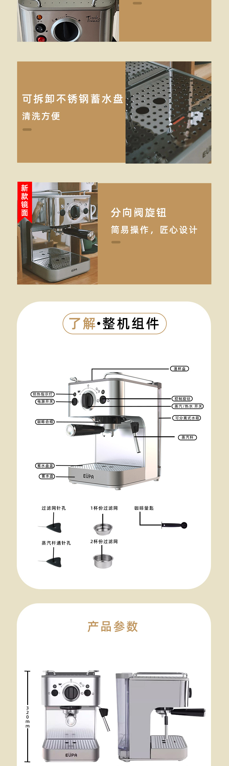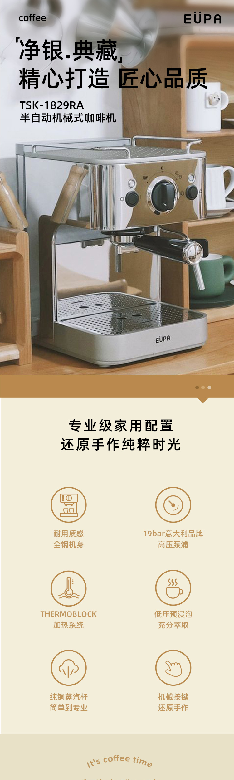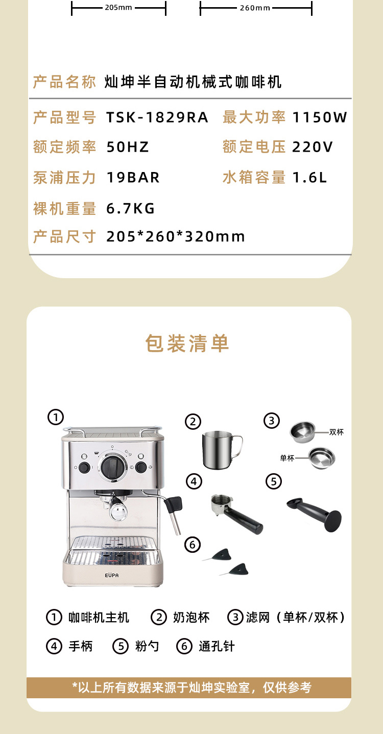 灿坤 咖啡机TSK-1829A泵浦式高压咖啡机半自动意式浓缩小钢炮全钢机可露营EUPA