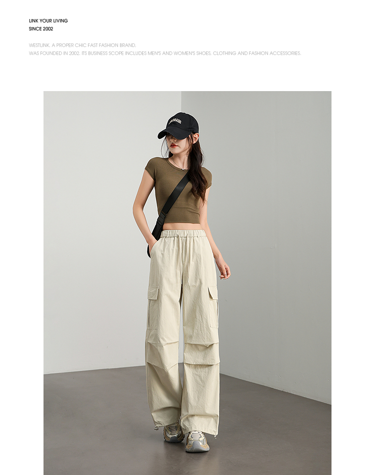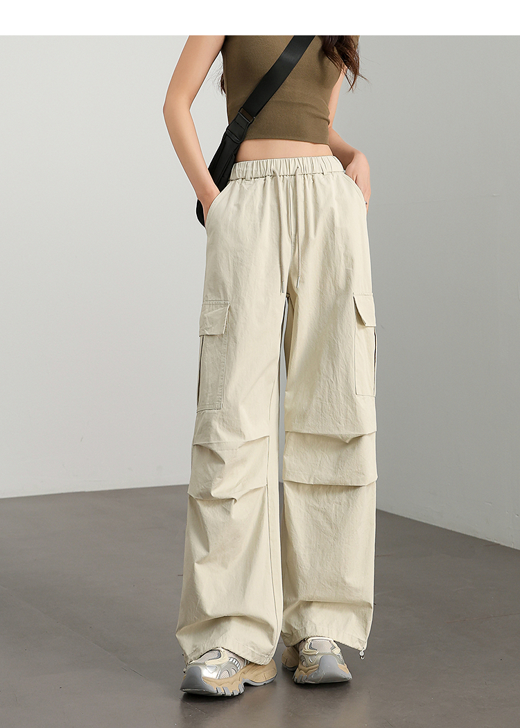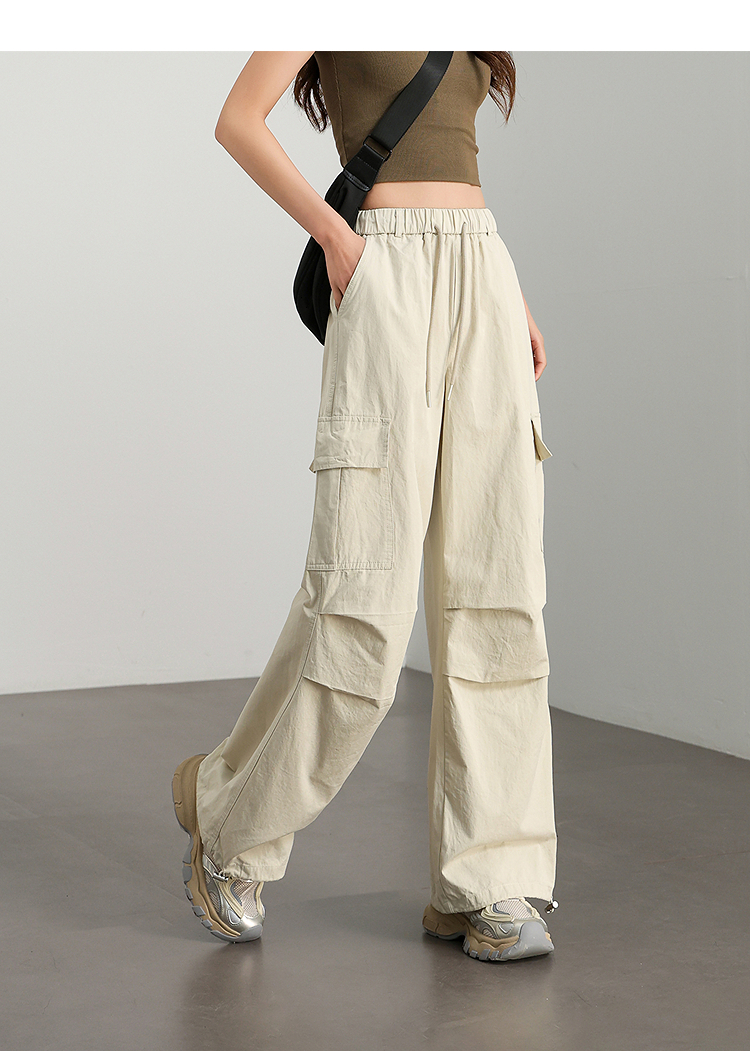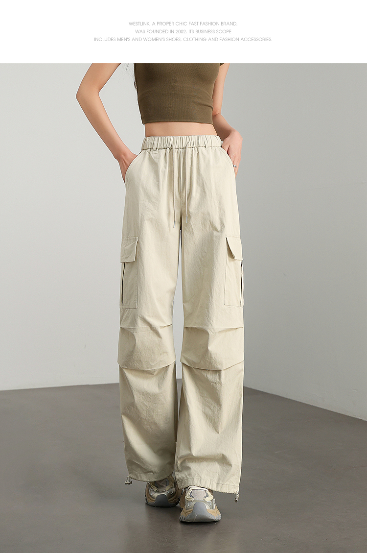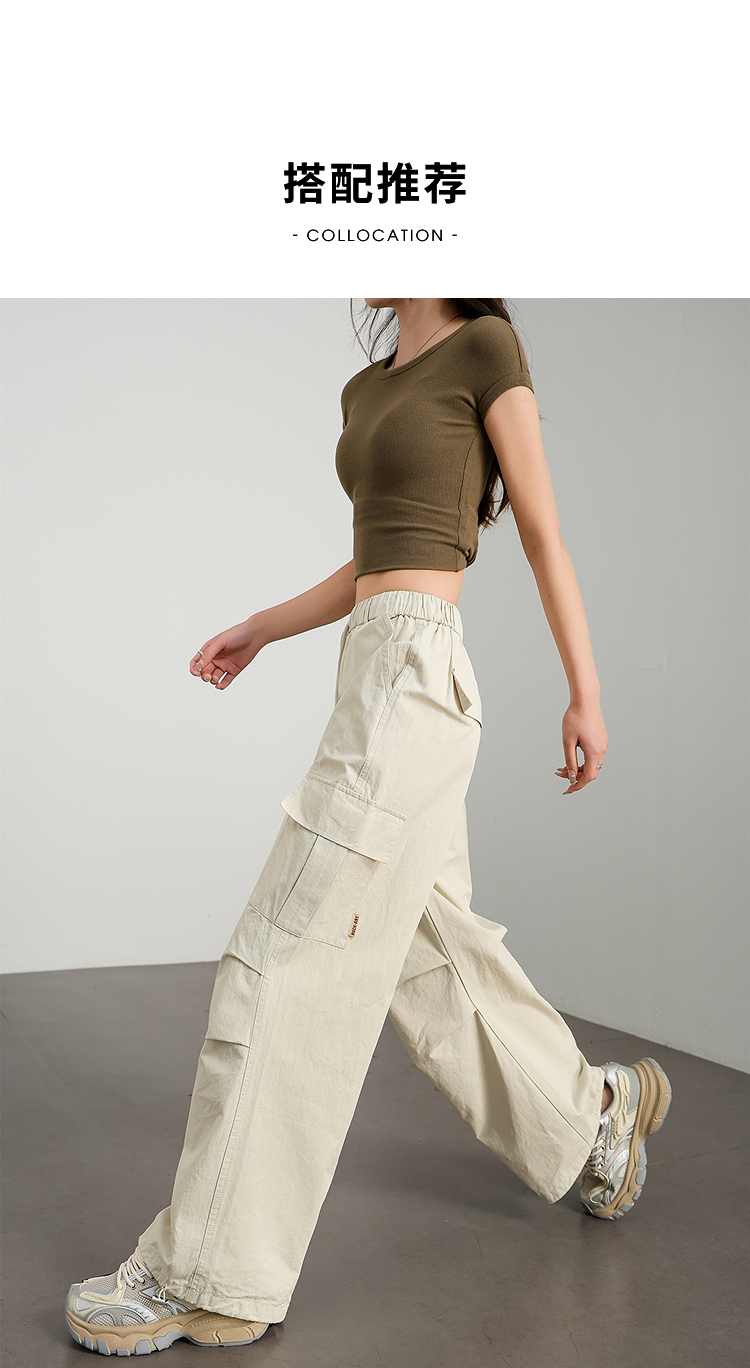 西遇白色工装裤女新款松紧腰美式酷飒风高腰直筒休闲裤D0050454