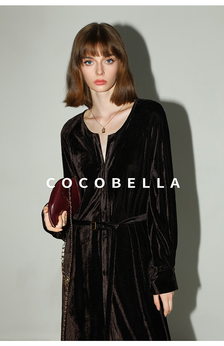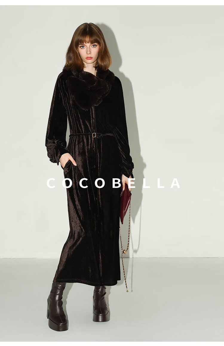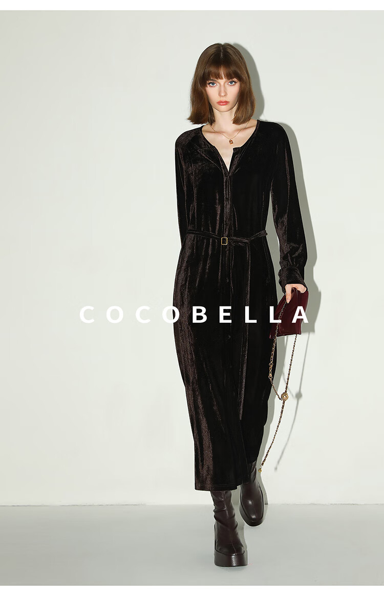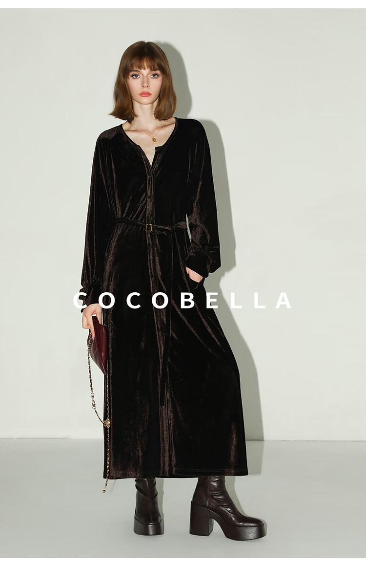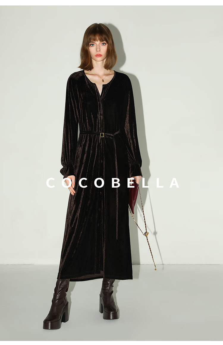 COCOBELLA静奢风丰盈天鹅绒长袖连衣裙质感丝绒礼服裙FR7088