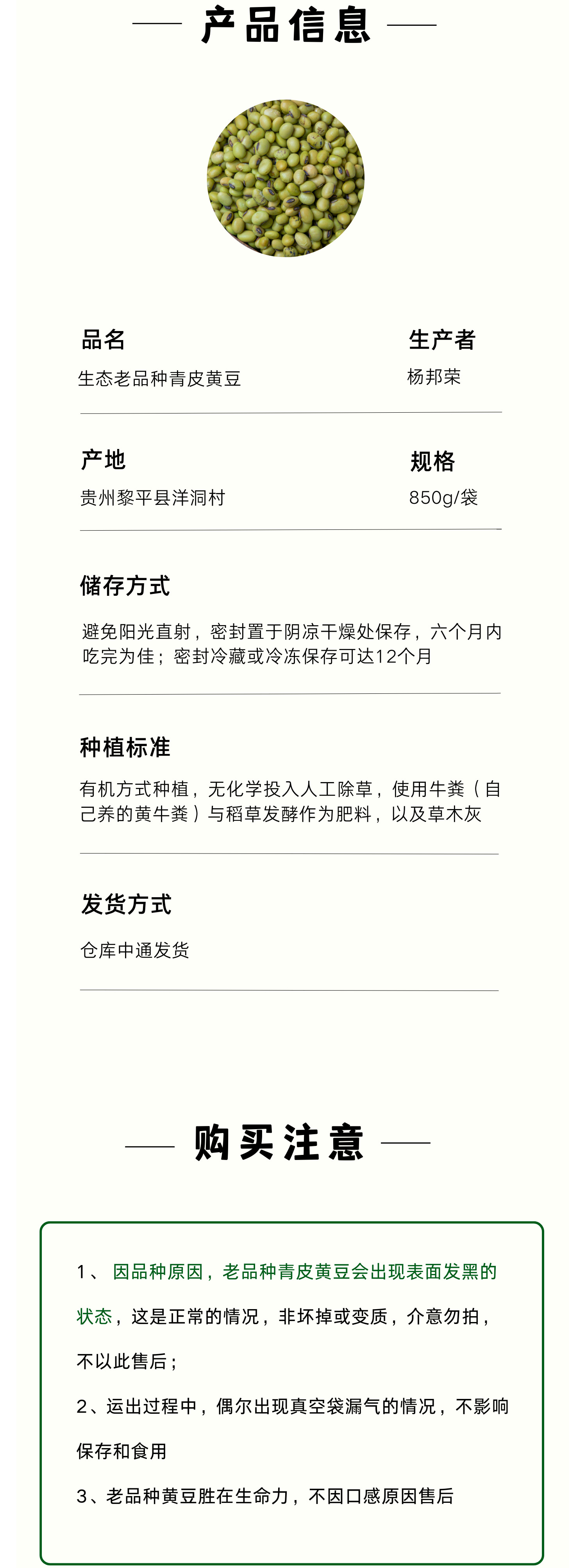 【2025年新豆】生态老品种青皮黄豆 850g/袋 | 合作农友生产,来自贵州黎平洋洞,生产者:杨邦荣 &【公平贸易农人定价】