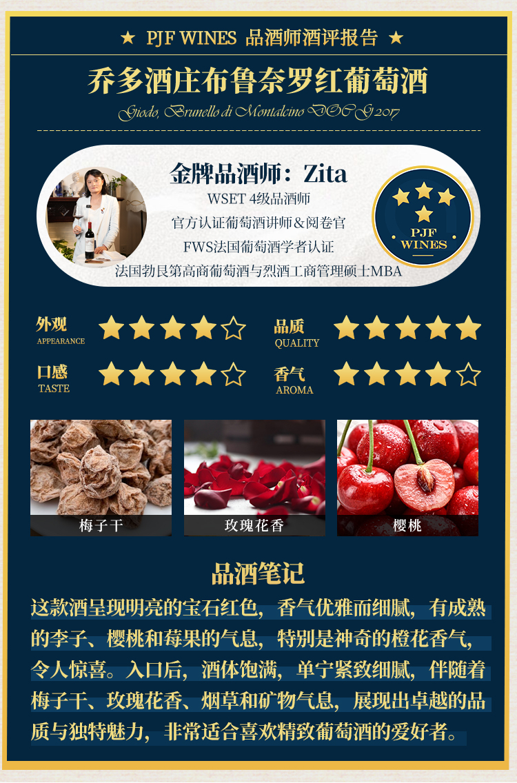 这是一款来自意大利托斯卡纳产区的红葡萄酒,采用桑娇维塞酿造而成。酿制过程中,该酒经历了30个月的法国橡木桶陈酿,而后进行了18个月的瓶中陈年后再上市发售,成酒散发出李子、樱桃、蓝莓和橙花的香气,伴以香脂、烟草和燧石的气息。这款酒口感饱满,单宁细腻,风格典雅,富有深度,平衡感佳,余味经久不散。