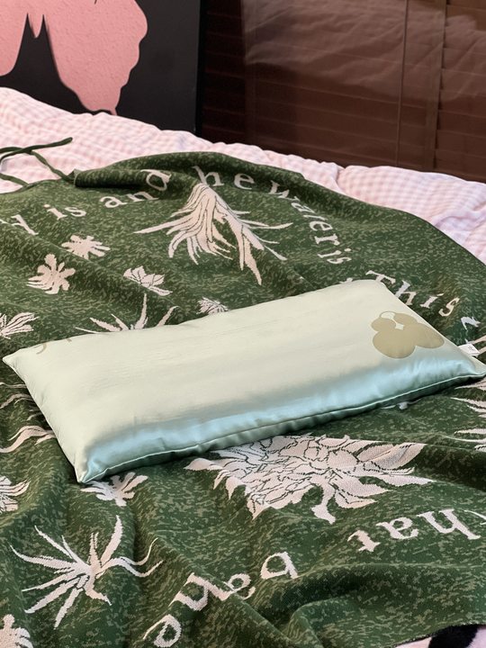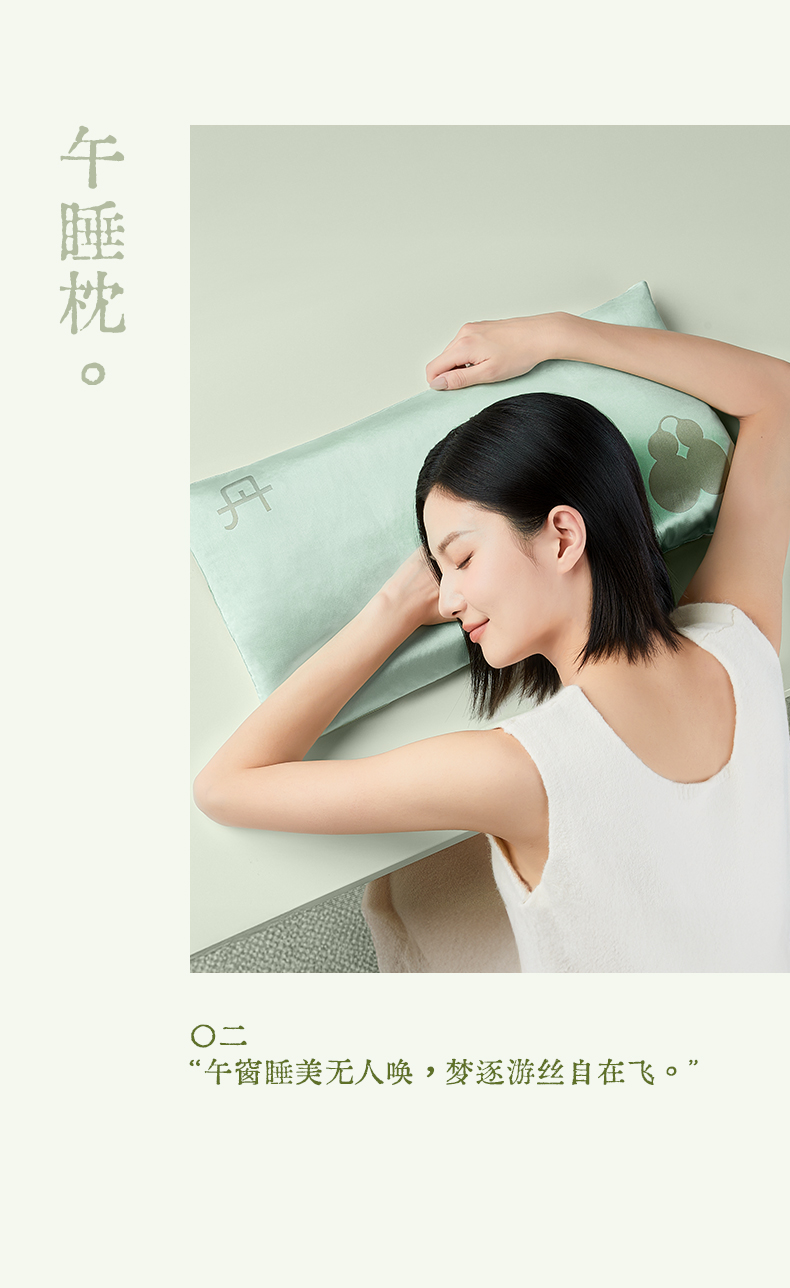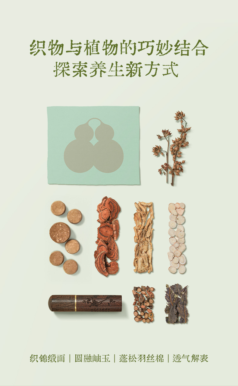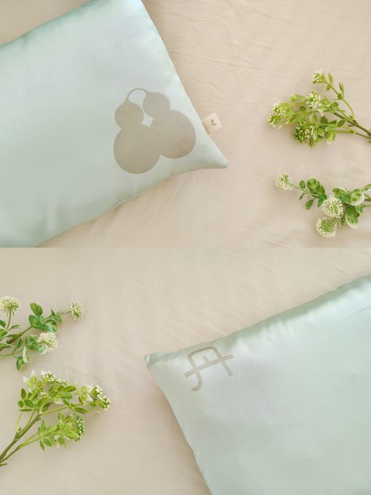 天青色织锦缎面料包裹着温润玉石和蓬松柔软的羽丝棉,再将决明子、紫苏等中草药嵌入内里,清火解气,让人在梦中进行一场养生美容觉。