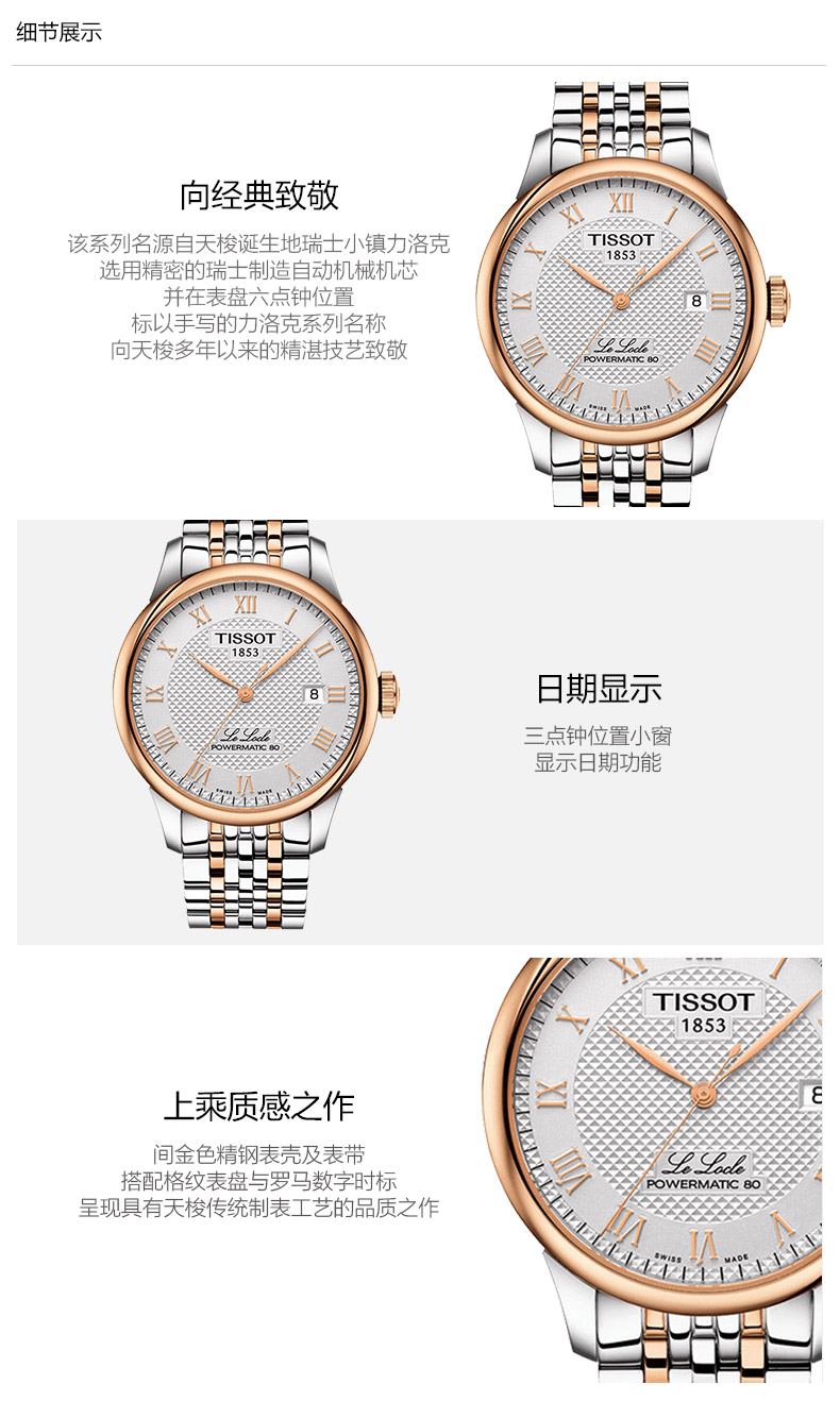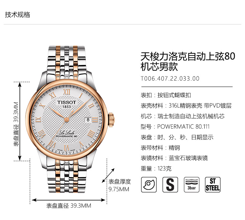 天梭Tissot力洛克系列80机芯机械男表银盘钢带 T006.407.22.033.00