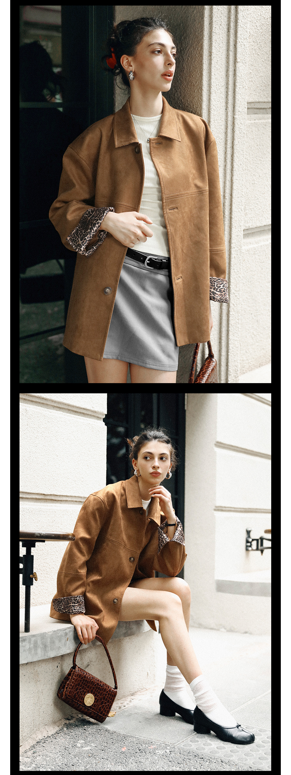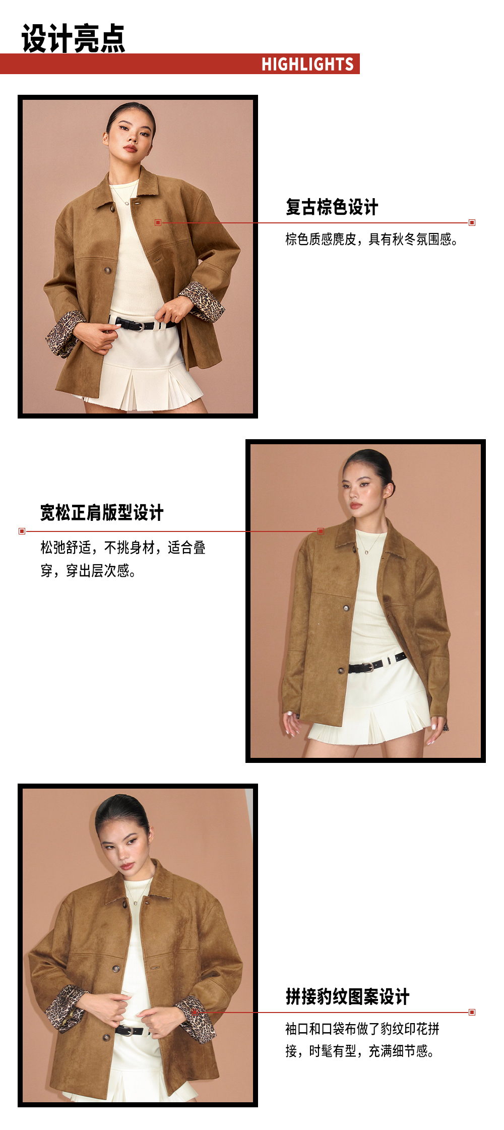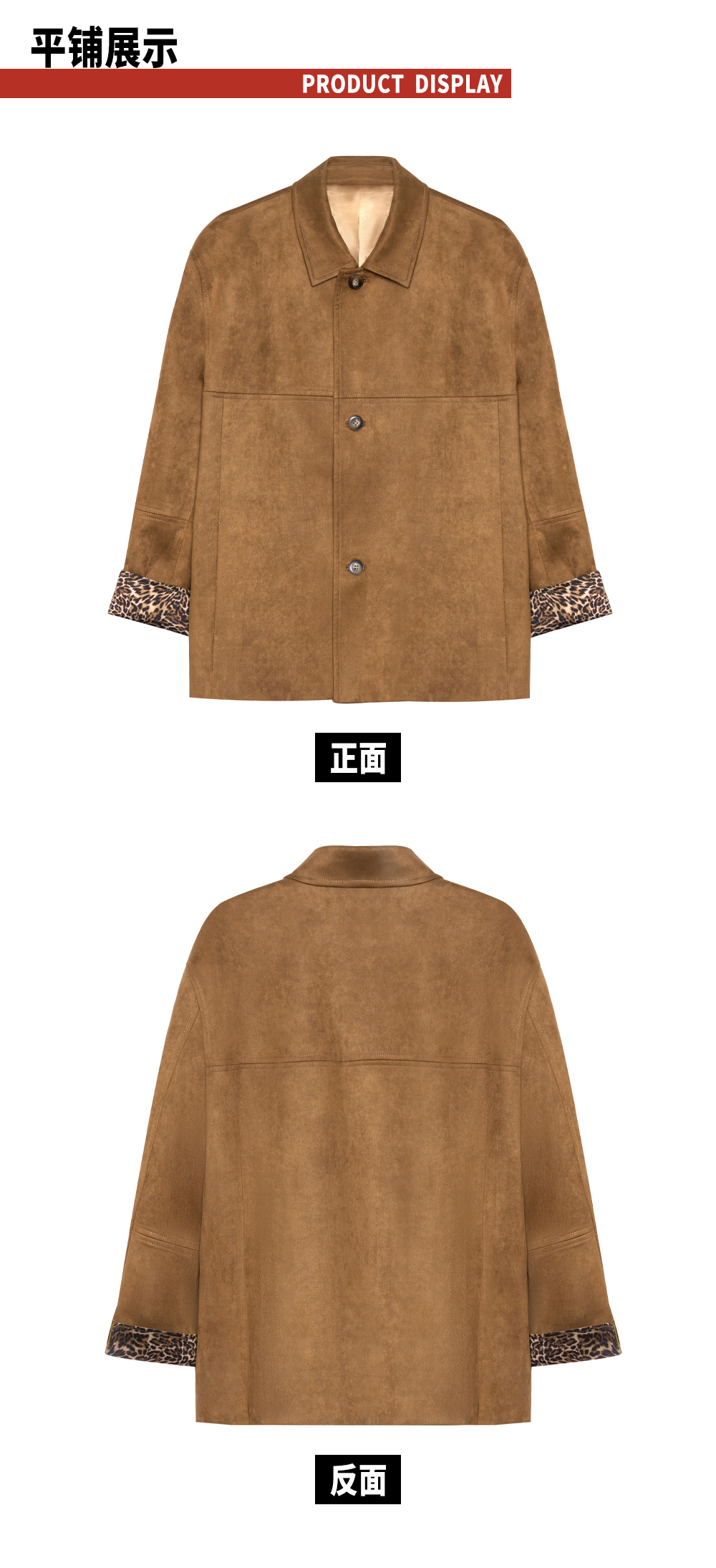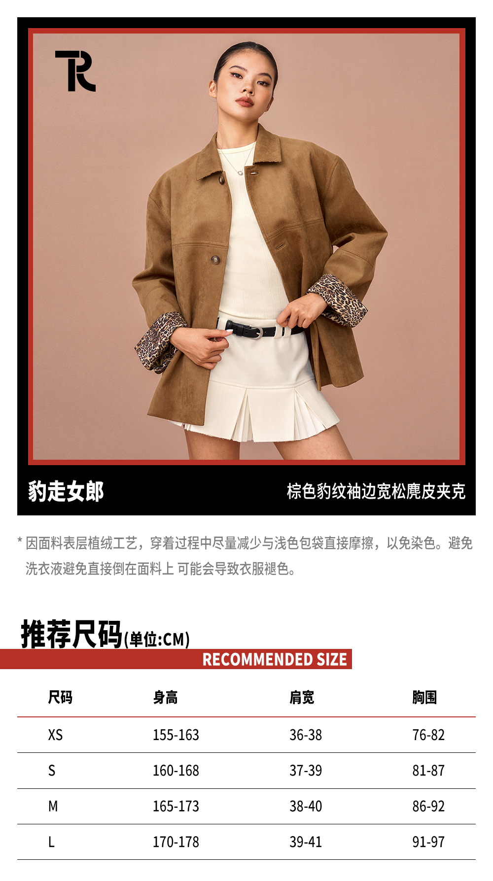 TR她热 豹走女郎 棕色麂皮绒质感拼接豹纹印花叠穿翻领廓形外套