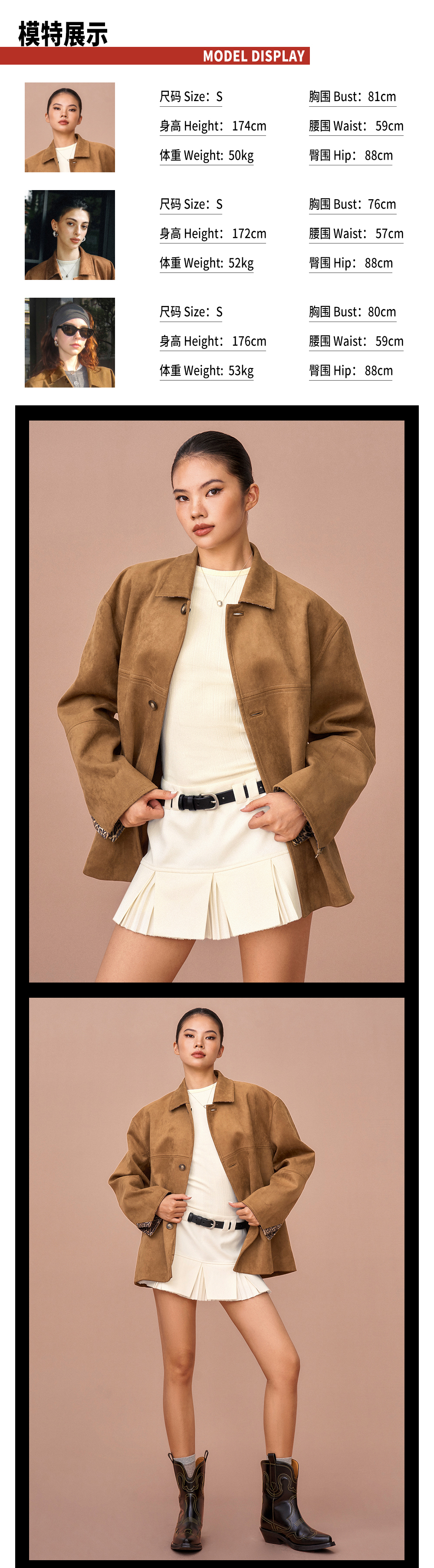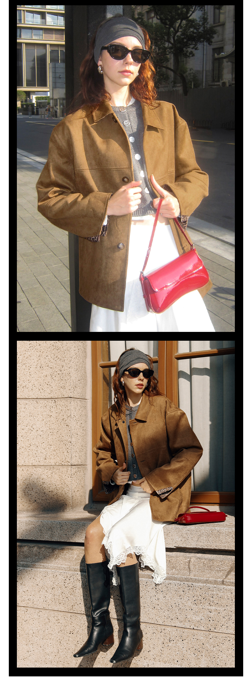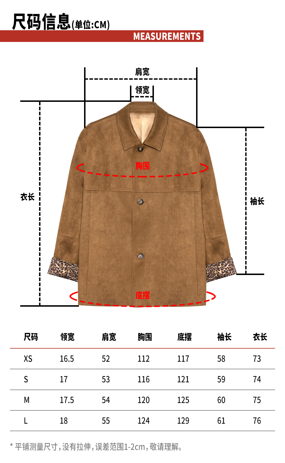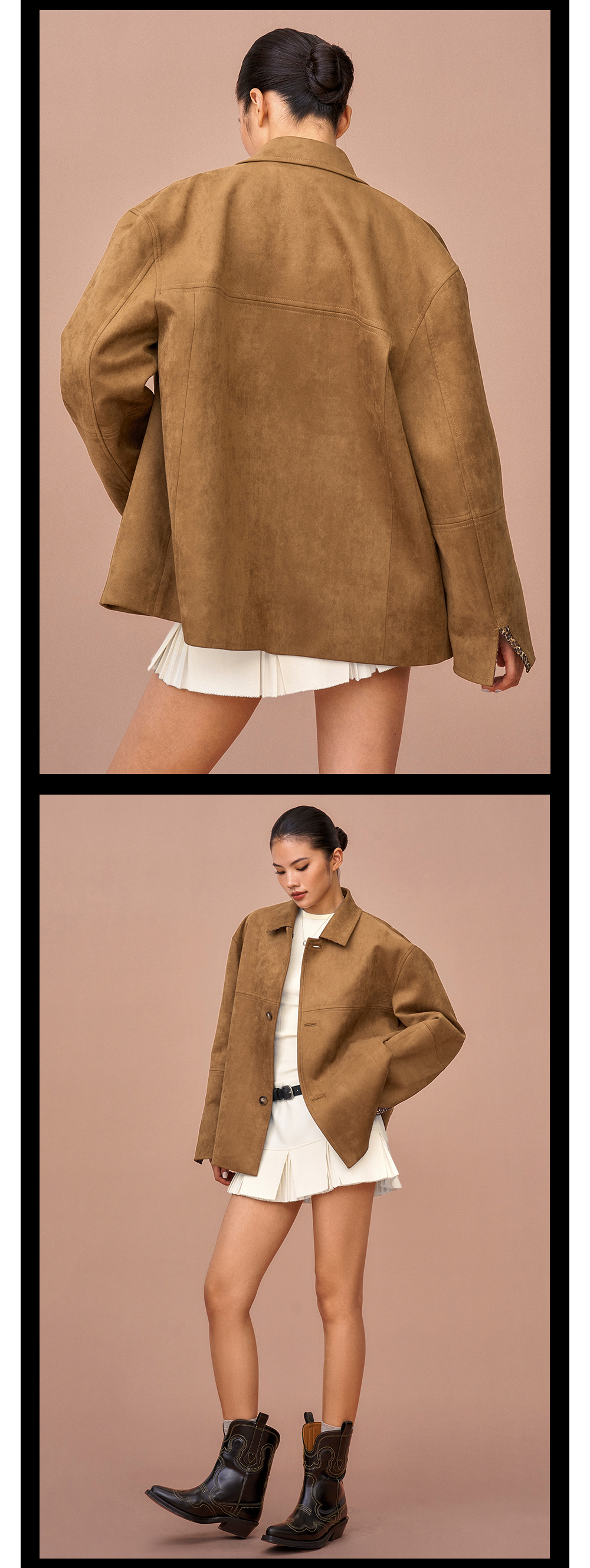 TR她热 豹走女郎 棕色麂皮绒质感拼接豹纹印花叠穿翻领廓形外套