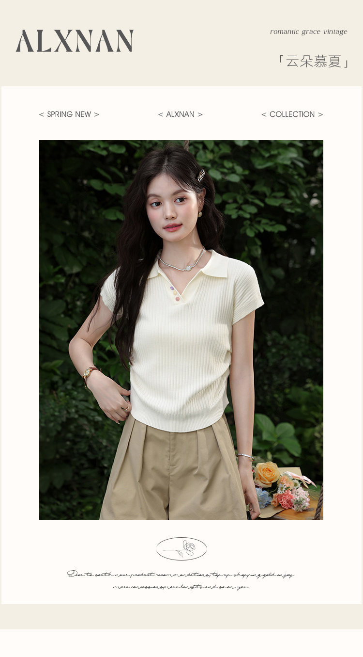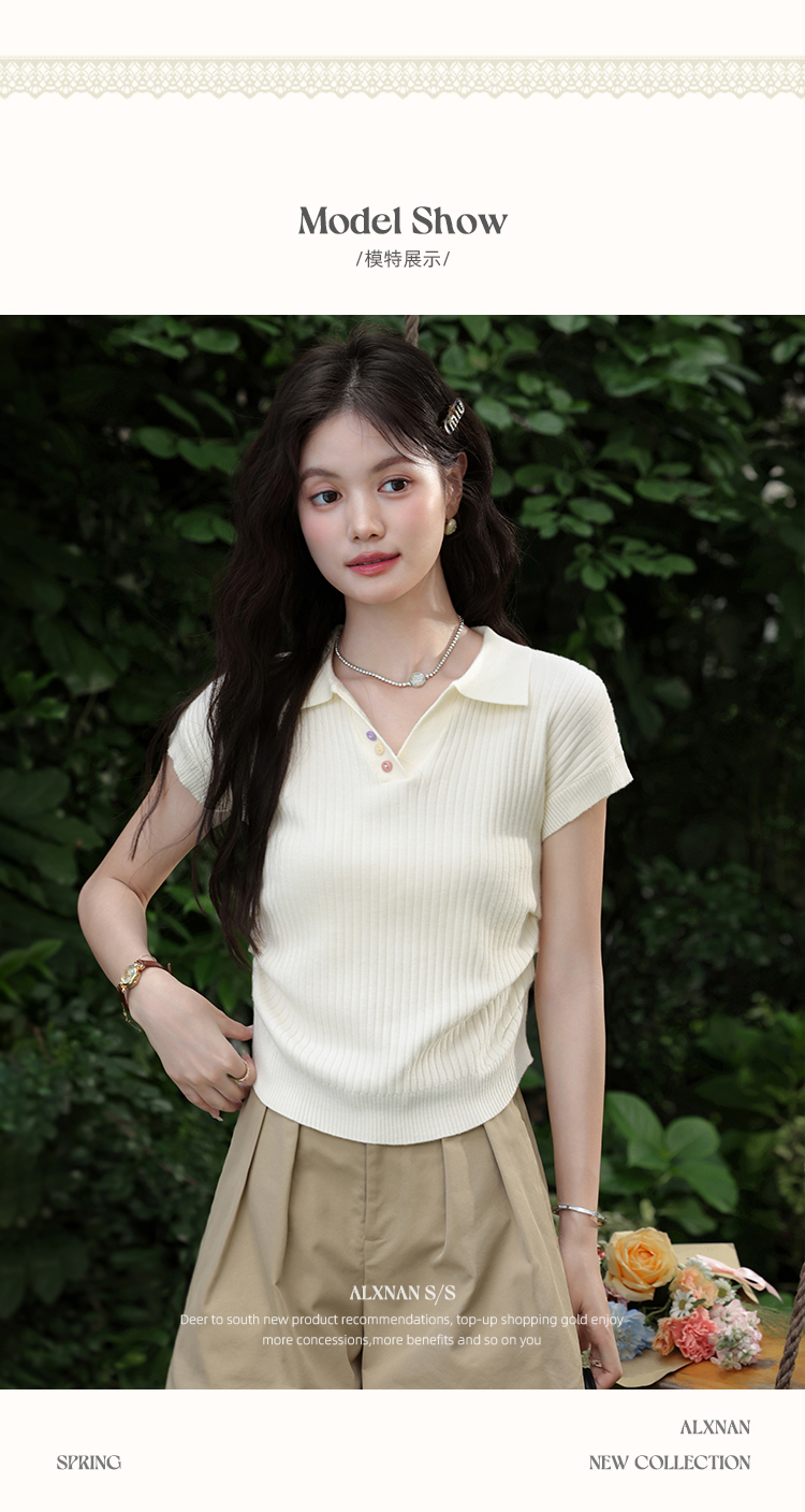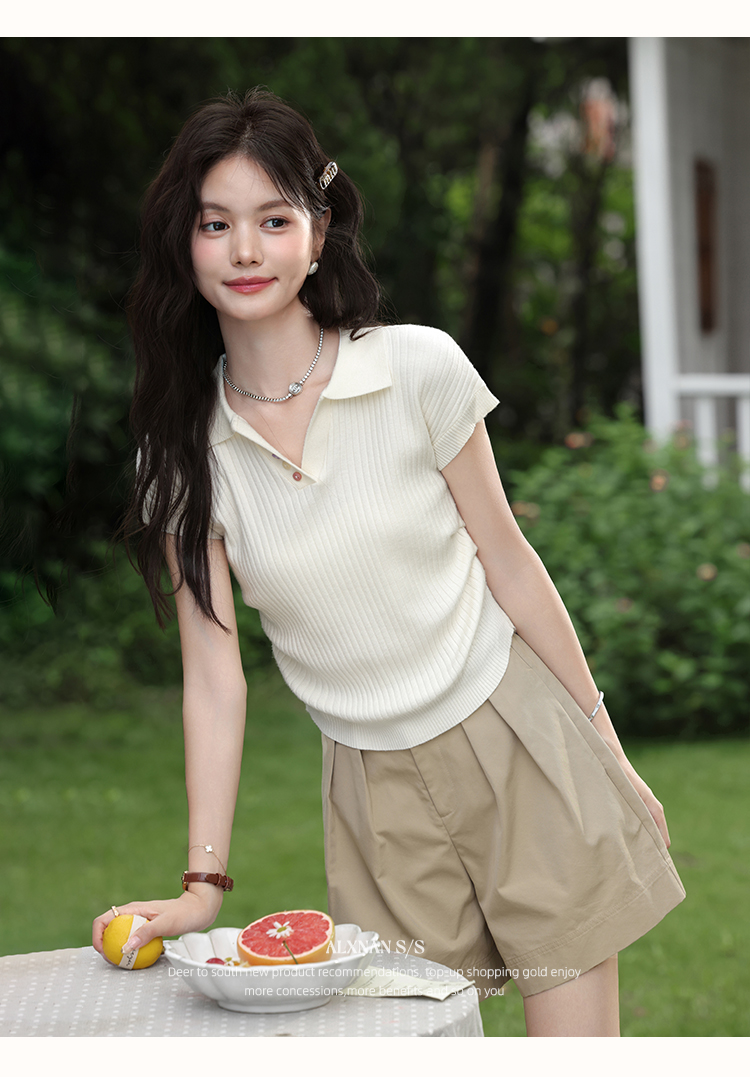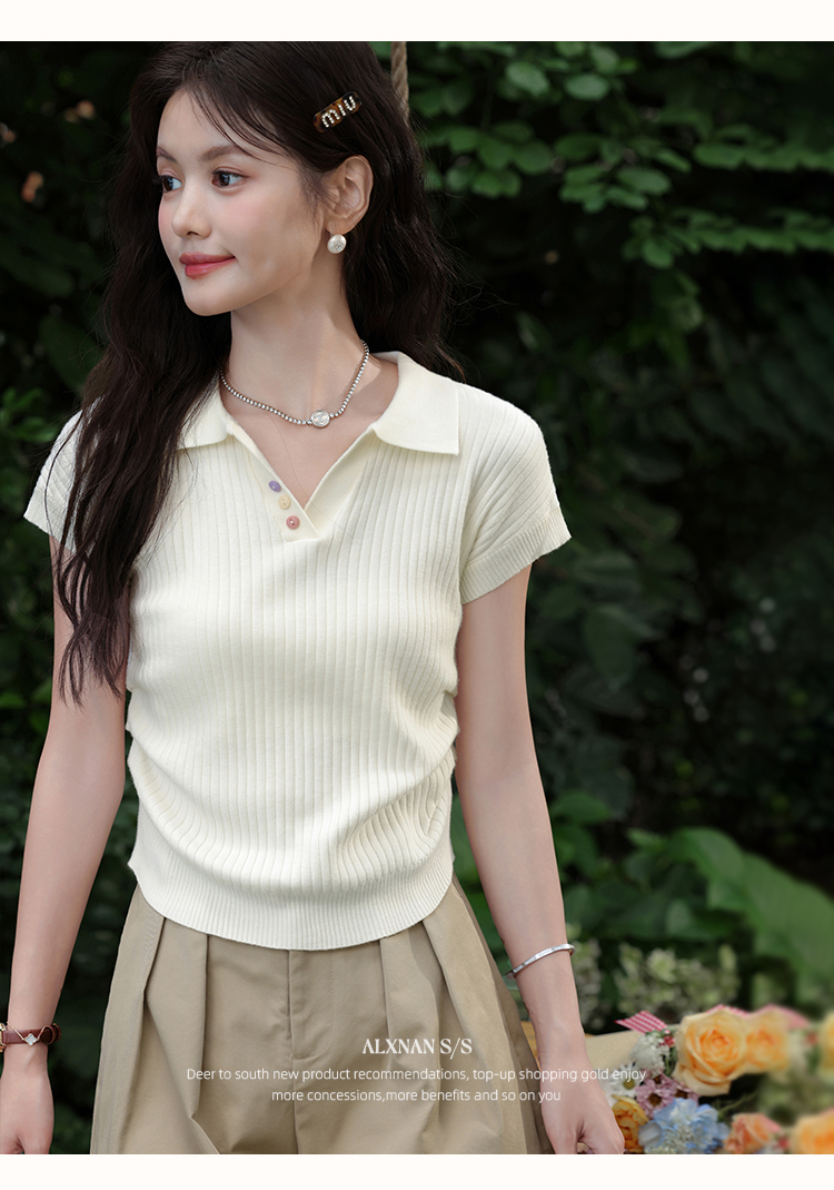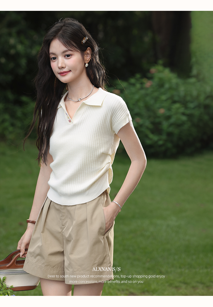 鹿向南「云朵慕夏」杏色翻领短袖T恤女夏季新款收腰气质针织上衣