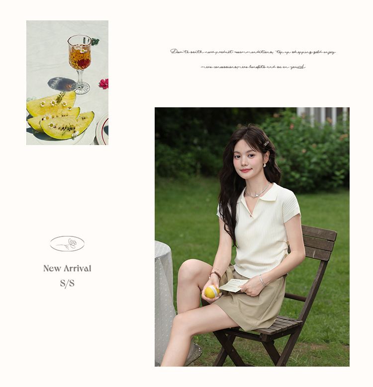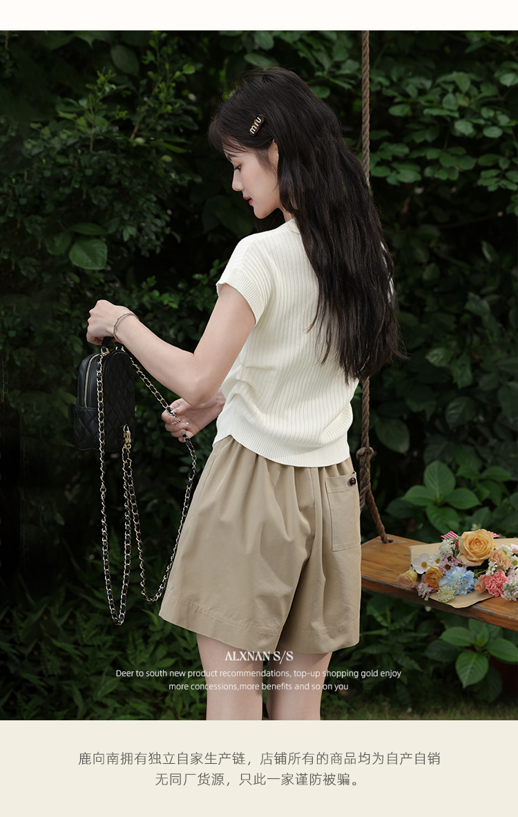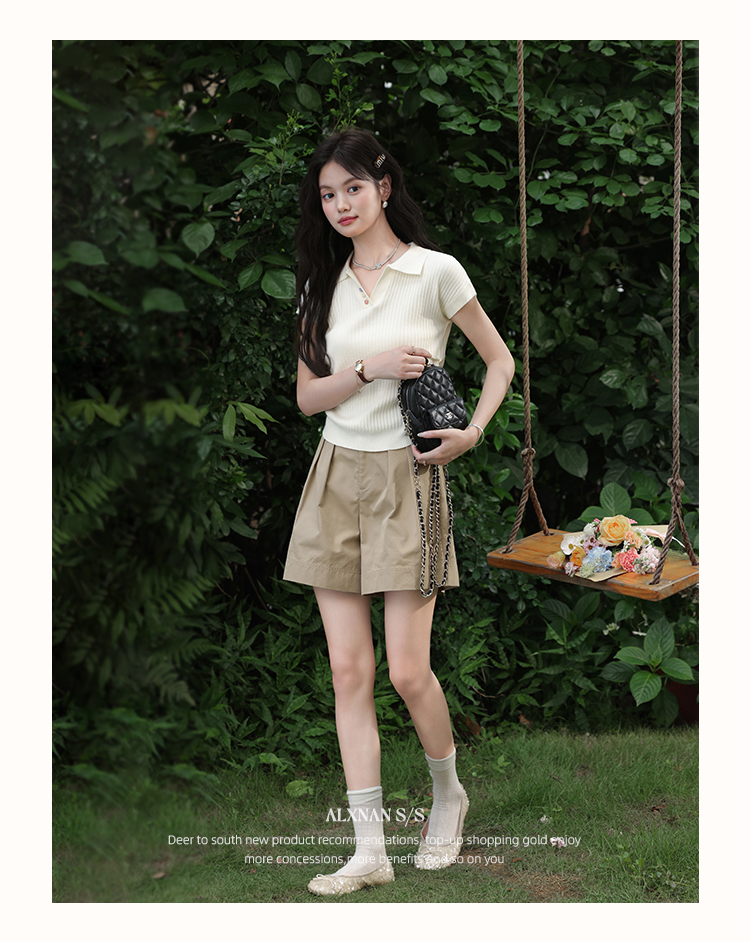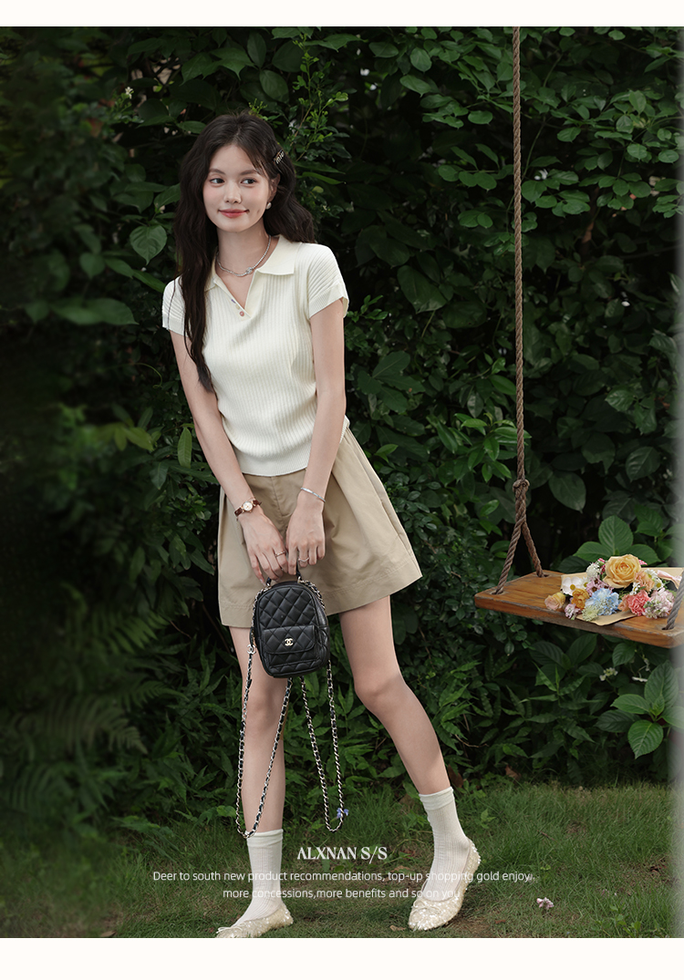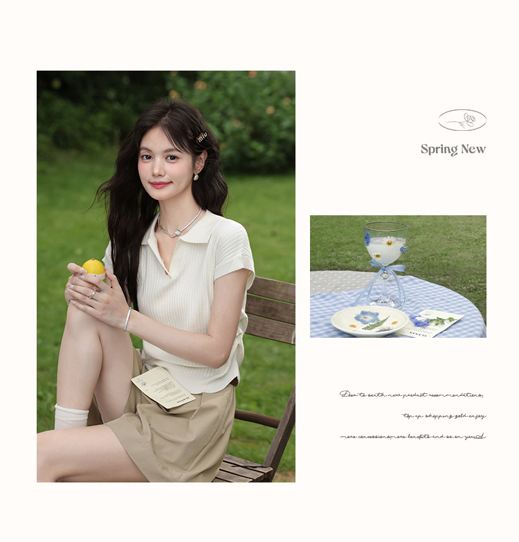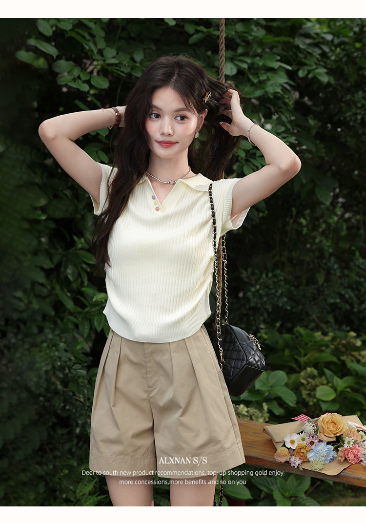 鹿向南「云朵慕夏」杏色翻领短袖T恤女夏季新款收腰气质针织上衣
