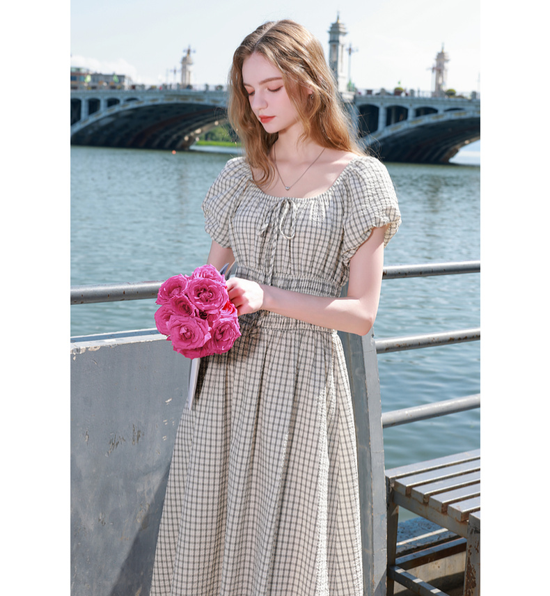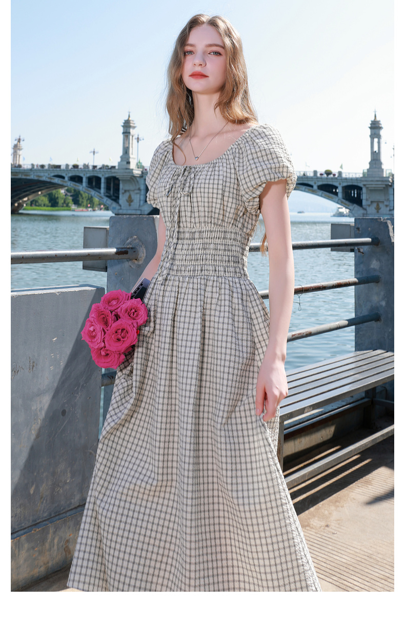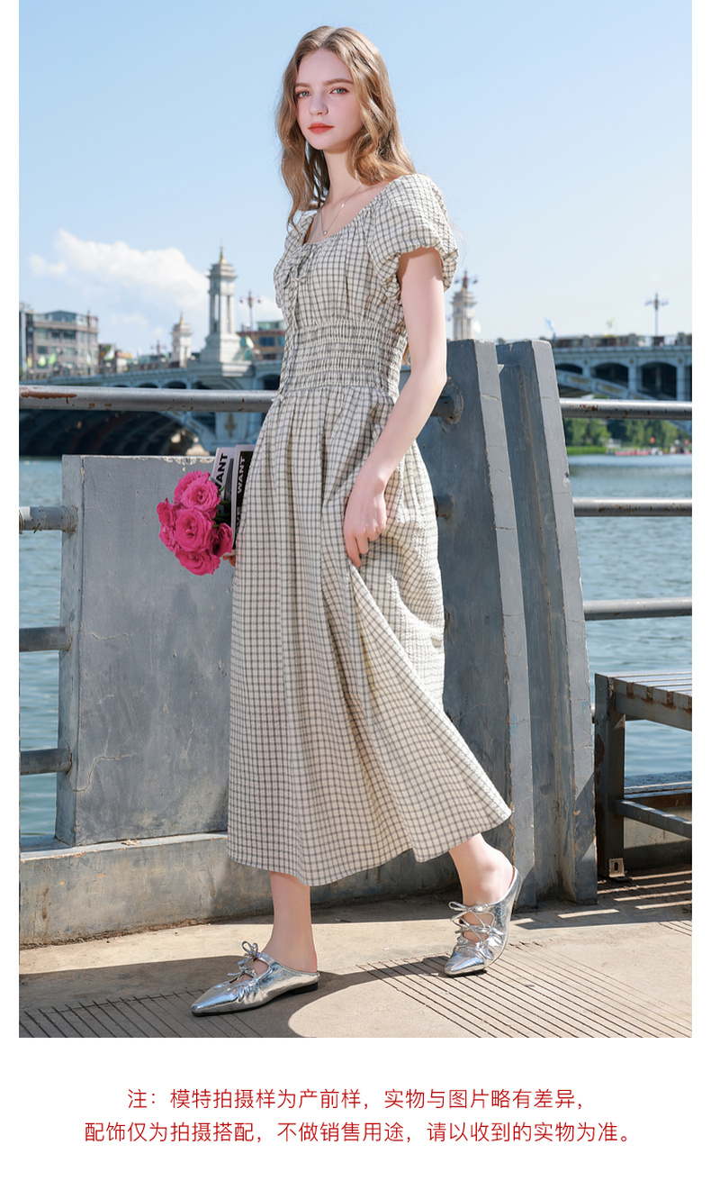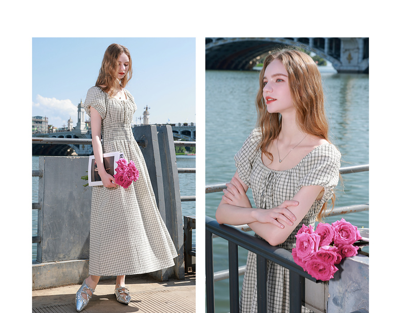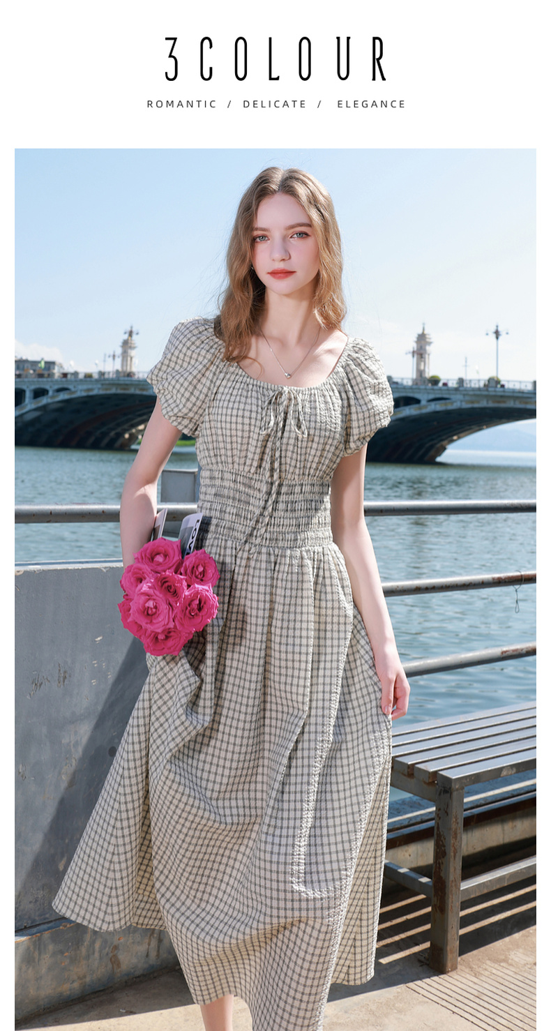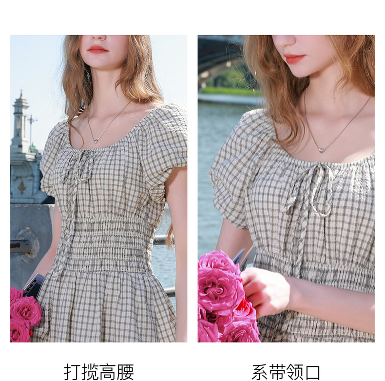 三彩2025秋季新款法式方领两穿格纹连衣裙高腰A字大摆长裙复古M