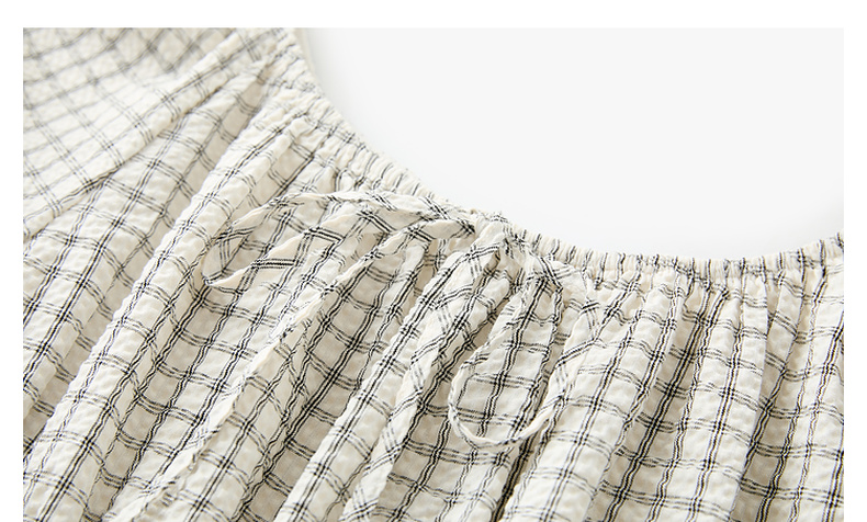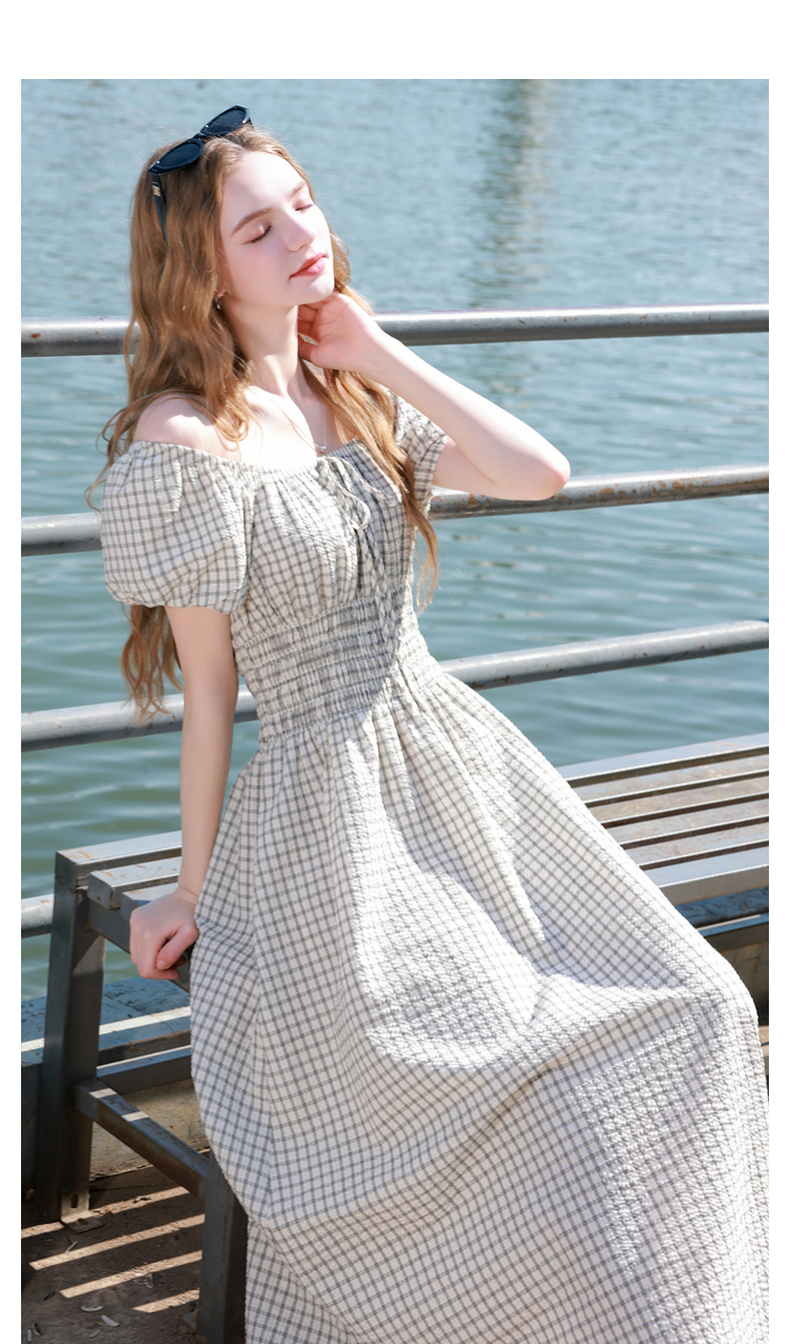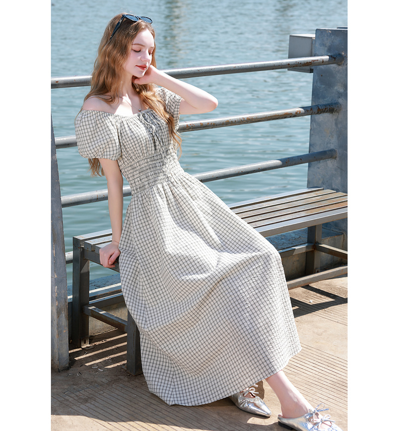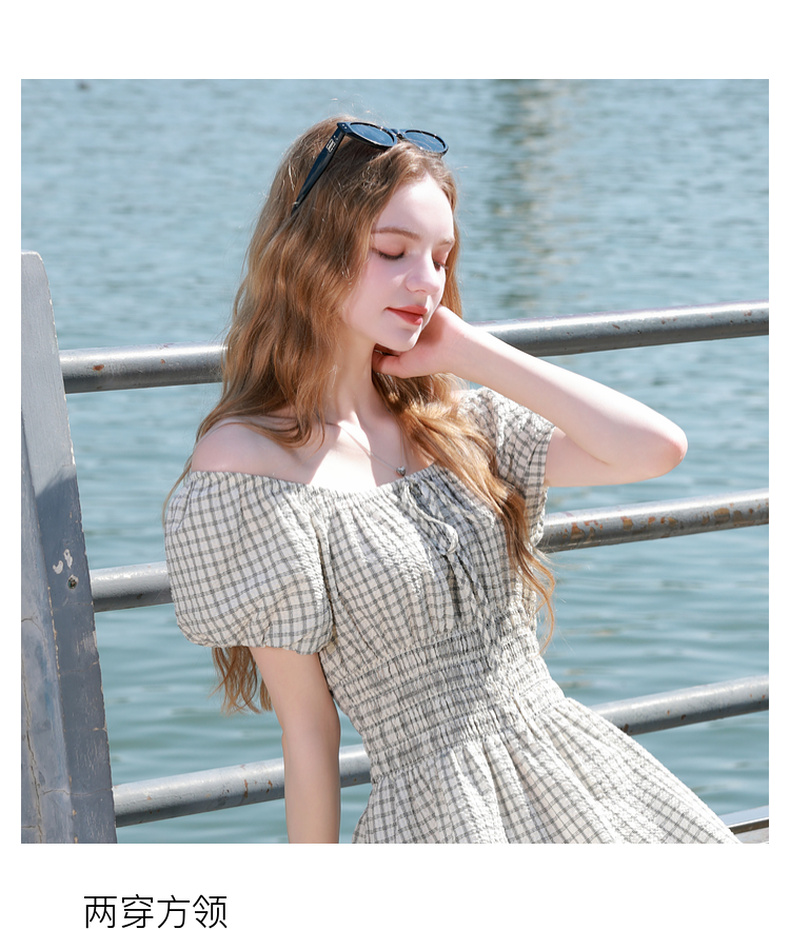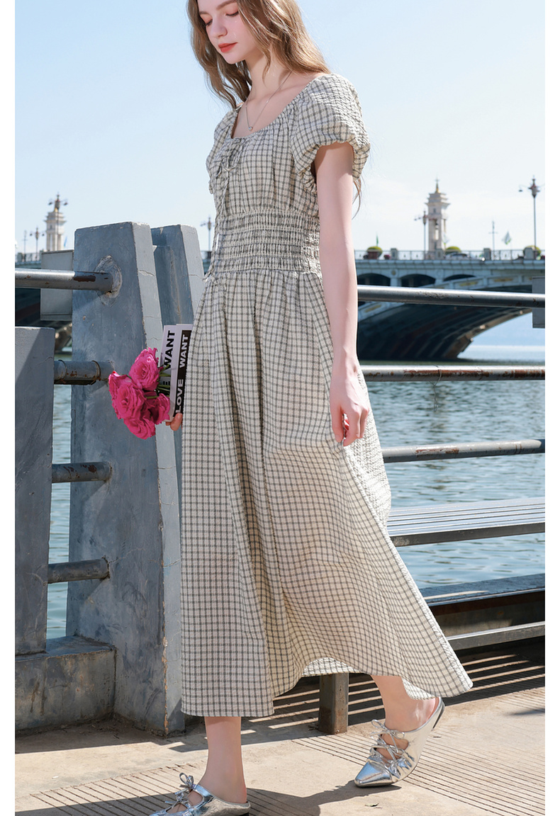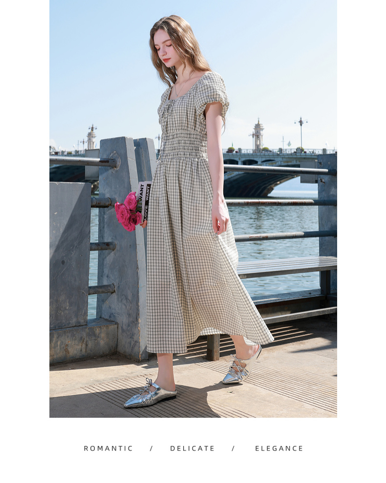 三彩2025秋季新款法式方领两穿格纹连衣裙高腰A字大摆长裙复古M