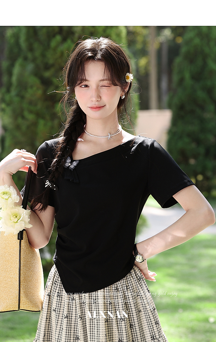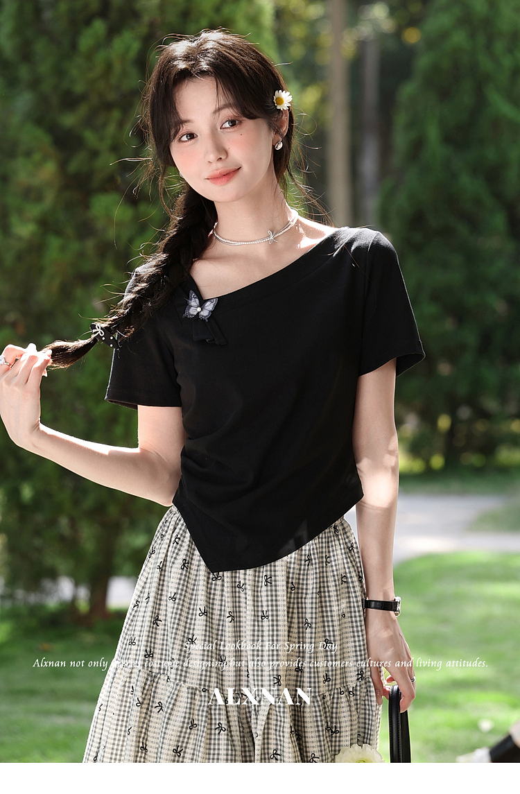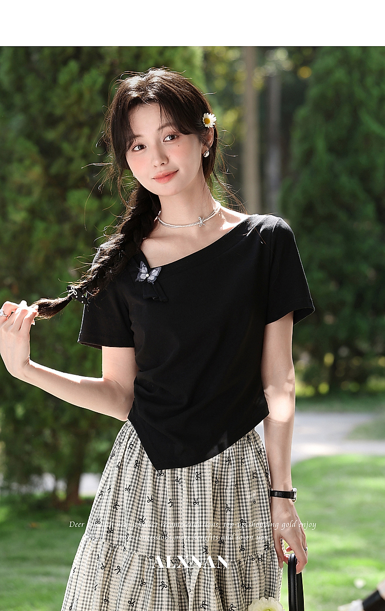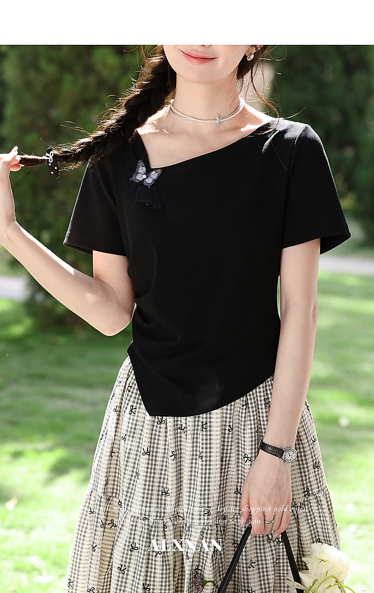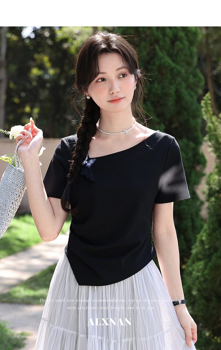 鹿向南「温柔蝶序」黑色斜肩领显瘦短袖T恤女夏季不规则小众上衣