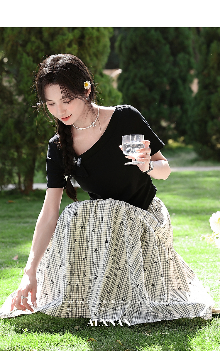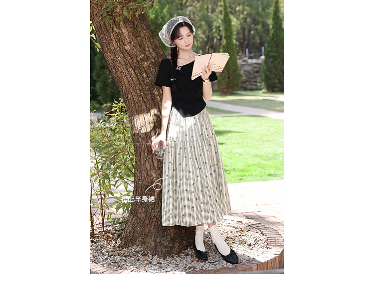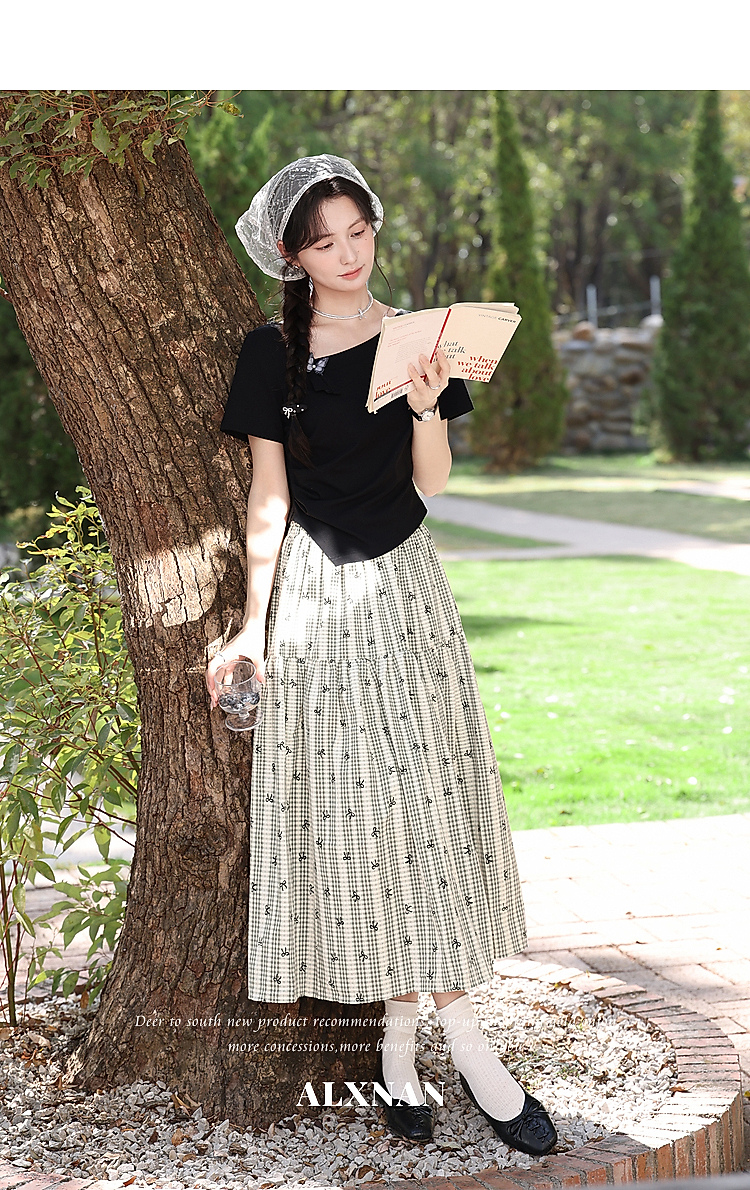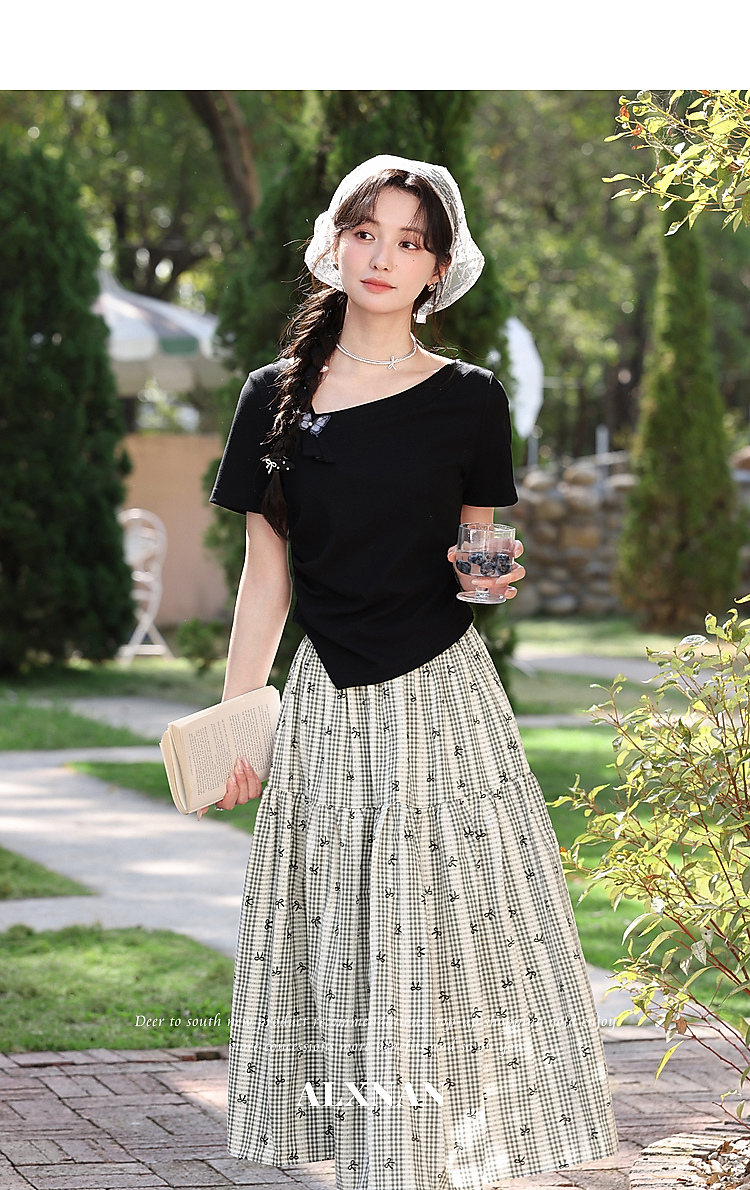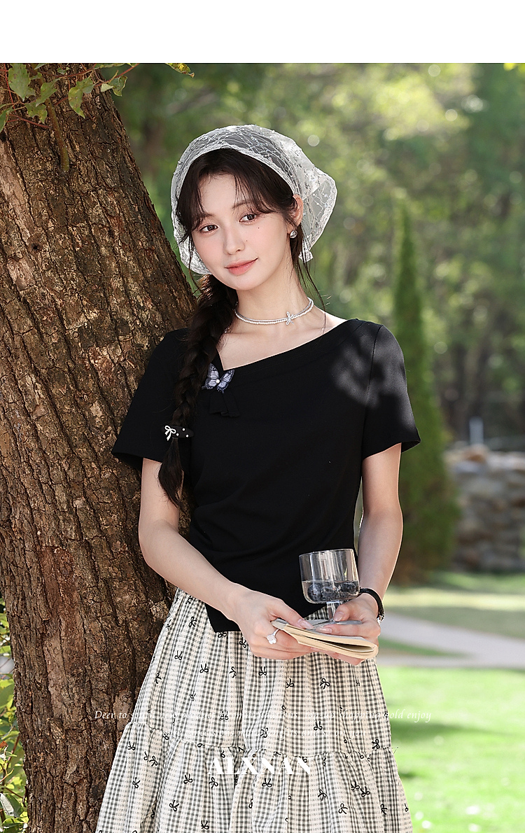 鹿向南「温柔蝶序」黑色斜肩领显瘦短袖T恤女夏季不规则小众上衣